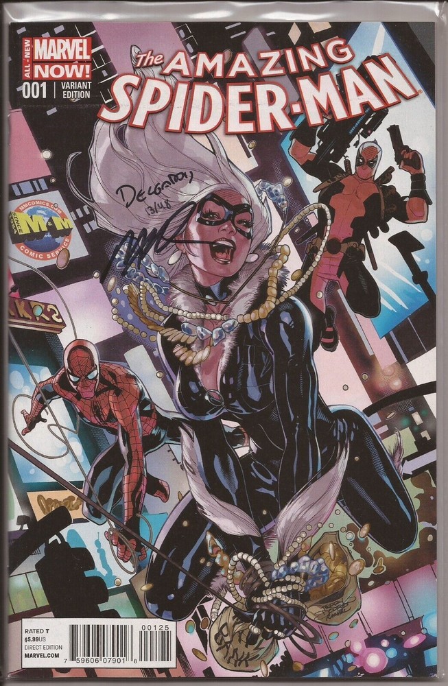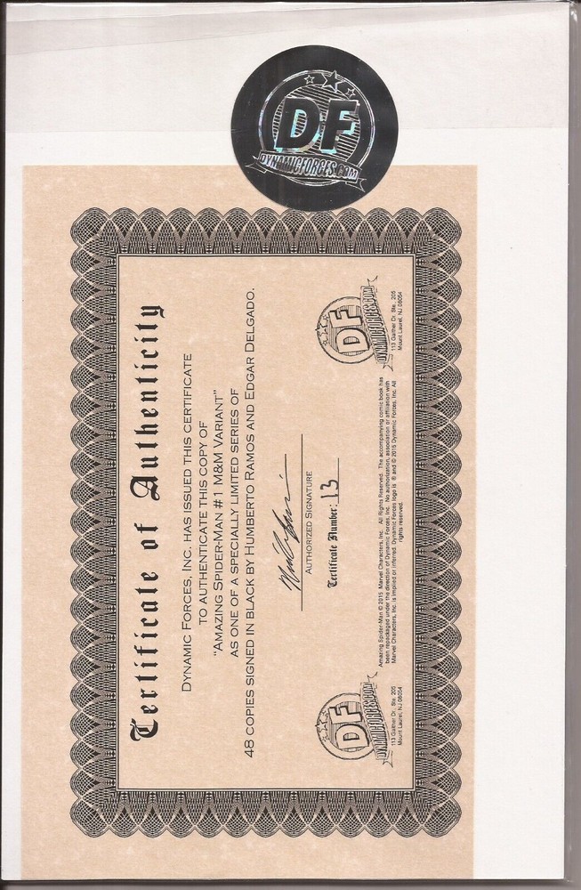 M& M COMICS VARIANT SIGNED BY HUMBERTO RAMOS AND EDGAR DELGADO WITH NUMBERED DYNAMIC FORCES CERIFICATE OF AUTHENTICITY - LIMITED TO 48 COPIES WITH COA #13/48 INCLUDED! This Amazing Spider-Man #1 comic book features variant cover art by Terry Dodson and is signed by artists Edgar Delgado and Humberto Ramos. The single unit is a must-have for fans of Marvel's MCU and Spider-Man universe. The issue number 1 comic book is in English and published by Marvel Comics in 2014. This item includes certificates of authenticity (COA), dust jacket, and is boarded for protection. The personalized comic book is numbered 13/48 and features Charles Soule, Peter David, Dan Slott, Christos N. Gage, Christopher Yost, and Joe Caramagna as the artist/writer team. The superhero team is Avengers and the characters include Deadpool, Spider-Man, and Black Cat. The Intended Audience and Era are General Audience and Modern Age (1992-Now), respectively.