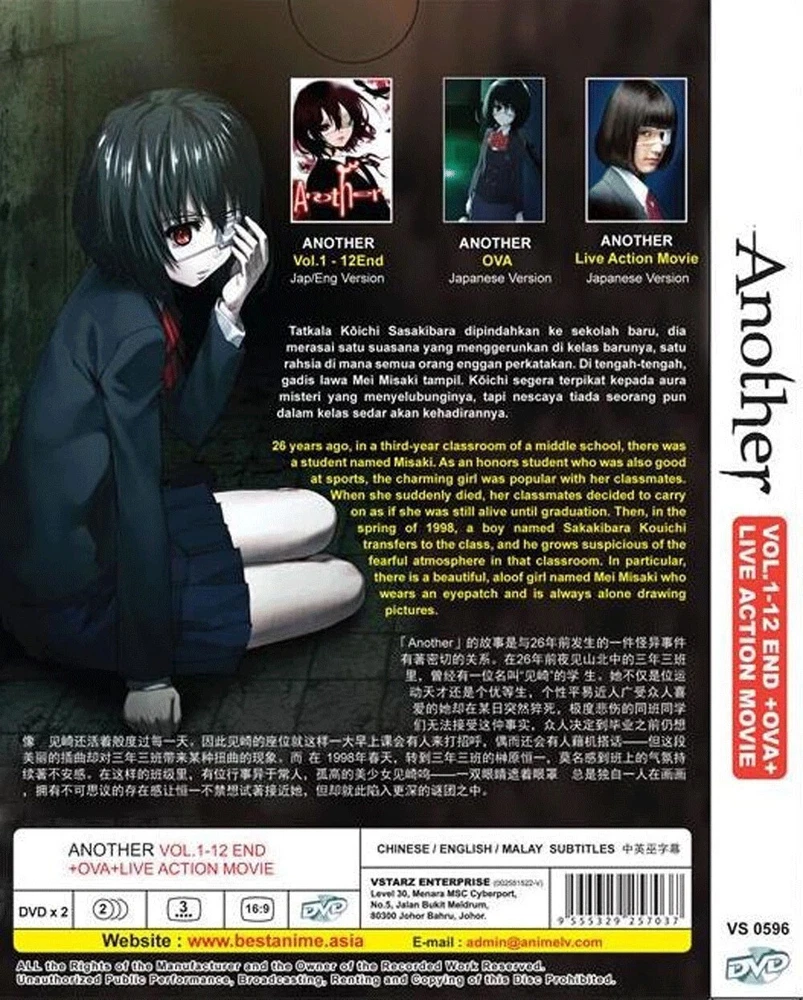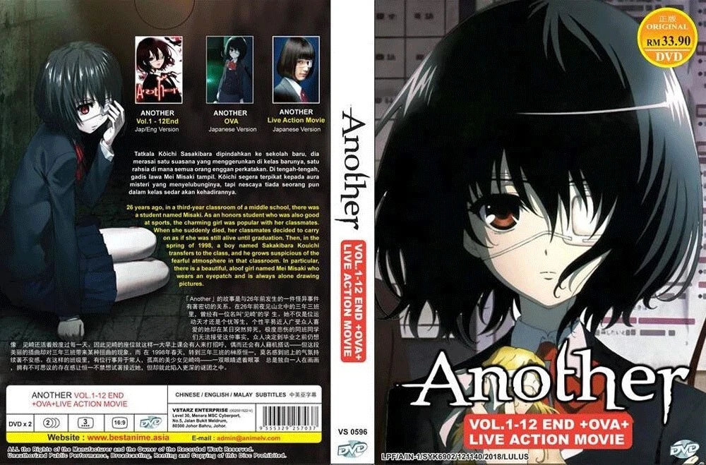 TITLE : ANOTHER - COMPLETE TV SERIES * ENGLISH DUBBED * DESCRIPTION No of Disc : 2 No of Episode : 1 - 12 End + OVA + Live Action Movie Language : TV Series : Japanese / English OVA + Live Action Movie : Japanese Subtitle : English / Chinese Format : DVD / NTSC & All Region Code (16.9) WE SELLING ALL ORIGINAL PRODUCT AND SIRIM MALAYSIA APPROVE BY GOV DEPARTMENT Shipping Time Tracking Number Provided To Track Your Shipment Delivery 10 to 18 Days Without Sat & Sun Working Days Payment Paypal Accepted Contact US Any Problems Or Enquiries Please E-Mail US Thanks Feedback Should Any Problem Arise, Please E-Mail To Let US Know & We Will Do Our Best To Rectify Any Problems Return Within 14 Days No Questions, Ask Return. Buyer Will Need Pay Return Postage Thanks For Shopping Have a Nice Days