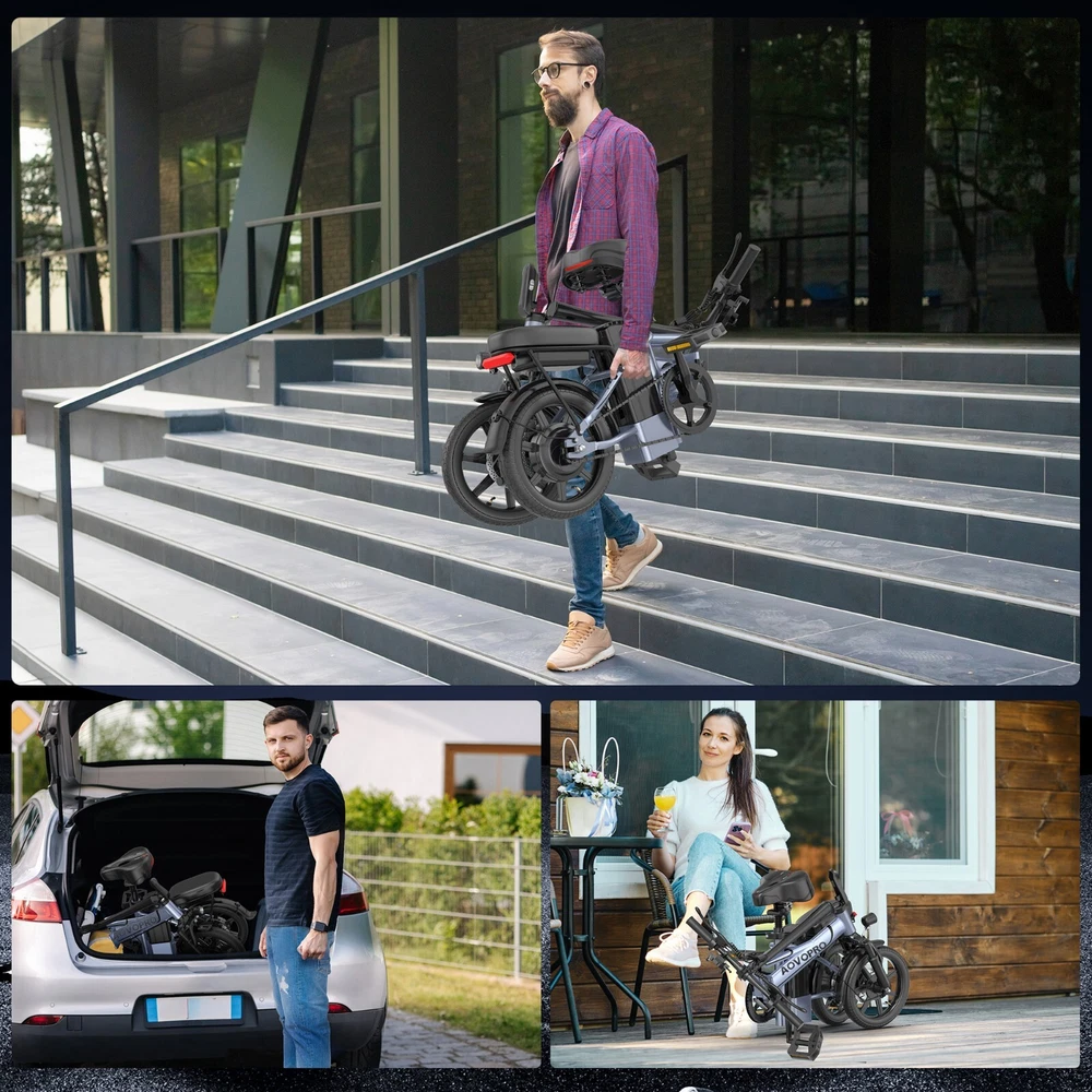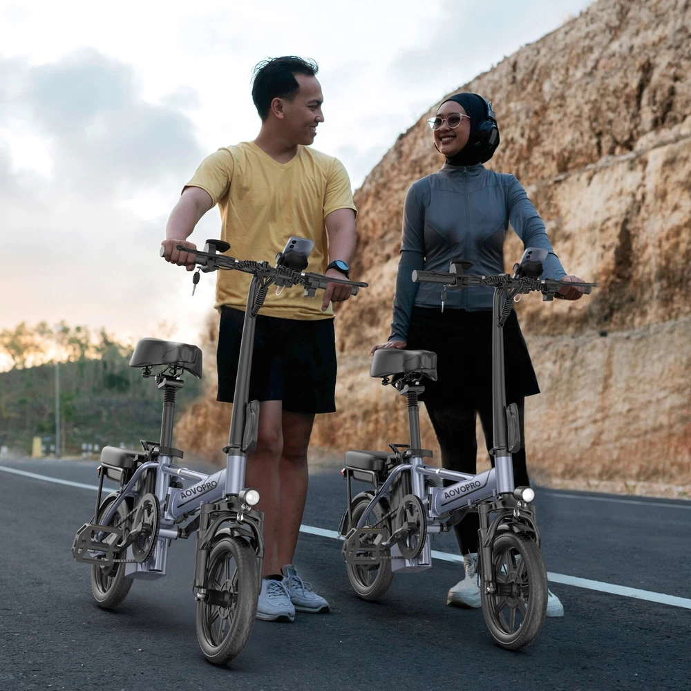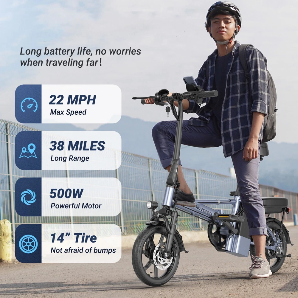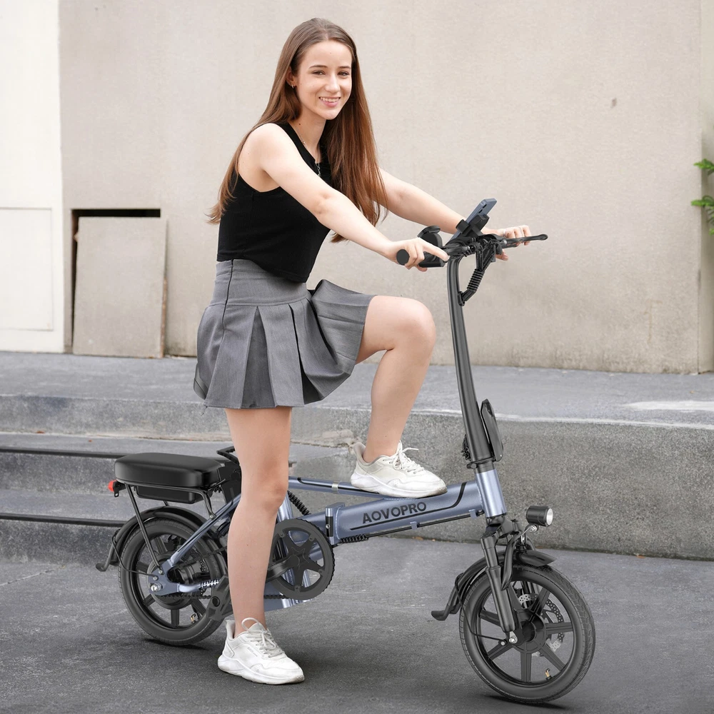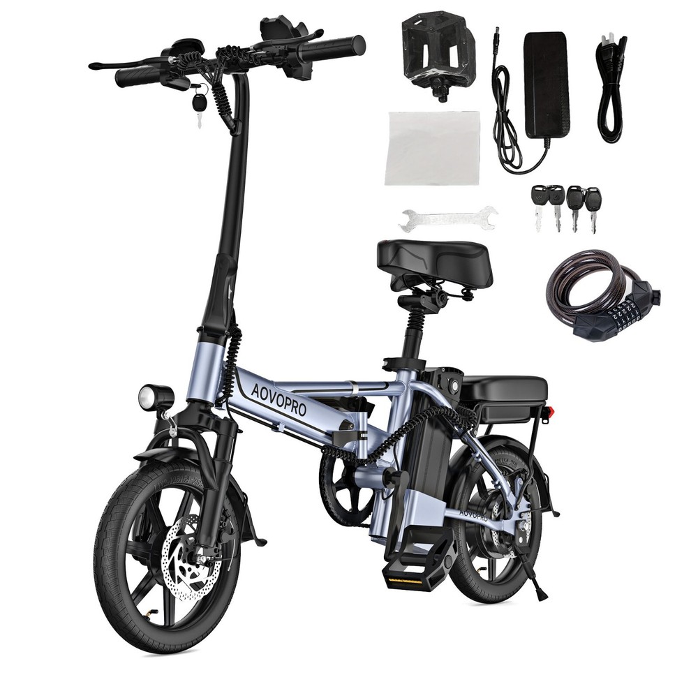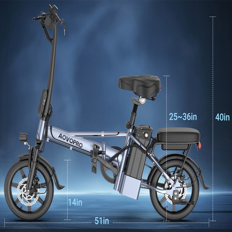 High quality motor and durable battery AOVOPRO EB60 electric bicycle is equipped with a 48-54.6V high capacity detachable lithium battery, with a range of up to 28 miles. The battery is durable, anti-theft. The high-quality 500W brushless motor allows you to easily climb hills, with a speed of up to 22mph(The default maximum speed is 15.5MPH, and after lifting the speed limit, it can reach 22MPH) Comfortable riding experience AOVOPRO EB60 electric bike features adjustable height seats that meet everyone's riding needs, dual disc brakes, front hydraulic shock absorbers, seat spring shock absorbers, and 14 inch inflatable tires, greatly enhancing riding safety and comfort Folding and Portable AOVOPRO EB60 electric bicycle has a foldable body, with a folding size of only 27.6 * 27.6 * 23.3 inches and a weight of only 49 pounds. You can easily lift it up or put it in the car to travel with you. In addition, we have added a phone holder for you to use navigation at any time. What's even more surprising is the USB charging port, which allows you to charge your phone at any time, bringing you a full sense of security for your cycling. In addition, I also gave you a password lock as a gift to protect your scooter from theft Easy installation The installation of the AOVOPRO EB60 electric bike is very simple, and most of it has been completed. We provide clear instructions and tools, so you don't have to worry about installation issues After sales guarantee AOVOPRO EB60 electric bicycle provides a one-year limited warranty. If you have any problems, please contact me at any time through message, and we will provide you with satisfactory after-sales service Brand: AOVOPRO Material: Alloy Motor Power: 500W Brushless Motor Battery: 42V-54.6V Lithium Ion Battery Default Max Speed: 15.5MPH Unlimited maximum speed:22MPH Brake System: Dual disc brake Charge Time: 5H Mileage Range: 21-28 Miles Max Load: 265 lbs Recommended Rider Heights: 4.9' ~ 6'1" Age group: Over 14 years old Wheel Diameter: 14 inch pneumatic tire Lighting: Front headlights, Rear tail lights, Left and right turn signals Bike Type: Folding Electric Bike Brakes: front and rear dual disc brakes+electronic brakes the item is certified to UL 2849 standards and be able provide documentation showing the certification upon request