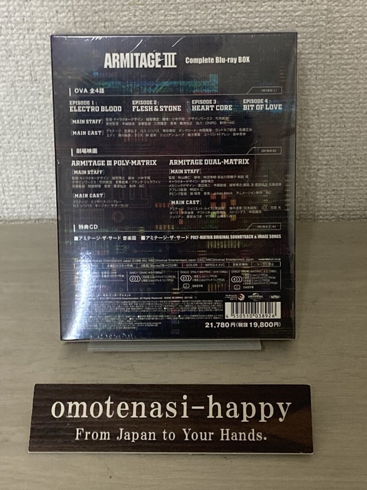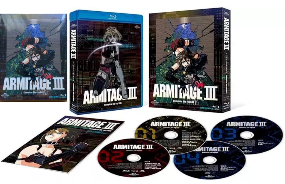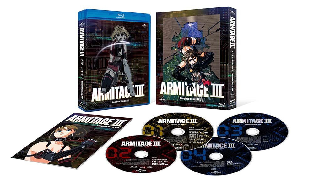 Description All my products are 100% Authentic. Please feel free to contact us if you have any question. New, unused item. We will pack it carefully. OVA series released in 1995, re-edited with new cuts and Elizabeth Barclay, Kiefer Sutherland, and others as voice actors, and became the theatrical version released worldwide as “ARMITAGE III POLY-MATRIX”. All four episodes of the OVA series, “ARMITAGE III POLY-MARIX” and its sequel theater film “ARMITAGE DUAL-MATRIX” have been remastered. The definitive Blu-ray box set is now on sale! In addition, two music CDs, now hard to find, are also included! Blu-ray All 4 episodes of “ARMITAGE III” OVA series ARMITAGE III POLY-MATRIX” The Movie ARMITAGE DUAL-MATRIX” The Movie CD AMITAGE THE THIRD Music Arc AMITAGE THE THIRD POLY-MARIX ORIGINAL SOUNDTRACK & IMAGE SONGS [CD] “ARMITAGE III” [CD] “ARMITAGE III” [CD ARMITAGE Ⅲ” OVA series, 4 episodes Japanese (2.0ch stereo/linear PCM), English (2.0ch stereo/linear PCM) ARMITAGE Ⅲ POLY-MATRIX” Theatrical movie English (5.1ch/linear PCM), English (2.0ch stereo/linear PCM) ARMITAGE DUAL-MATRIX” Theatrical movie English (5.1ch/linear PCM), English (2.0ch stereo/linear PCM), Japanese (5.1ch/linear PCM), Japanese (2.0ch stereo/linear PCM) Story Amitage the Third” is an animated cyberpunk sci-fi OVA that has received tremendous support in the United States. ARMITAGE III POLY-MATRIX” is the international version, re-edited for theatrical release with new cuts. ARMITAGE DUAL-MATRIX” was produced in response to the success of ‘ARMITAGE III POLY-MATRIX’ in the U.S. and depicts the world six years later. Amitage (assassin droids) descend on the city of Chicago in a whirlpool of intrigue... [BONUS ARMITAGE III POLY-MATRIX” Trailer ARMITAGE DUAL-MATRIX” trailer Newly edited booklet (12 pages) Special Disc] [CD] [CD [CD] AMITAGE THE THIRD Music Arc Amitage the Third POLY-MARIX ORIGINAL SOUNDTRACK & IMAGE SONGS Staff] [CD] “AMITAGE THE THIRD MUSIC ARCHIVE ARMITAGE III Director/Character Design:Hiroyuki Ochi/Screenplay:Chiaki Konaka/Design Works:Atsushi Takeuchi/ Art Director:Norihiro Hiraki/Sound Director:Masafumi Mima/Music:Hiroyuki Namba/Cooperation:ONIRO/Production:AIC ARMITAGE Ⅲ POLY-MATRIX Director/Character Design: Hiroyuki Ochi/Screenplay: Chiaki Konaka/Design Works: Atsushi Takeuchi/Sound Effects: Frank Sherafin/ Animation Director: Kunihiro Abe/Music: Hiroyuki Namba/Production: AIC ARMITAGE DUAL-MATRIX Director: Katsuhito Akiyama / Script: Hideki Kakinuma, Nahoko Hasegawa, Osamu Wada / Character Design: Hiroyuki Ochi / Mechanical Design: Koji Watanabe / Animation Director: Hiroyuki Ochi, Jun Okuda, Naoyuki Onda, Nobuyuki Kitajima Dubbing Director: Haruo Ushio / Music: Julian Mack / Animation Production: AIC Casting ARMITAGE Ⅲ Amitage: Hiroko Kasahara / Ross Sirivas: Yasunori Masutani / Dancelord: Ryusei Nakao / Director Randolph: Shoji Sato / Eddie: Hirohiko Kakegawa / Chris: Nobutoshi Hayashi / Julian Moore: Emi Ogata / Eugene H. Allen: Hideyuki Tanaka ARMITAGE III POLY-MATRIX Amitage: Elizabeth Berkeley / Ross Sirivas: Kiefer Sutherland ARMITAGE DUAL-MATRIX Amitage: Juliette Lewis (English version), Ryoka Yuzuki (Japanese version) / Ross: Hikaru Hanada / Yoko: Yuka Imai / Demetrio: Kazuhiro Yamaji / Strings: Joji Nakata / Julian: Mitsuki Saiga / Mouse: Takumi Yamazaki Registration Information Aspect Ratio : 1.78:1 Language : Japanese Packing size : 17.5 x 13.7 x 1.9 cm; 190 g EAN : 4550510038926 Director : Hiroyuki Ochi, Katsuhito Akiyama Media Format : Color, Widescreen Duration : 315 min. Release Date : Nov. 30, 2022 Language : English (PCM) Distributor : NBC Universal Entertainment Japan ASIN : B0B7HMCH4Z Country of Origin : Japan Number of discs : 4 Payment We usually ship within 5 - 10 business days of receiving cleared payment. Shipping We ship using FedEx, DHL and Japan Post. Additional shipping charges may apply for remote locations. International Buyers - Please Note: Import duties, taxes and charges are not included in the item price or shipping charges.These charges are the buyer?s responsibility.Please check with your country?s customs office to determine what these additional costs will be prior to bidding/buying. These charges are normally collected by the delivering freight (shipping) company or when you pick the item up do not confuse them for additional shipping charges. I do not mark merchandise values below value or mark items as "gifts" - US and International government regulations prohibit such behavior.