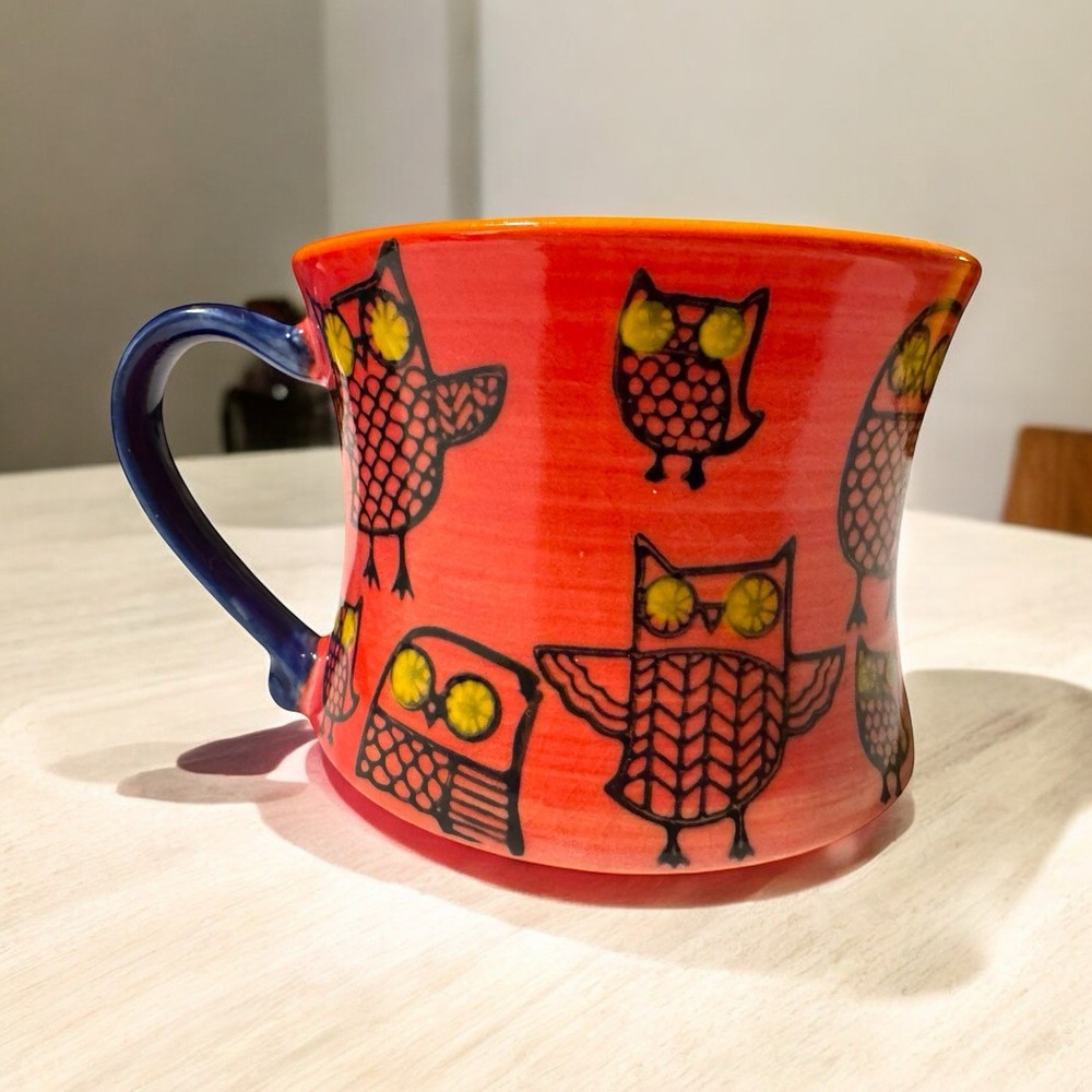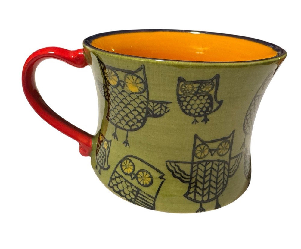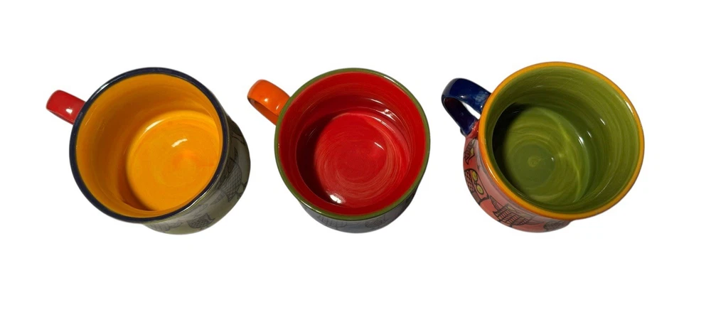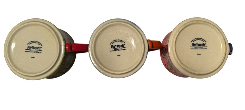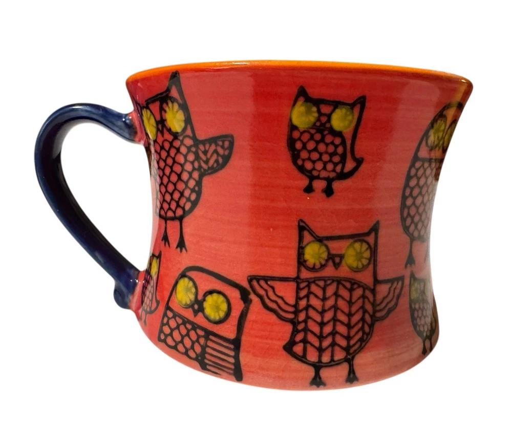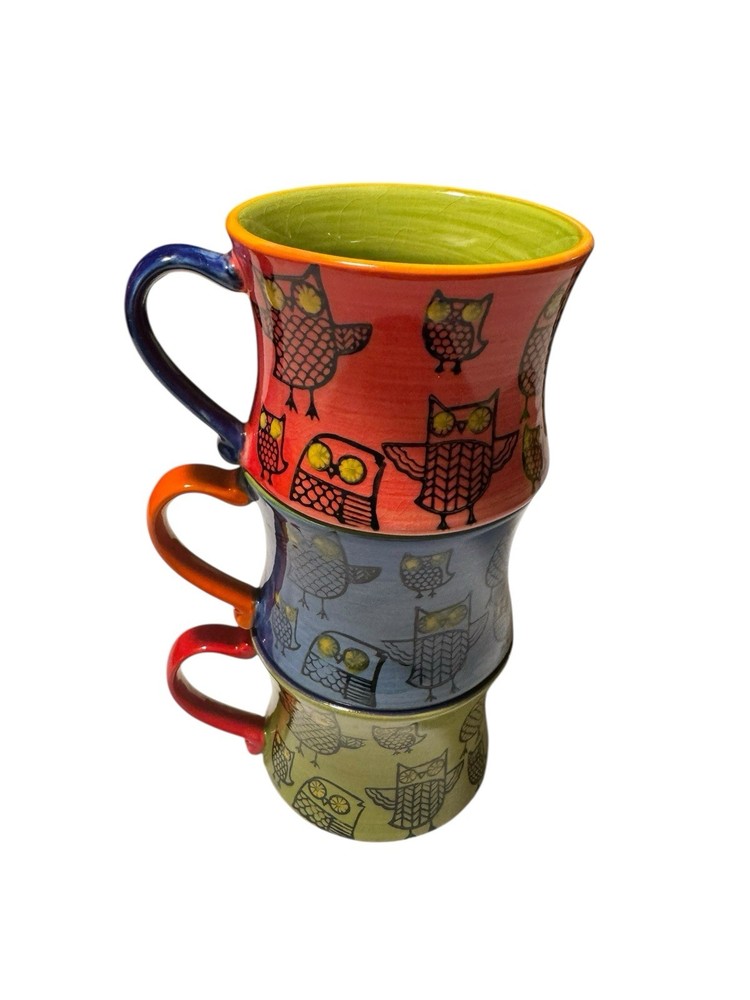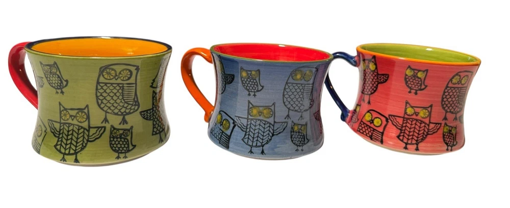 The Pier 1 Imports Set of 3 Stoneware Hand Painted Mugs features a charming owl print design, perfect for OWL lovers and collectors. Made of durable stoneware, each mug has a medium capacity of 8-10 oz and is hand-painted for a unique and whimsical appearance. The multicolor pattern adds a fun and vibrant touch to your morning coffee routine, while the urban style appeals to those who appreciate a blend of bird themes in their kitchen decor. Made in China, this set of mugs is a delightful addition to any home. This set is missing the red mug. But all 3 stack perfectly well and are beautifully presented. Smoke and pet free home, please do not hesitate to reach out with questions, request more pictures or negotiate an offer. Thanks for shopping.