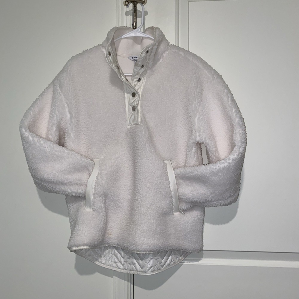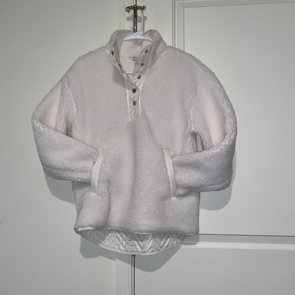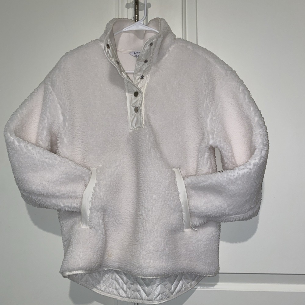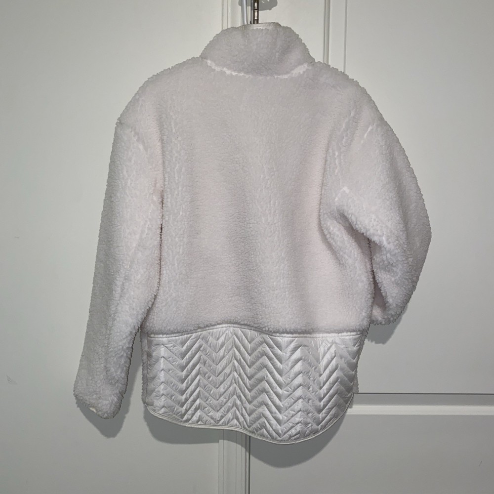 The Athleta Women's White Cozy Sherpa Snap Fleece Sweatshirt in size small is a stylish and comfortable activewear piece perfect for the winter and fall seasons. Made of polyester fleece fabric, this pullover sweatshirt features a solid white color with long sleeves and snap closures. The breathable material and classic style make it a versatile choice for any occasion, while the regular fit ensures a comfortable and flattering silhouette. Machine washable for easy care, this sweatshirt from Athleta is a cozy and practical addition to any woman's wardrobe.
