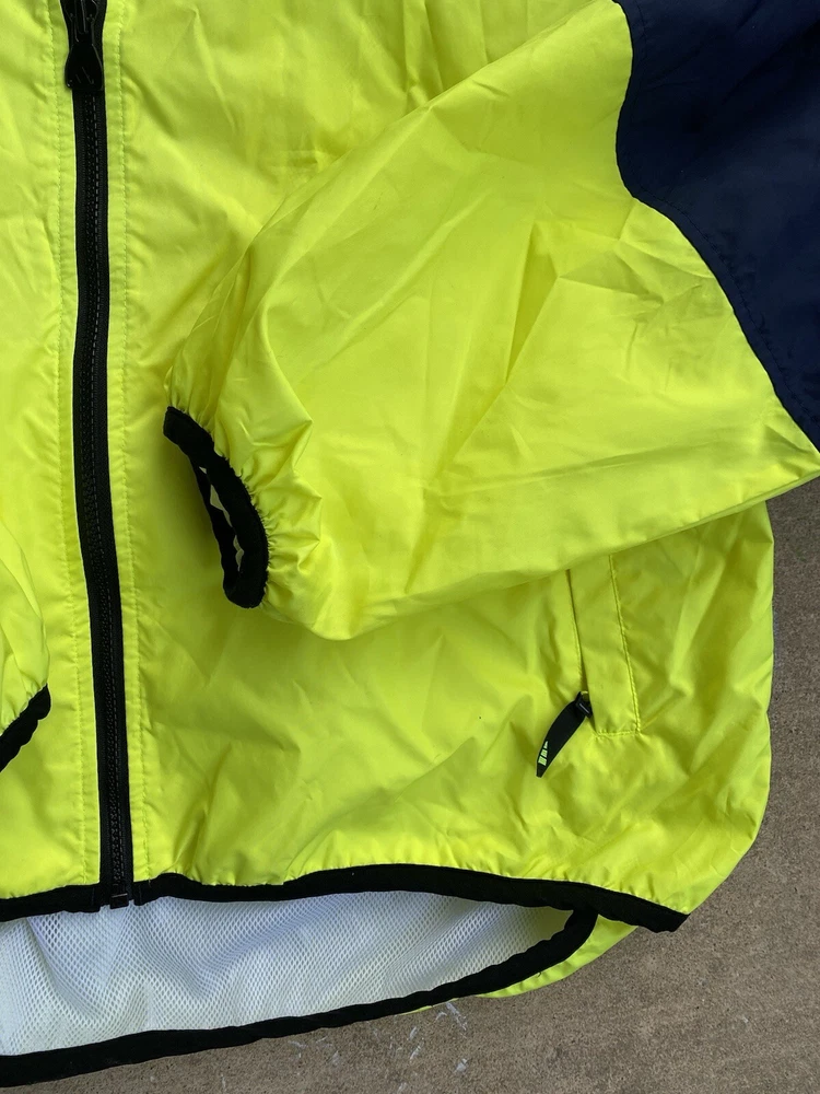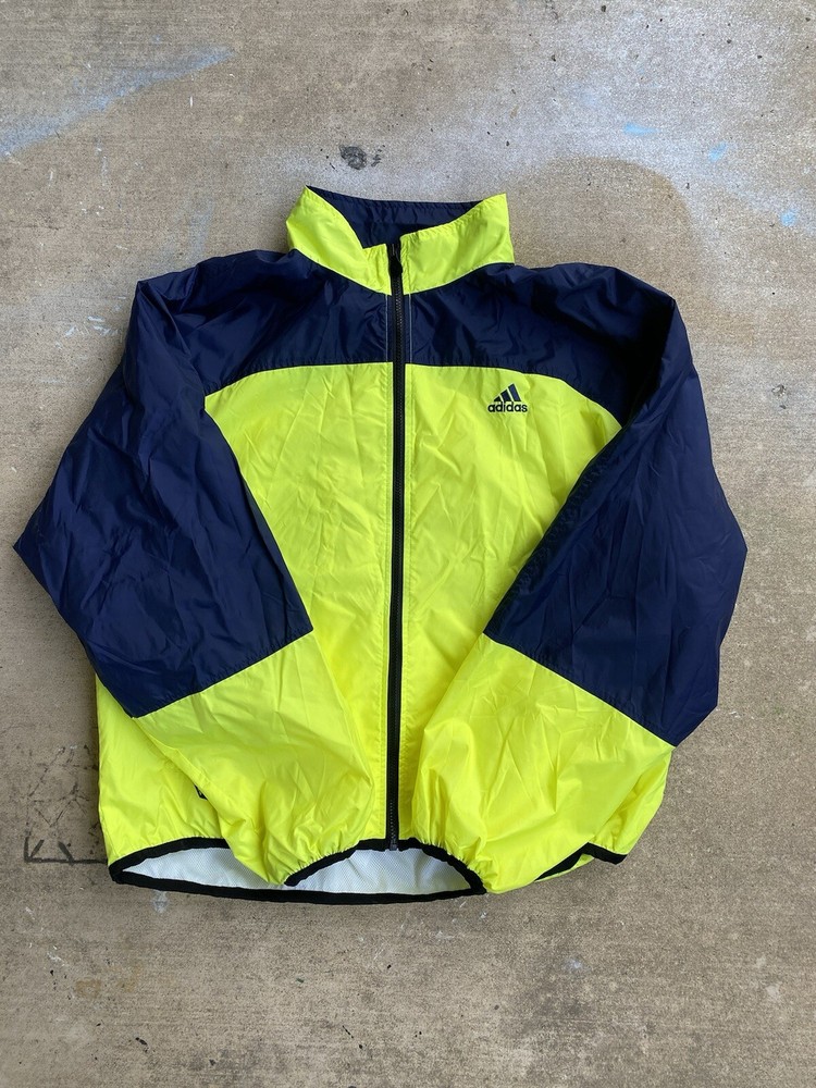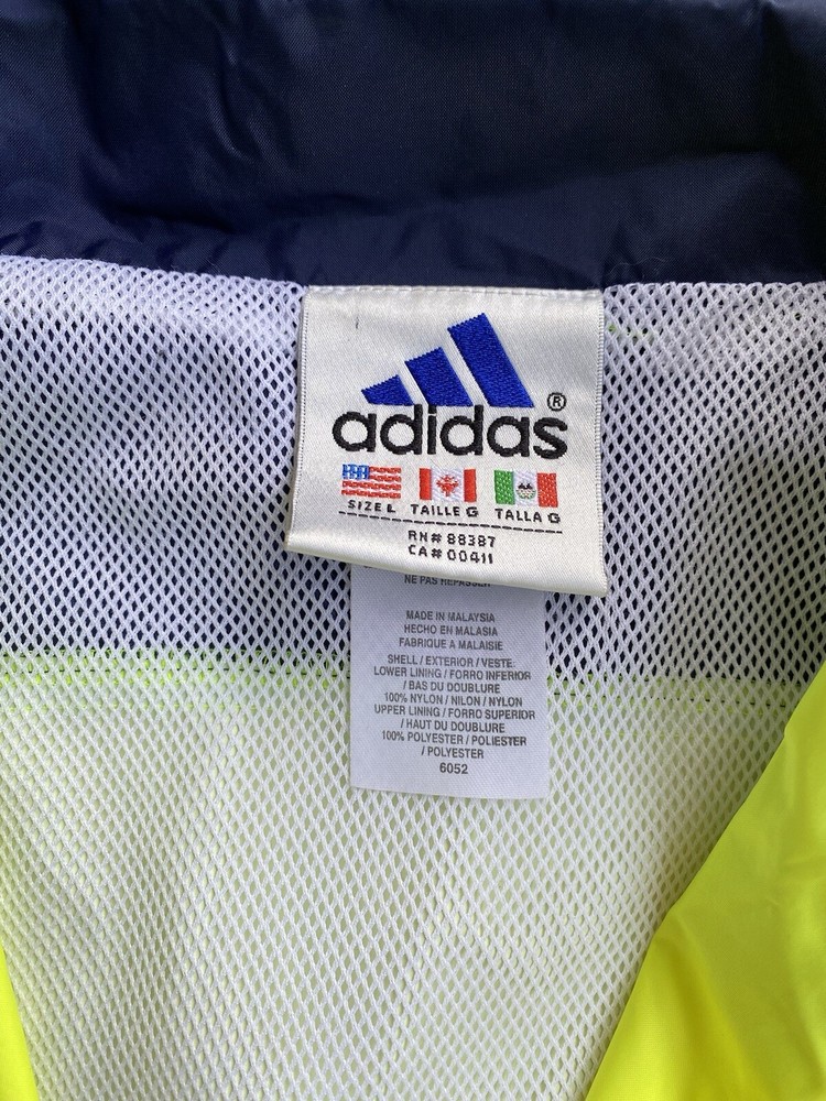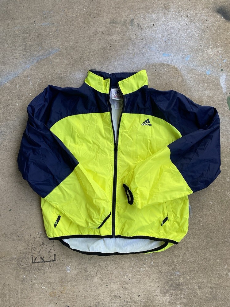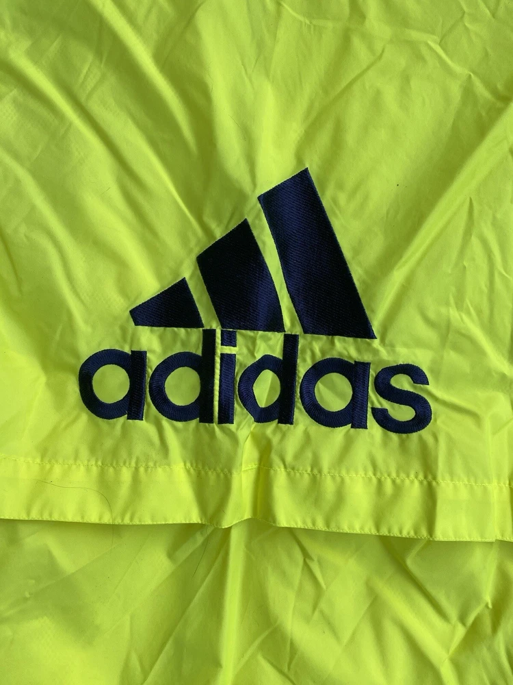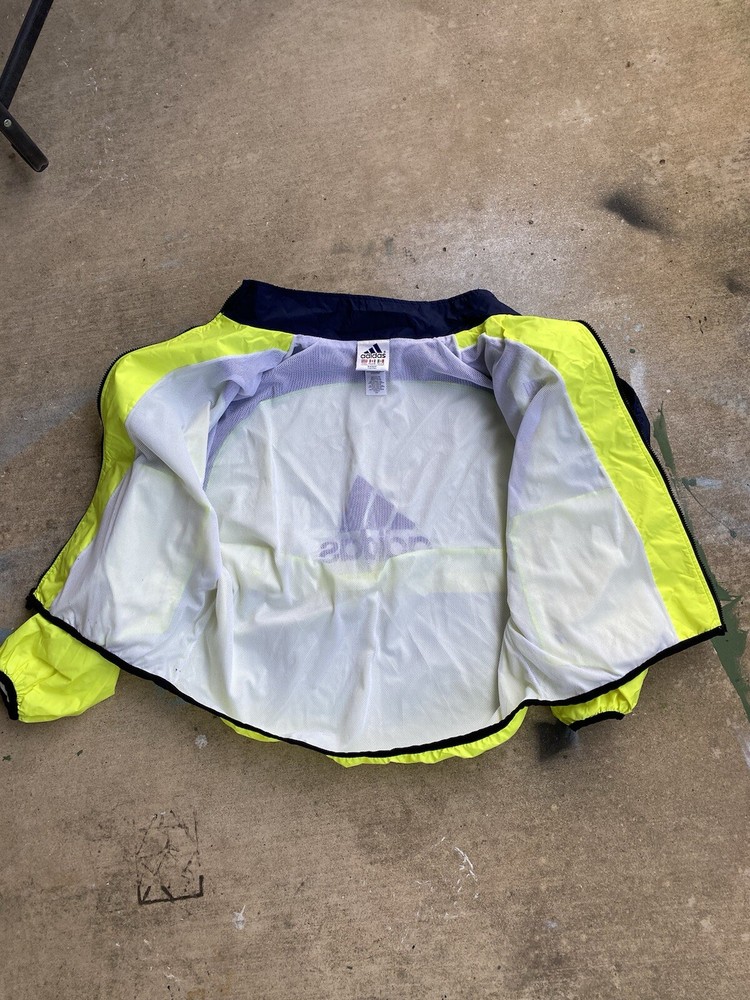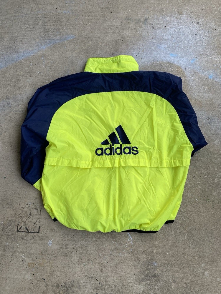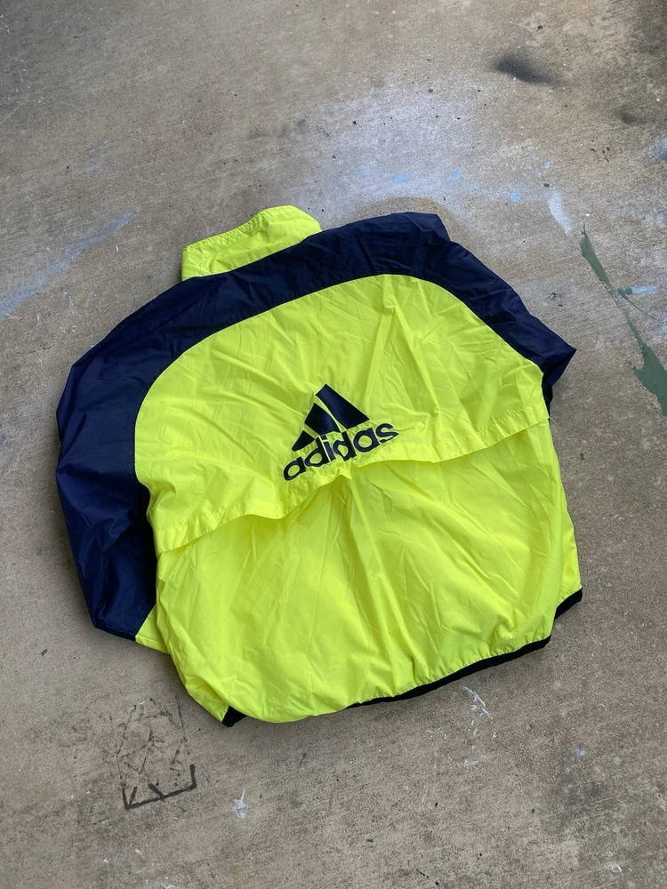 This Adidas Wind Runner jacket is a vintage 90s style windbreaker featuring neon color blocking and the iconic 3 stripes design. Made of nylon with a mesh liner, it has a mid-length fit with long sleeves and a zip closure. The jacket is accented with embroidered logos and zipped pockets, suitable for casual wear and travel. It offers an athletic fit and is ideal for walking, running, or jogging in various seasons. Zipper and everything is in amazing condition. Beautiful vintage color. Free Shipping