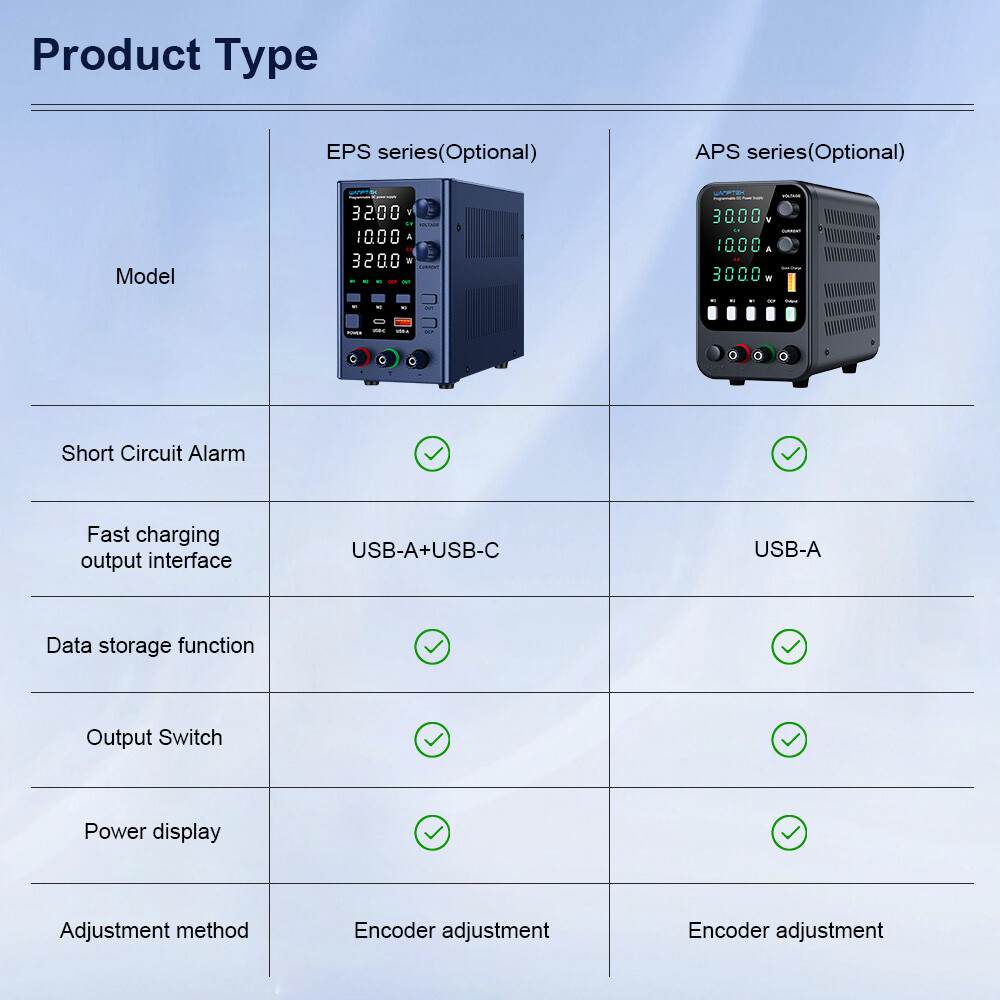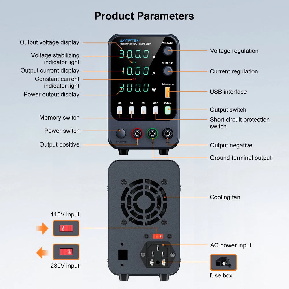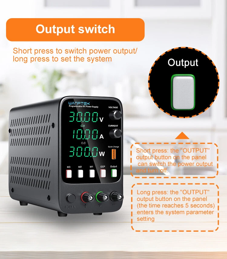 30V 10A Lab Adjustable Bench DC Power Supply Variable Encoder Adjustment Knob product description The APS series products are three window four position displays with data storage, programmable switch DC regulated power supply, and can simultaneously display voltage, current, and power. The product is widely used in mobile phone repair, computer repair, battery charging, school teaching, and production line use. The use of a coding potentiometer can continuously adjust the output voltage and current between 0 and the nominal value, and can pre display the set value for easy use and adjustment. This device has USB fast charging function and supports multiple fast charging protocols. Equipped with perfect OVP and OCP short-circuit protection circuits, this product also provides upper computer communication function (optional), making it convenient for users to remotely control PC and other main control devices through USB data cables. The stability and ripple coefficient of the power supply are very good. It has a small size, beautiful design, convenient operation, and can work for a long time at full load, which is deeply loved by users. Product Features The coding potentiometer sets the voltage and current, and the set values can be displayed in advance. OCP overload protection function, short-circuit stop output. With 3 sets of data storage, it is convenient for quick recall. With Output output on-off function. USB fast charging function supports multiple fast charging protocols. Optional USB communication interface, PC control software. Small size, light weight, and high power density. Constant voltage and constant current switch automatically. Voltage, current, power Three LED four-digit display, high precision. The temperature-controlled fan has heat dissipation, low noise and long life. Application field 1. Production line testing. 2. Repair of mobile phones, computers, and electrical appliances. 3. Product aging and electroplating. 4. Charging the battery. 5. Laboratory, scientific research and teaching. 6. All other occasions that require a DC stabilized power supply. Model parameter Model APS3010H Output Power 300W Output voltage 0~30V Output current 0~10A Auxiliary functions USB fast charge, output on and off, data storage , USB host computer communication(Optional) Protection mode OVP over voltage protection, OCP over current protection, over temperature protection, short circuit alarm stop output. working environment Input voltage : AC 230V/115V±10% ; 50Hz/60Hz Working temperature : 0 ℃~ 40 ℃ ;relative humidity:<80%RH Storage temperature : -10 ℃~ 70 ℃ ;relative humidity:<70%RH Constant voltage CV Voltage stability : 0.5%±3mV Load stability : 0.5%±3mV Ripple voltage : ≤0.5% Vp-p 0 to rated voltage continuously adjustable constant current CC Current stability : 0.5%±3mA Load stability : 0.5%±3mA Ripple current : ≤0.5% Vp-p Recovery time : ≤500μS Temperature coefficient : ≤100ppm/ ℃ 0 to rated current continuously adjustable display 0.4 inch white light four-digit digital tube three groups display Display accuracy : 0.5%±digits Display resolution : voltage 0.01V , current 0.001A Size and weight Product size : 190(L) x 90(W) x 145(H) mm Packing size : 265(L) x 135(W) x 195(H) mm Net weight : 1.15Kg Gross weight : 1.5Kg 8sets/piece, box size:550*275*405mm,box weight:12.5kg Random attachment power cord x 1 (EU,US,UK, ...) Instructions x 1, Test line x 1, Machine color black Payment Delivery details Return Policy About us Payment eBay payment accepted: PayPal, Credit/Debit card, or any other method accepted by eBay. Per official eBay policy, we only ship to eBay's Confirmed Address. If you need to change or update the shipping address before the items are shipped, the order will be canceled. We are required by the state of California to collect sales tax when shipping within the state. Please Checkout & Pay immediately. If you have any questions, please contact us, Otherwise, a non-payment case will be automatically opened. Delivery details After your payment is cleared, by 1:00 pm (PST), the order will usually ship the same day or following business day. All orders placed on weekends and holidays will be processed on the following business day. Cancellation can be done before order has been processed and a tracking number has been assigned to your order. Return Policy Free Returns within 30 days from the date of purchase. If you received the wrong item, or the item is damaged or defective, please contact the seller so we may resolve the issues as soon as possible. We will work to address any concerns about your order, so please contact the seller and provide pictures through eBay messages, prior to leaving negative feedback. All returned products must be returned in new, unused condition, with all original materials included. For bundle items: to receive a full refund, all items within the bundle have to be returned. Non returned items, will convert into a full-price purchase and the order will be refunded accordingly. Return packages: the refund is processed after the package has been received by our RMA department. Refused, Unclaimed and Return packages due to Wrong/Incomplete address or any other reason, will be refunded, minus the shipping fee, if paid, once the package has been delivered to the RMA department. Shipping paid by buyer is nonrefundable. we are not liable for lost, stolen or damaged packages. We reserve the right to update the policies above without any prior notice. About us Shenzhen Guce Electronic Technology Co., Ltd. was established in 2017. It is a high-tech enterprise specializing in research and development, design, production, and sales of power supplies. It is a globally renowned power supply brand enterprise, with main products including DC power supplies, programmable DC power supplies, electronic loads, regulated power supplies, military power supplies, DC power supply testing systems, and a full range of power supply products. 