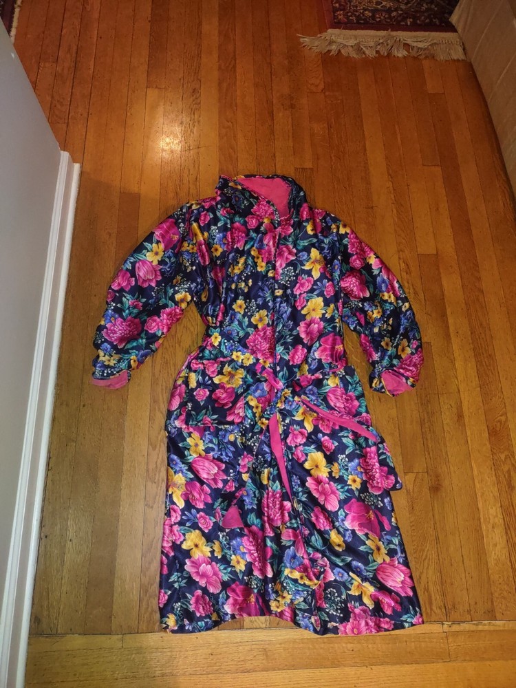 This is an Adonna pink floral robe, designed for women in size Medium. It is cozy and comfortable, suitable for lounging or relaxing at home.