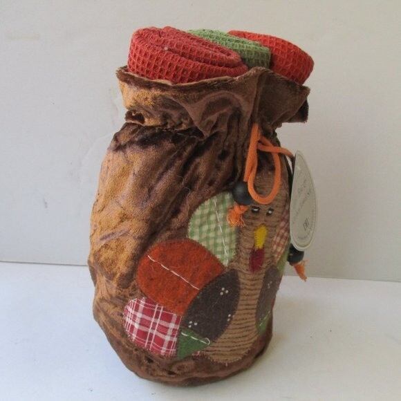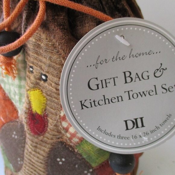 DII - for the home - Adorable Turkey Patchwork Gift Bag and Kitchen Towel Set. Includes 3 rust, orange and green 16" x 26" towels. Polyester drawstring pouch. NWT. All measurements are approximate. J0...