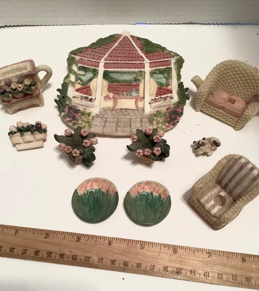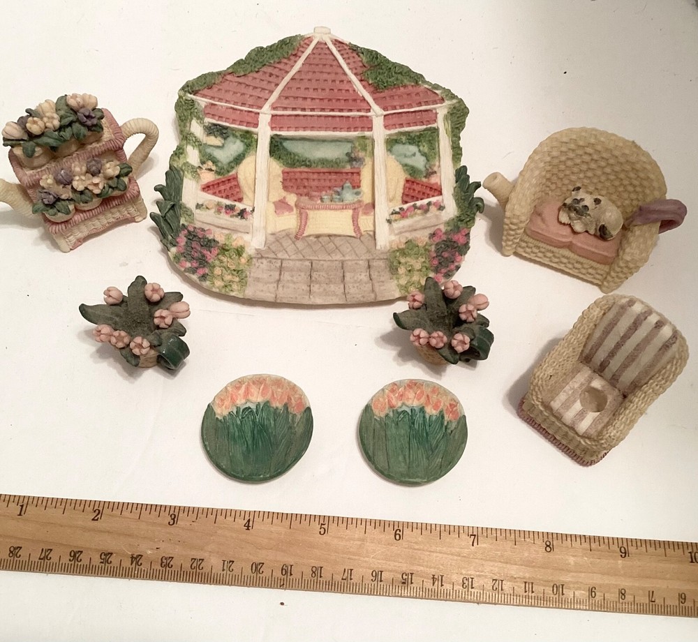 Just too cute! This 1996 vintage miniature tea set is done in a lovely spring garden design! The 10 pieces include a wicker settee with sweet removable kitty, a matching wicker chair, two floral tea cups with separate saucers, an adorable tea cart with separate blooms, and a gazebo style tray to hold all this cuteness! There seems to be one missing piece because the wicker chair has an indentation for an insert, but it doesn’t really show. Made from a hard resin type material. In great preowned condition… no box. Thanks for shopping. Any overage in postage will be happily refunded! 😁. Thanks for shopping!