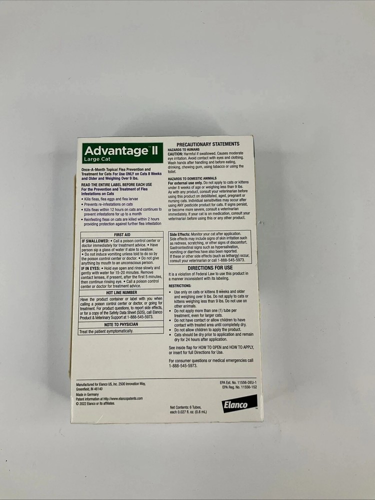 Description Brand New Advantage II Large Cat (Over 9Lbs) kills fleas , flea larvae , flea eggs (Waterproof) Please review pictures provided Please ask any questions prior to purchasing