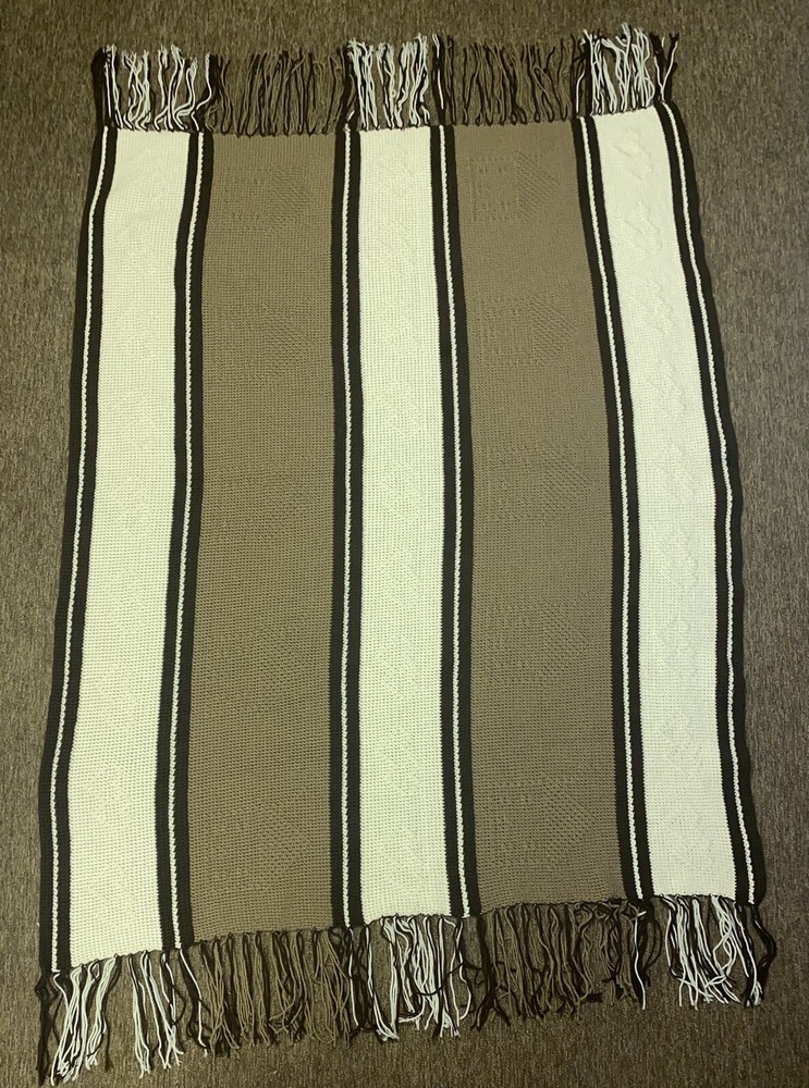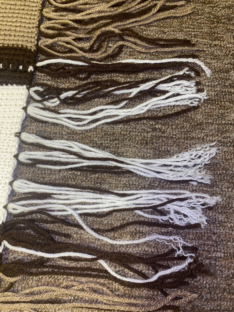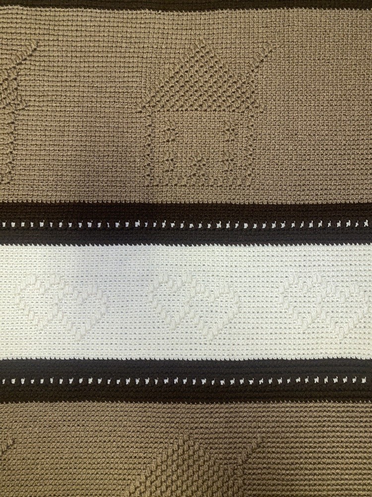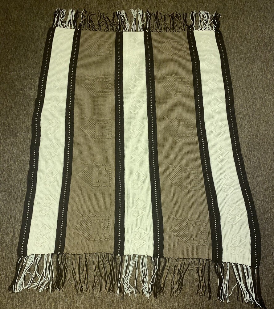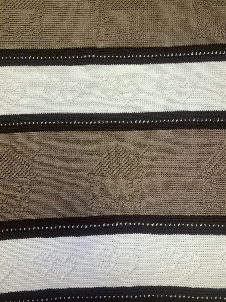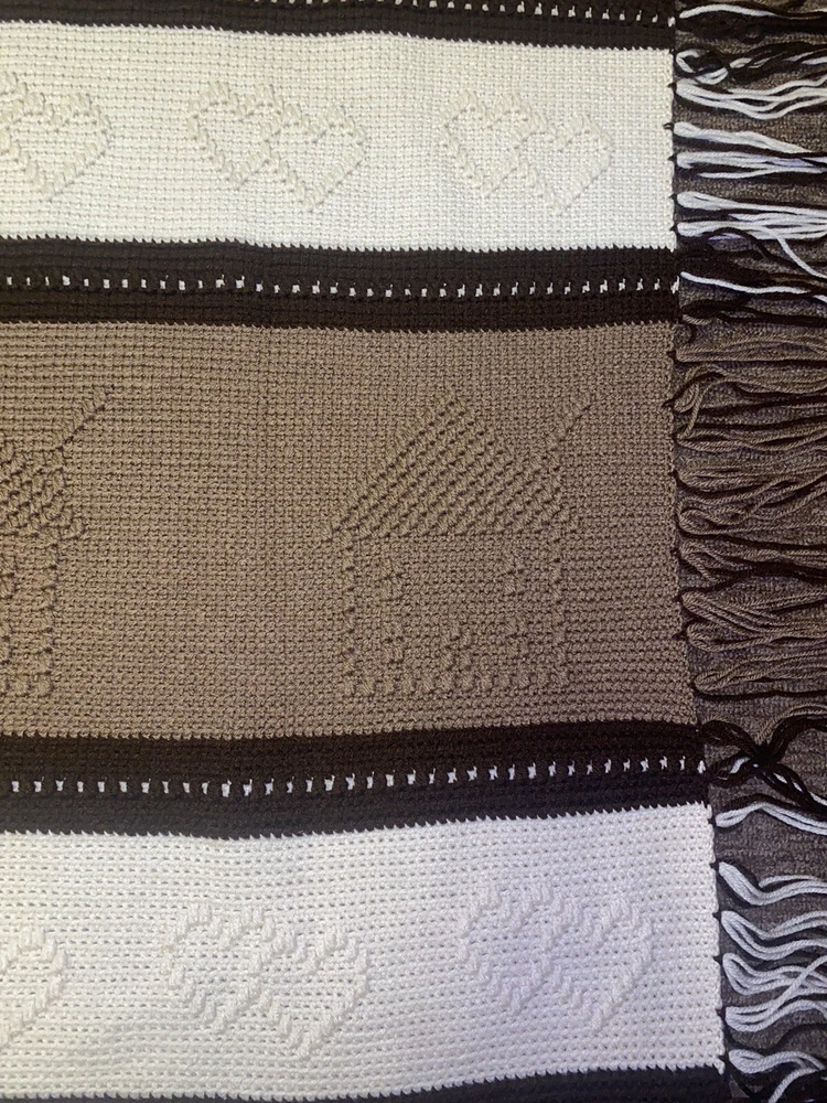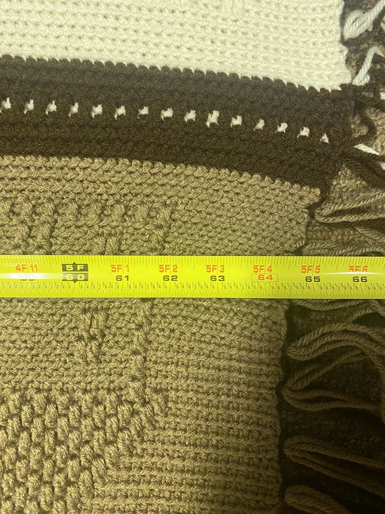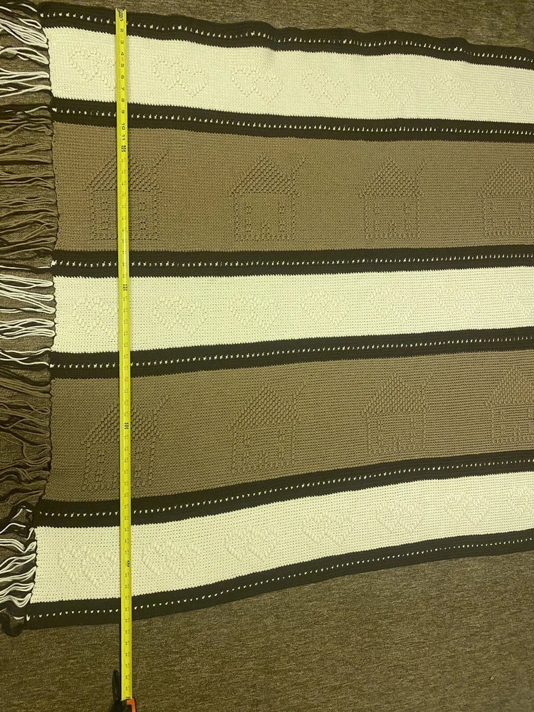 Add some country charm to any room with this beautiful handmade crochet blanket. Measuring 64 inches in length and 52 inches in width, this large rectangular throw is perfect for snuggling up on the sofa or adding an extra layer of warmth to your bed. The gorgeous pattern in shades of browns and cream is sure to complement any decor style. Crafted with care this throw is made from high-quality materials and features a cozy theme of houses and hearts that's perfect for those chilly evenings. Whether you're looking to add a touch of warmth to your home or simply want to curl up with a good book, this blanket is the perfect choice. Has some unraveling on the tassels, see pictures.