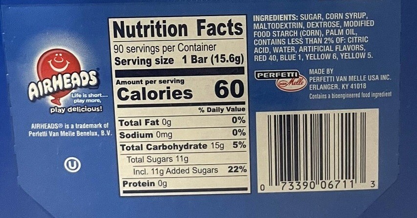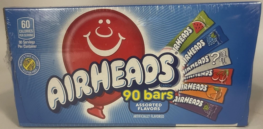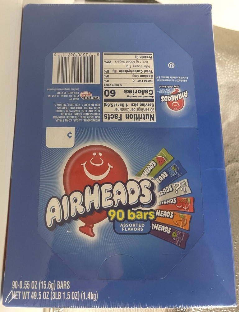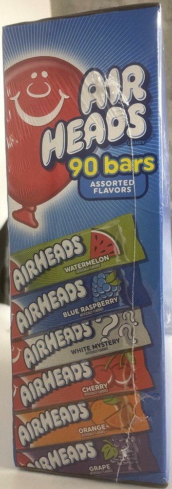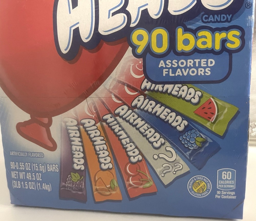 Airheads Assorted 90 Count Box Includes: 1 Box of 90 Bars Flavors: Cherry, Grape, Blue Raspberry, White Mystery, Orange, & Watermelon Net Weight: 3.1 lbs Each Bar is 0.55 oz Fresh and factory sealed Flavors are randomly assorted, not all flavors may be included in all boxes