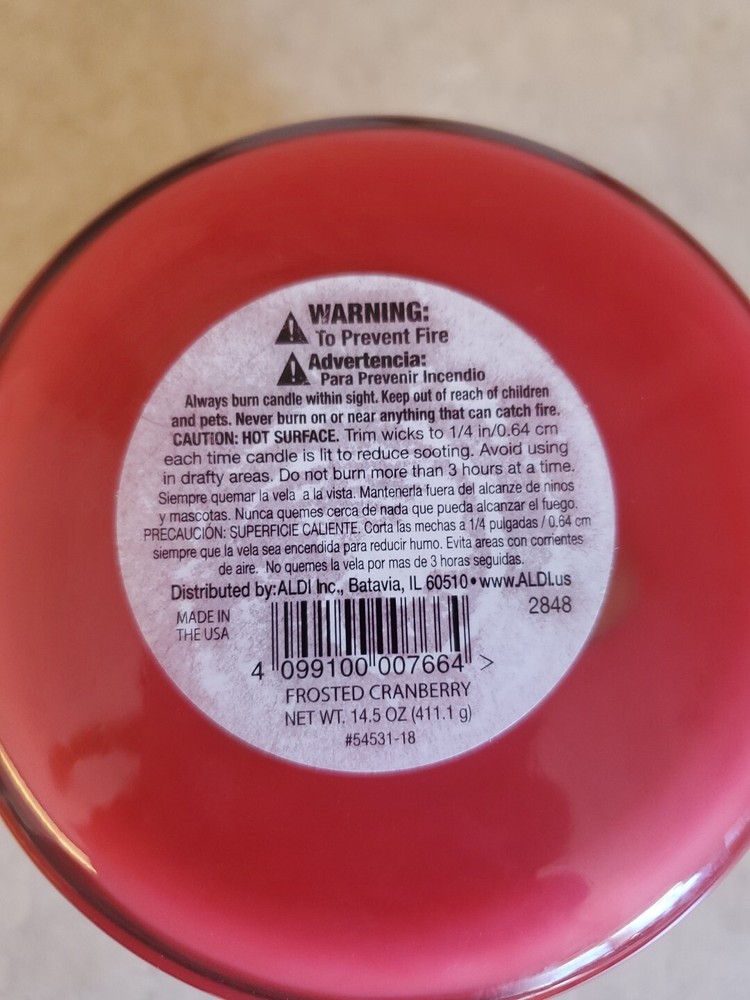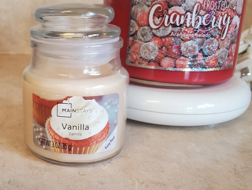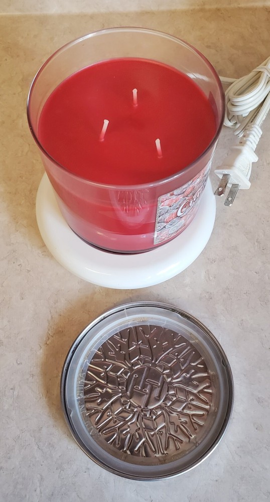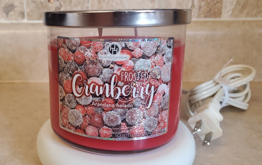 Huntington Home Aldi Frosted Cranberry 3-Wick Triple Wick 14.5oz Candle Soy Includes Provo Craft and Novelty electric candle warmer with on/off switch. Tested and works. Bonus included 3 oz. Mainstays Vanilla candle. 3.5" tall x 2-2/4" diameter. This is a wax candle with a glass jar and top Please look at all the photos as they help describe the items and ask any questions prior to buying. Thanks for Looking C1