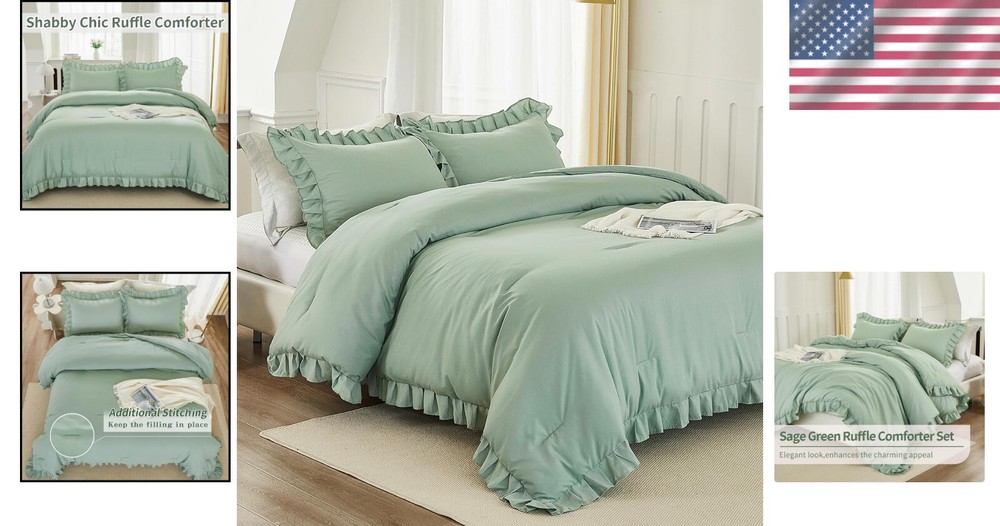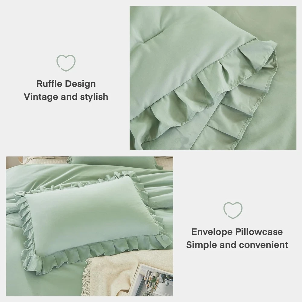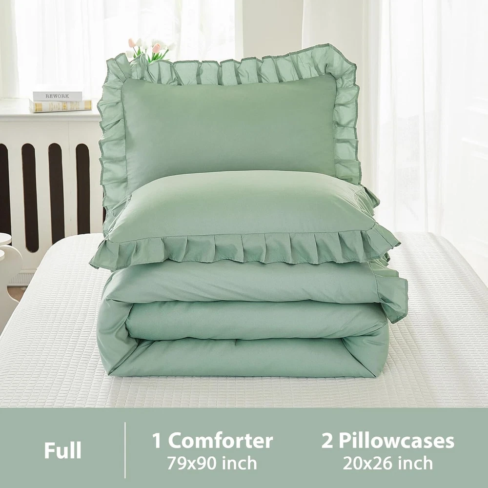 I love this comforter set! The sage green color is so calming, and the lightweight fabric keeps me cozy without overheating. The ruffled edges add a stylish touch, and the quality feels amazing. Washes well, stays soft, and fits perfectly on my full-sized bed. Great all-season comfort—highly recommend!