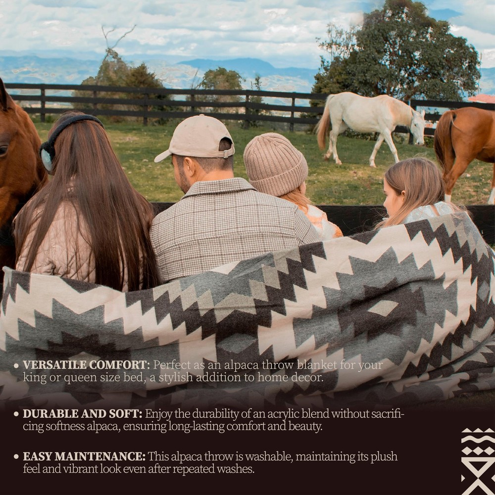 MADE IN THE HEART OF THE MOUNTAINS Introducing our luxurious alpaca blanket, expertly crafted in Ecuador with a blend of 70% pure alpaca and 30% acrylic. This unique combination ensures the perfect balance of softness and durability, making it an ideal addition to your home. Inspired by the majestic Andes, our alpaca throw blanket provides unparalleled warmth and comfort, whether draped over your king or queen size bed or as a cozy accent on your couch. The rich texture and thickness offer a sheltered warmth, perfect for those chilly winter nights. Eco-friendly and easy to maintain, our alpaca wool blanket is washable, retaining its plush feel and vibrant appearance wash after wash. Embrace the beauty and elegance of this globally inspired collection, where the heritage of the Andes meets modern design. Experience the ultimate in luxury and comfort with our Ecuadorian alpaca blanket, a must-have for any home. LUXURIOUS SOFTNESS: Our throw blanket wool, made from 70% alpaca and 30% acrylic, combines softness with durability, offering cozy warmth on any bed or couch. WARMTH MEETS STYLE: The rich texture and thickness of our alpaca wool blanket provide warmth, making it the perfect companion for winter nights. VERSATILE COMFORT: Perfect as an alpaca throw blanket for your king or queen size bed, or as a stylish addition to your home decor. GLOBAL INSPIRATION: With a unique combination of materials and designs, this collection draws on influences from the Ecuadorian Andes, adding a touch of elegance to any space. EASY MAINTENANCE: This alpaca throw blanket is washable, maintaining its plush feel and vibrant look even after repeated washes.