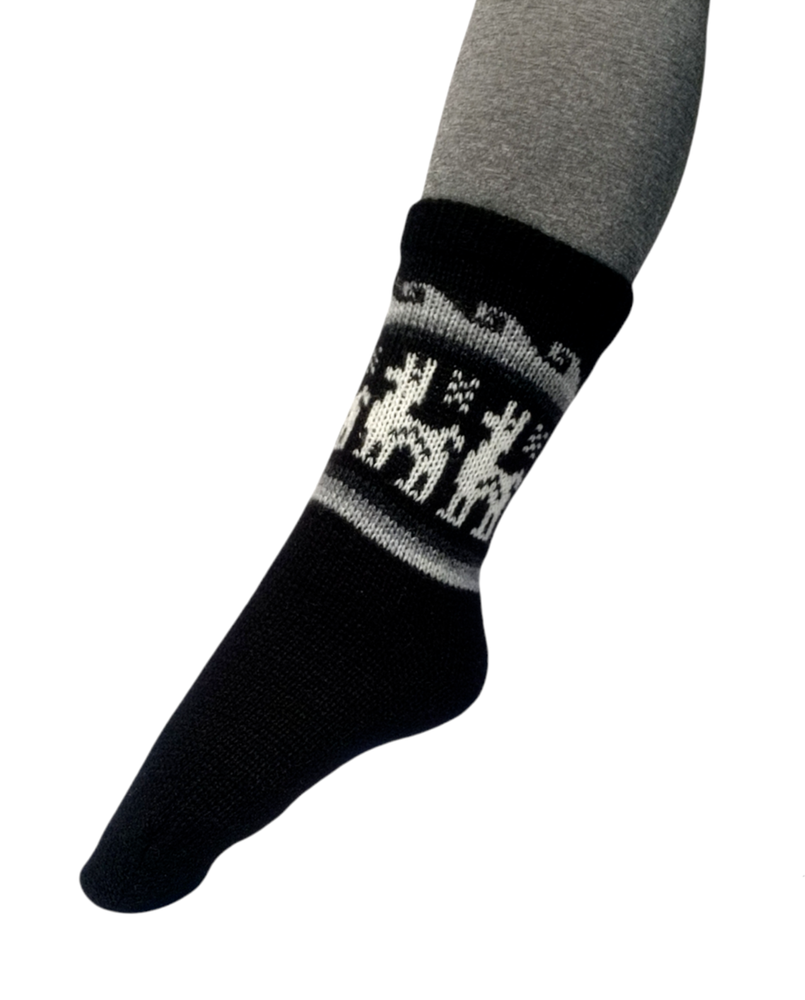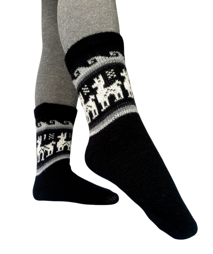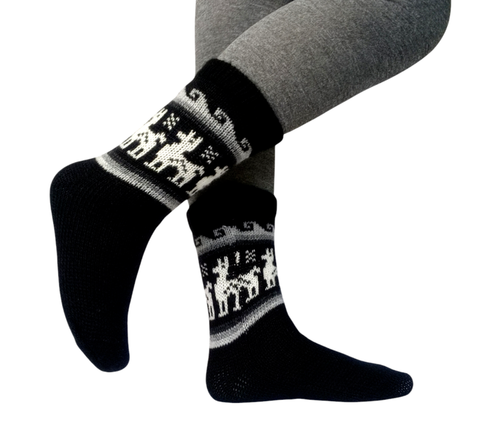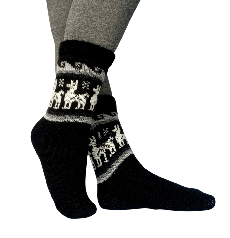 Cozy Alpaca & Llama Wool Socks Discover the Warmth of Andean Culture Crafted from a blend of 65% alpaca and 35% llama wool, these socks offer the perfect balance of softness and durability. Alpaca wool alone is too delicate, but the addition of llama wool ensures strength and longevity. Featuring a vibrant knitted pattern inspired by the rich Andean culture, these socks are a celebration of tradition and style. Product Details Color: White with colorful alpacas and ornaments. Size: 7-9 US (mid-calf). Care: Easy to wash, retains color and shape. Origin: Handmade in Bolivia, each pair is a unique piece of art. There may be slight variations in pattern and character, but the main colors remain consistent. Add these cozy socks to your wardrobe and enjoy their warmth all winter long! Socks Size Chart SIZE EU UK US CM INCHES M 42-43 8-9 8.5-9.5 26-27 10.25-10.65