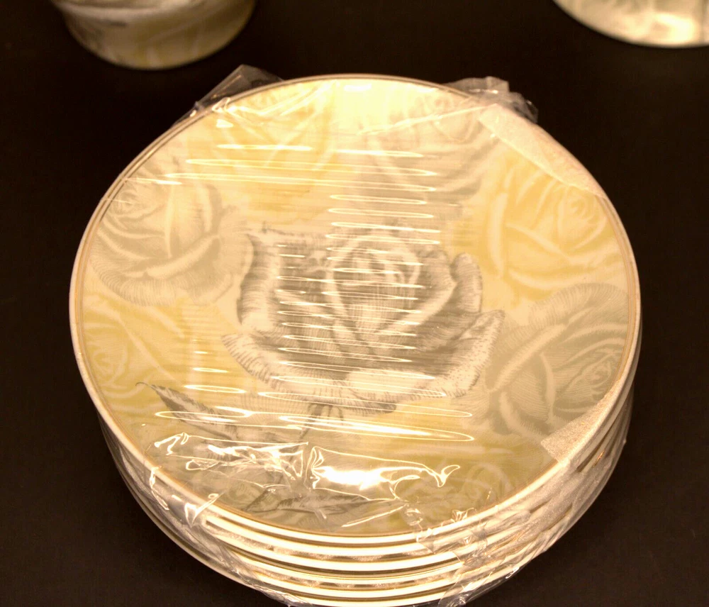 Never been used. Original box unopened plates. In vintage condition. There are some signs of wear, which I have photographed. Not from use. I believe to be just from the elements from which they were stored. Absolutely beautiful and are versatile in style depending on what setting they are put in, do to their soft pattern and colors that combine well with any color.