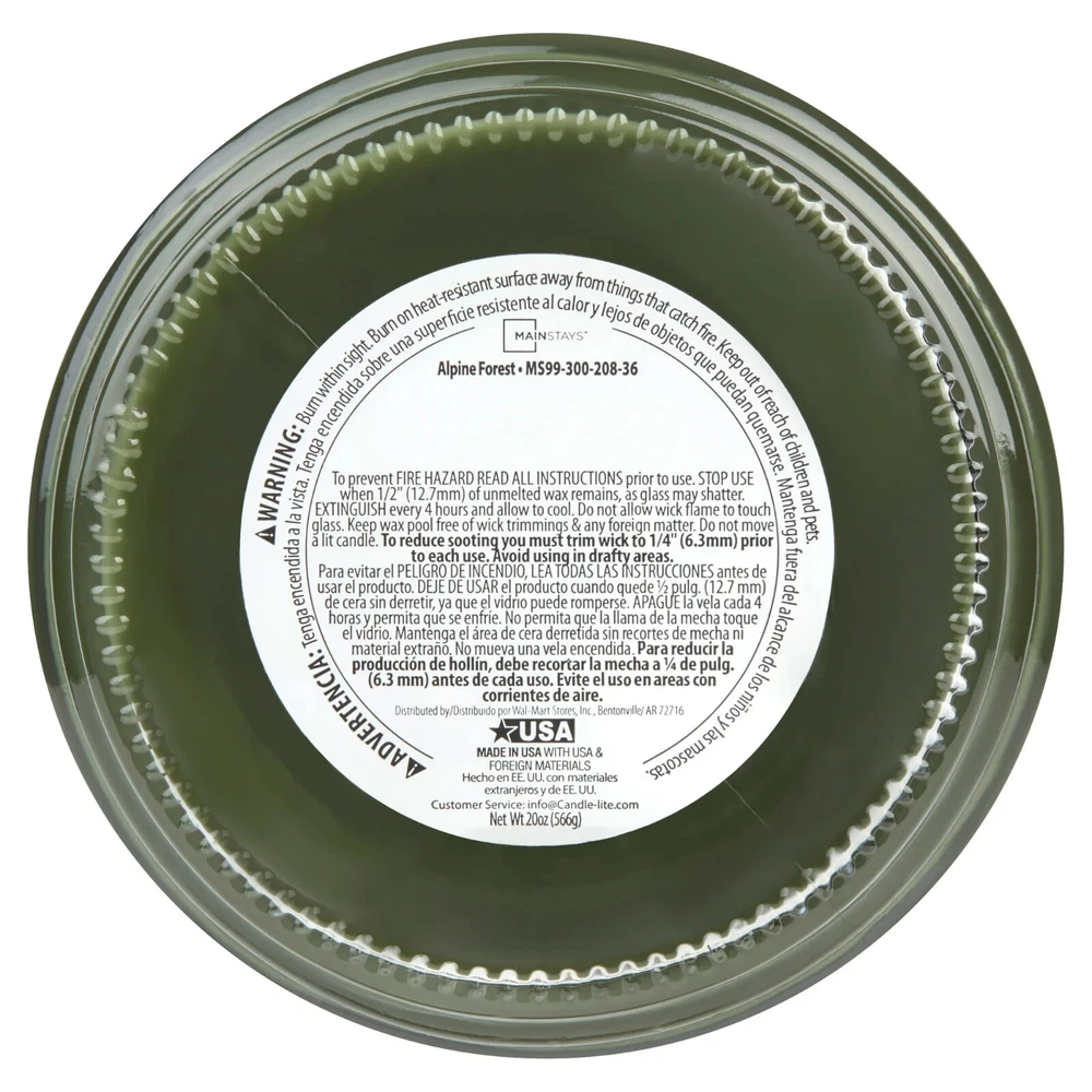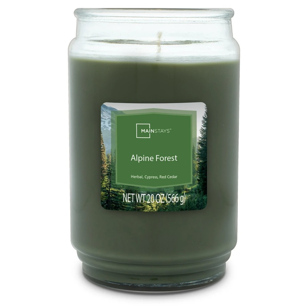 About this item Mainstays Alpine Forest Scented Single-Wick Glass Jar Candle, 20 oz Alpine Forest features woodland herbs and a hint of wood smoke swirl with fragrance cypress and wild orange, leafy green, red cedar and touches of harvest leaves Complements virtually any room decor 20 oz. single-wick candle burns for approximately 100-120 hours Features a decorative beveled edge glass vessel Mainstays single-wick scented candles are highly fragranced, and provide a clean and even burn that will fill your home with beautiful and enticing aromas Our candles are made from high quality, non-toxic, clean-burning wax that is specifically developed to hold optimal fragrance loads Our Mainstays 20oz candle is available in a variety of scents