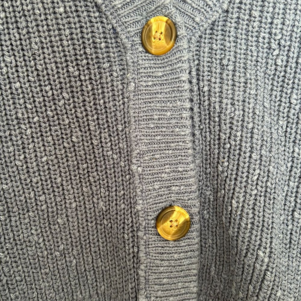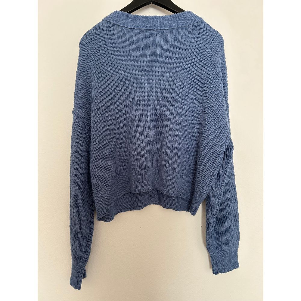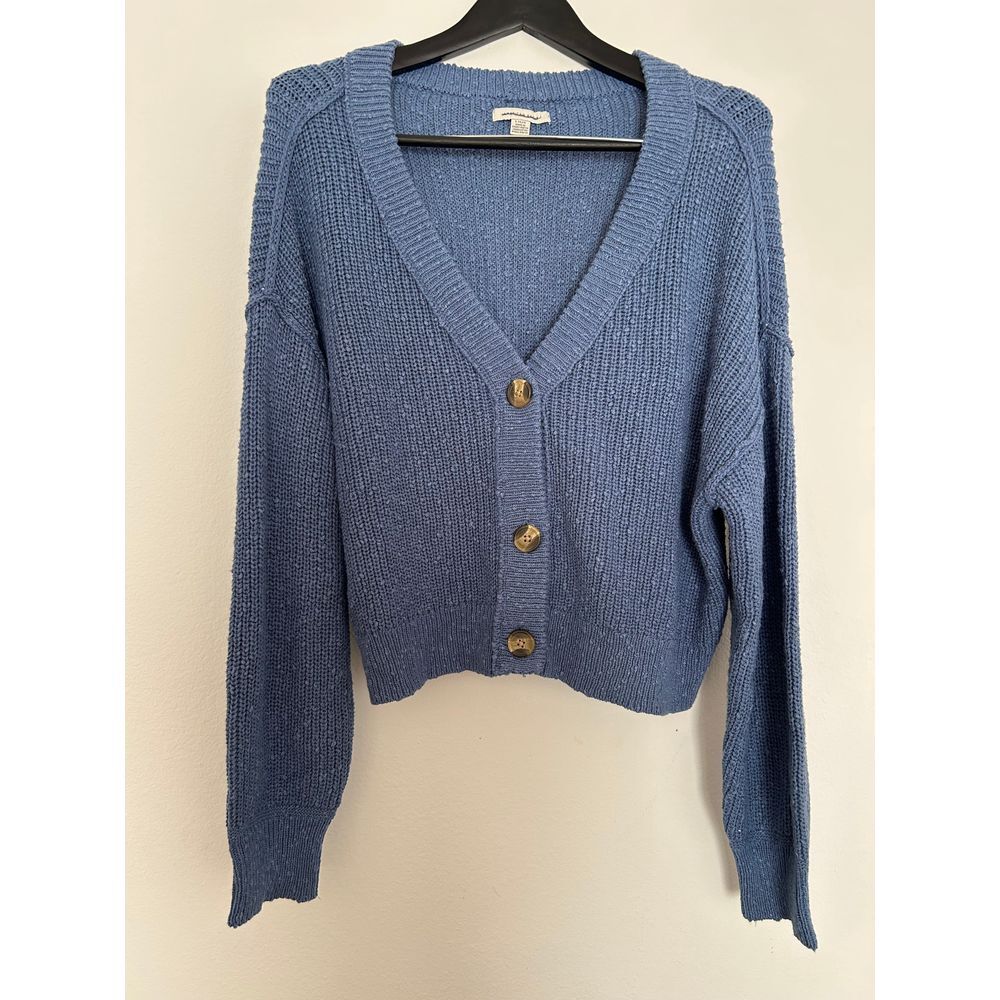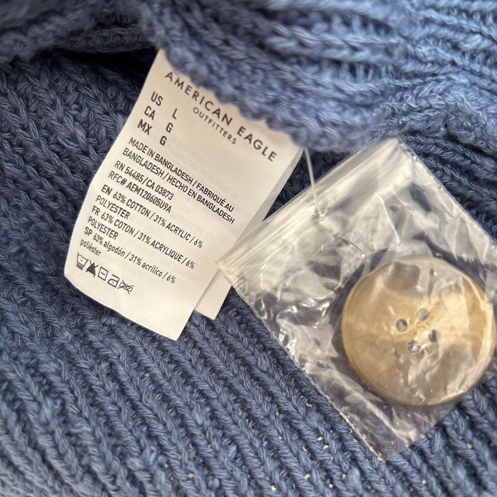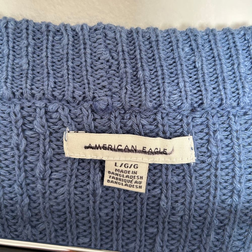 American Eagle Blue Knit Sweater with Brown Buttons Cozy Ribbed Pullover Size L Brand: American Eagle Size: Large Color: Blue Condition: New without tags. Approximate measurements: Armpit to armpit: 23.5'' Length: 19.5'' Material: 63% Cotton, 31% Acrylic, 6% Polyester. Offers welcome. Fast shipping (next business day). This item is new and/or preloved and may/may not have minor flaws. Some clothes are washed and may have scents of laundry detergent. Reference the photos of exact condition and possible flaws. All sales are recorded during package process. All sales are final. Keywords: knit sweater, ribbed pullover, gold buttons, winter sweater, cotton blend, blue sweater, casual wear, womens knitwear, american eagle sweater, cozy sweater