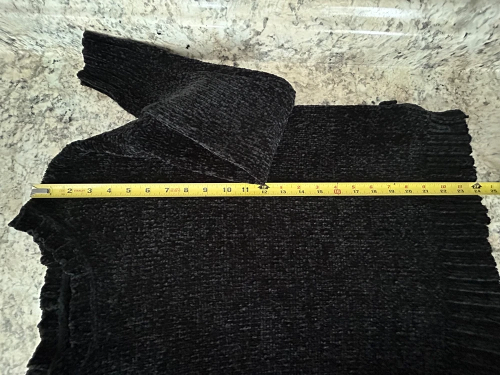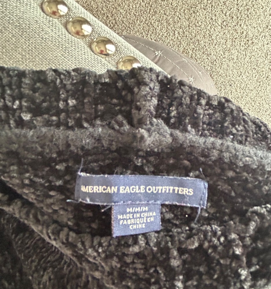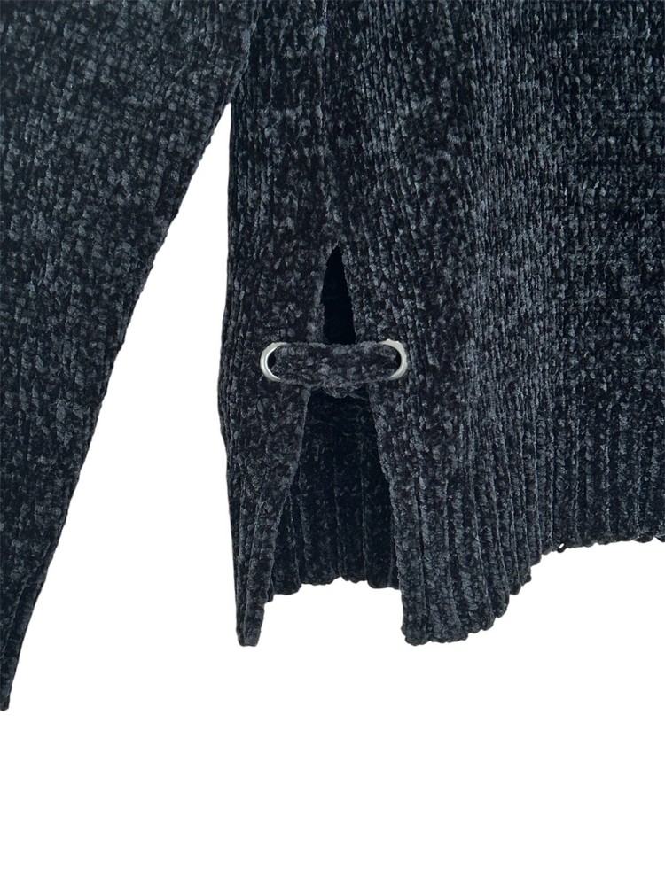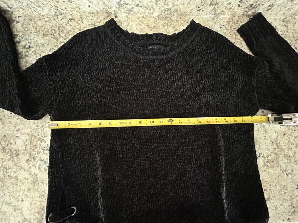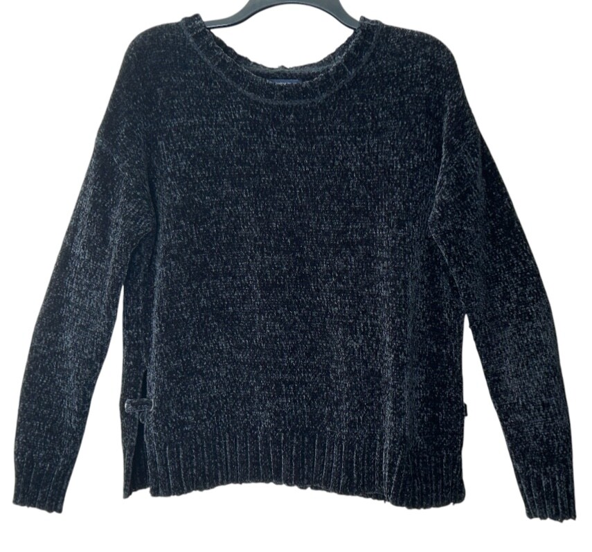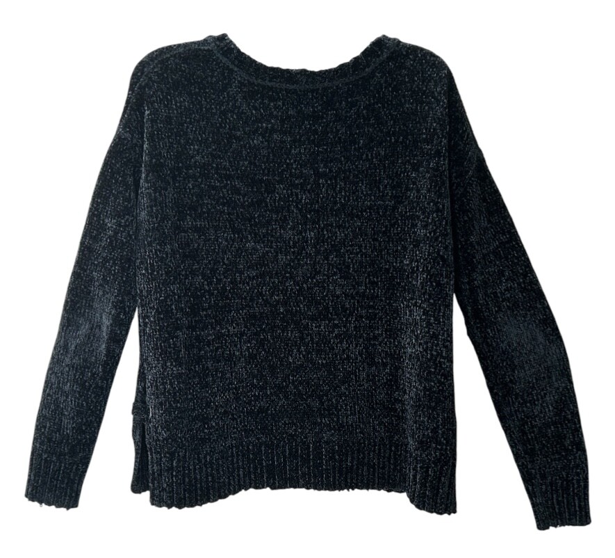 American Eagle outfitters soft, cozy, black Chenille pullover sweater with side ties in size medium. Sweater is in beautiful pre-loved condition. One of the softest sweaters I have ever felt! Crewneck Slightly cropped Side ties with slit about 6 inches up Measurements are approximately 21 inches from side to side lying flat and 24 inches in Length The sweater is a very deep black and may appear lighter in the one photo of the size tag. Please see all photos for close-up and measurement details. All my items come from a smoke-free home I am a seller with a five star rating and speedy same-day shipping Trendy stylish streetwear collegiate pullover ISO feminine dainty boho preppy whimsical warm comty cozy tall winter soft oversized relaxed fit lounge, casual around the house plush
