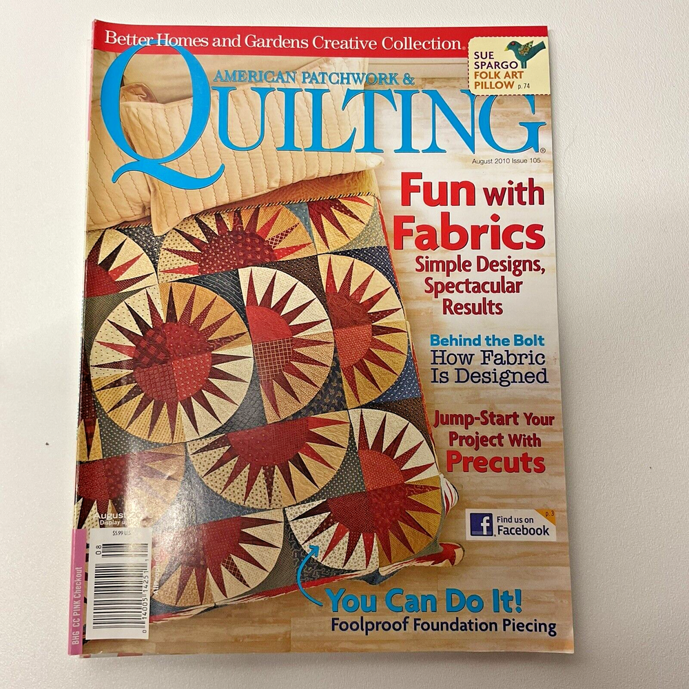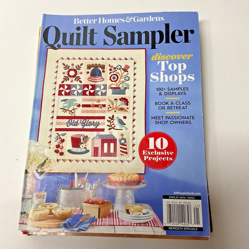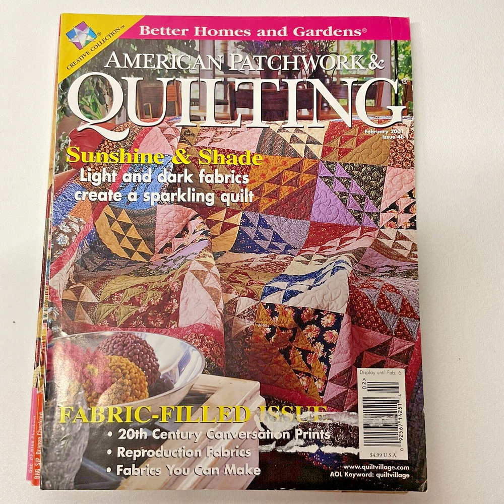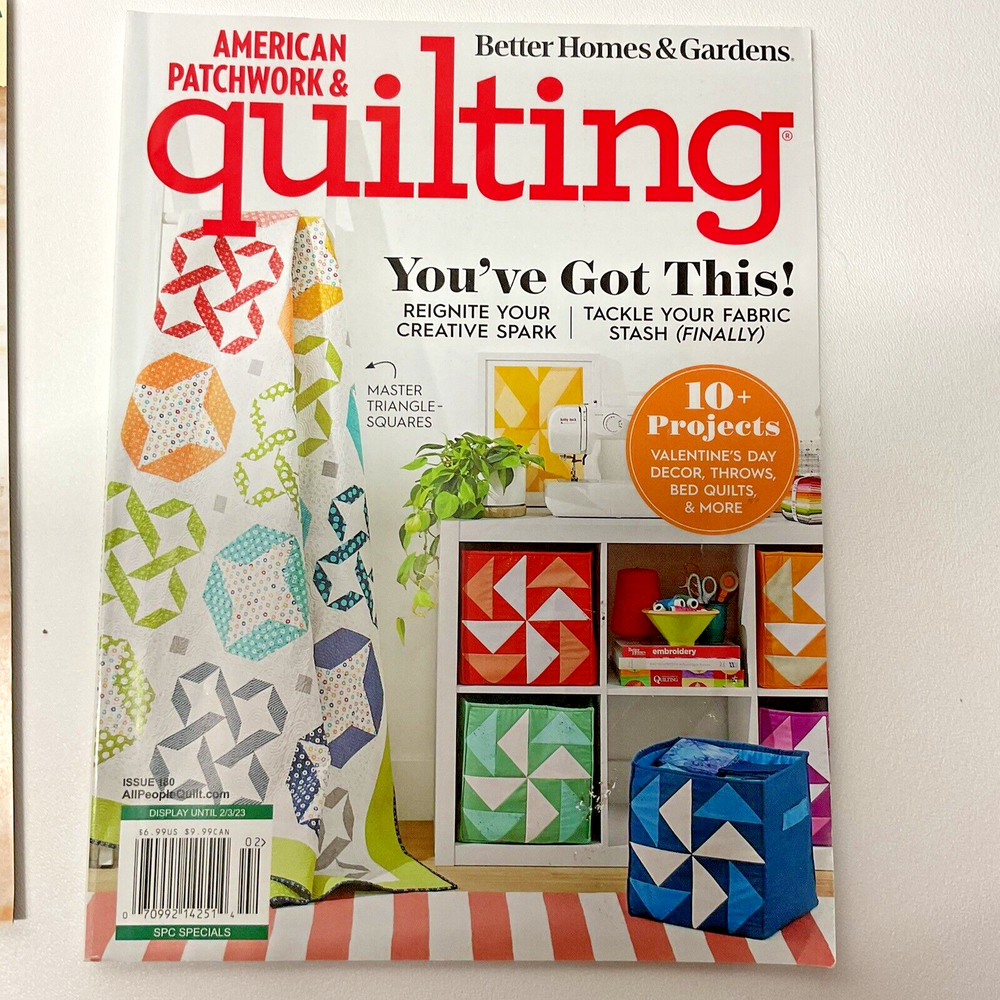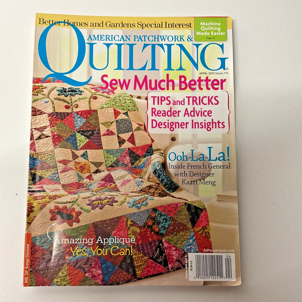 Lot of 7 American Patchwork & Quilting Magazines Sampler Issue 48, 105, 109, 114 Lot of 7 Better Homes & Gardens Magazines - Out of Print 6 American Patchwork & Quilting Back Issues: • 48 - February 2001 • 105 - August 2010 • 109 - April 2011 • 114 - February 2012 • 115 - April 2012 • 180 - February 2023 1 Better Homes & Gardens Quilt Sampler • Spring/Summer 2022 Condition: USED, Please see all photos. Mailing label remnants on Issue 48, 109. Back cover on Issue 180 has light cut marks. Smoke-free Economy Shipping US shipping only; Sorry no international shipping Please ask questions before purchasing - Thank you!