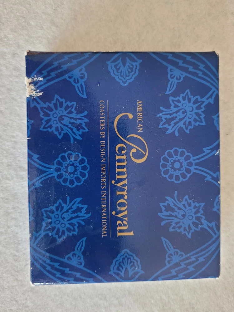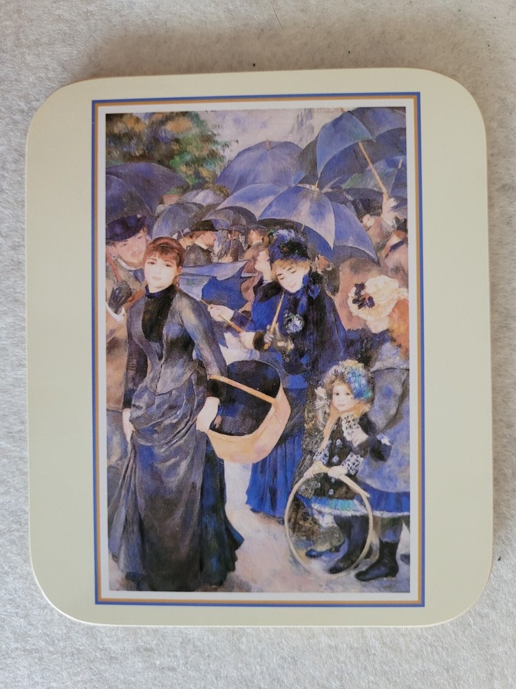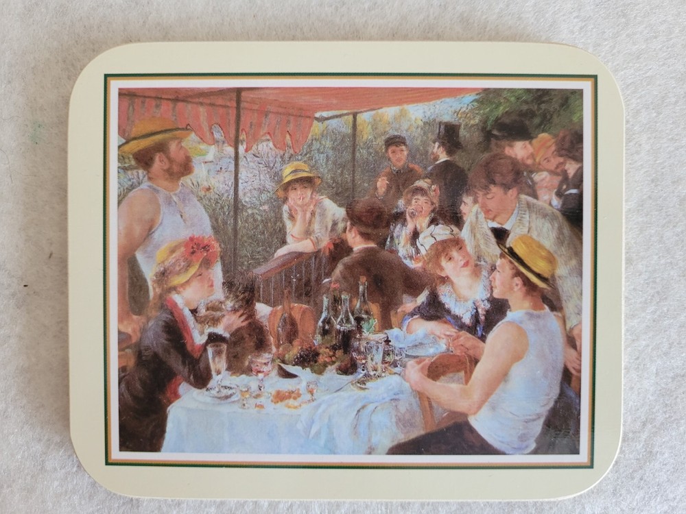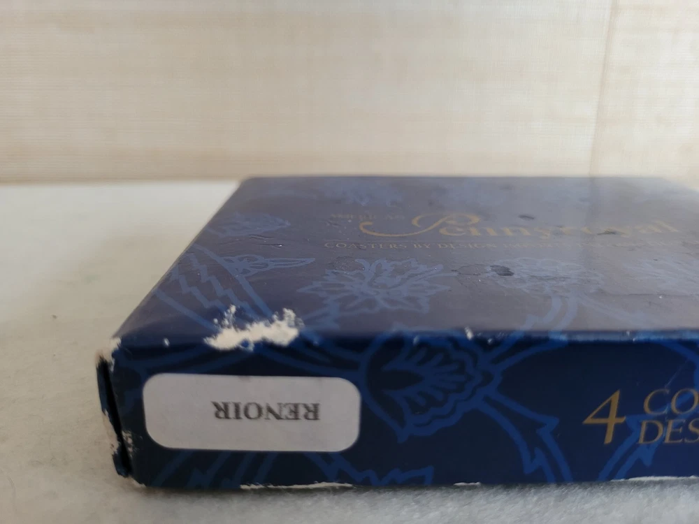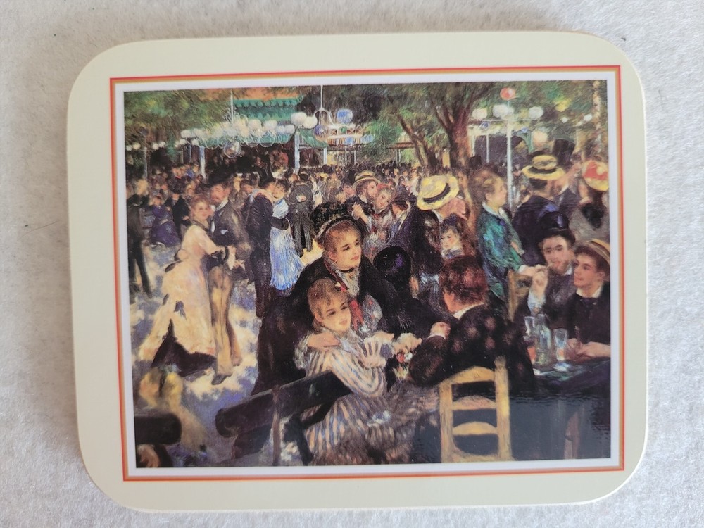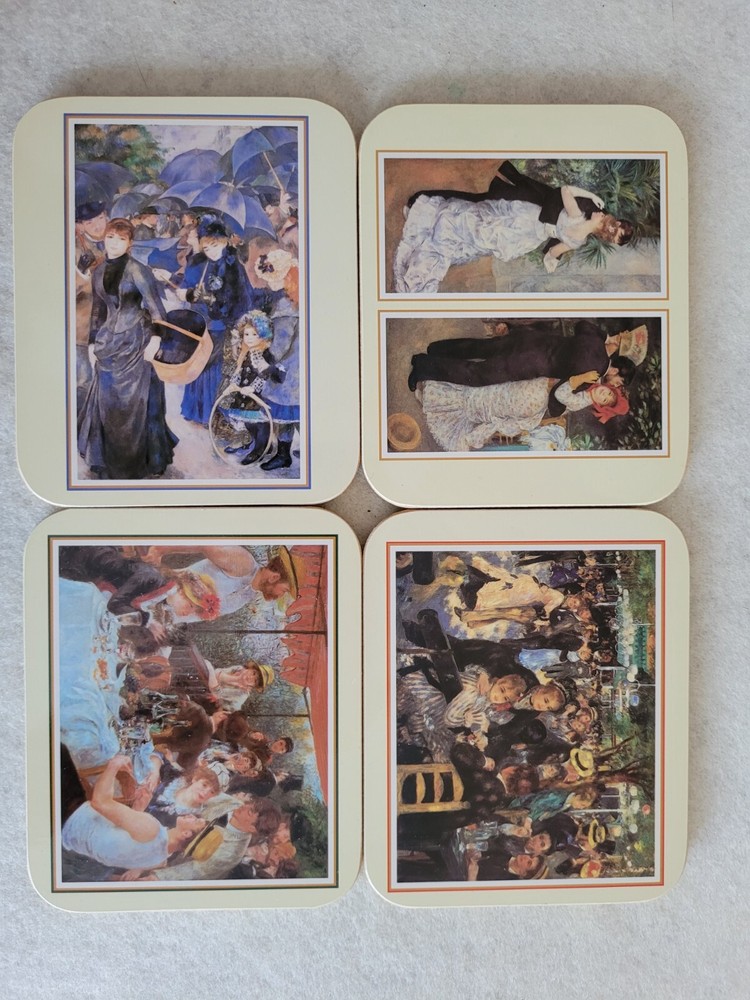 Brand-new, unused, four Renoir coasters. Outside package shows signs of wear due to age. Each coaster shows a different Renoir painting .