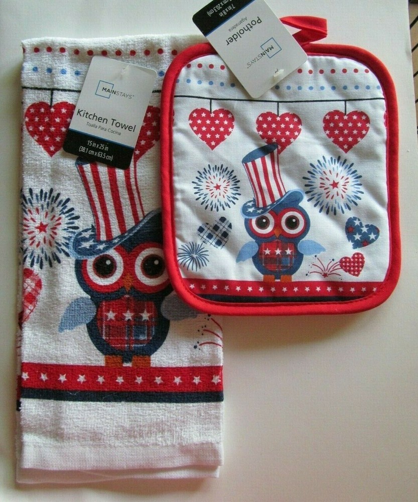 Americana Red White Blue Owl Design Pot Holder, Kitchen Towel Set 1 - Pot Holders 7" x 8" (17.7 cm x 20.3 cm) 1 - Kitchen Towel 15" x 25" (38.1 cm x 63.5 cm) **Disclaimer** Actual color may be slightly different from the picture shown. Please ask questions or concerns you may have prior to purchasing to ensure a positive experience. Penny_Pinching_Jewelry is an online-only business. If purchasing more than 1 item please pay for them all at one time as we do combine items for safest shipping. Items typically ship within 1-2 business days after payment is received.