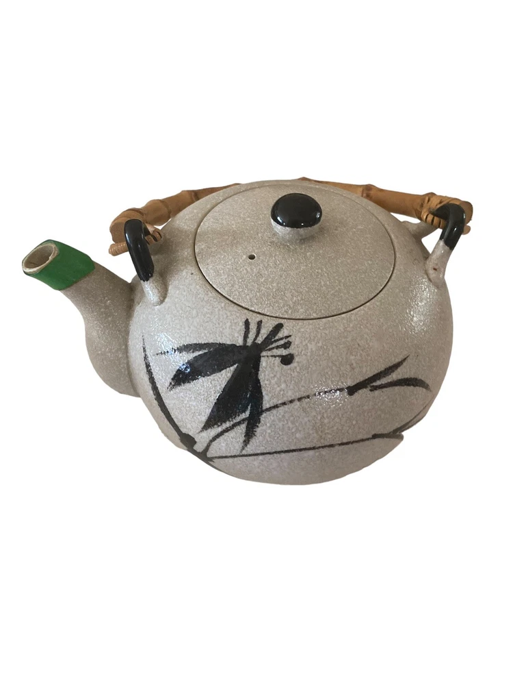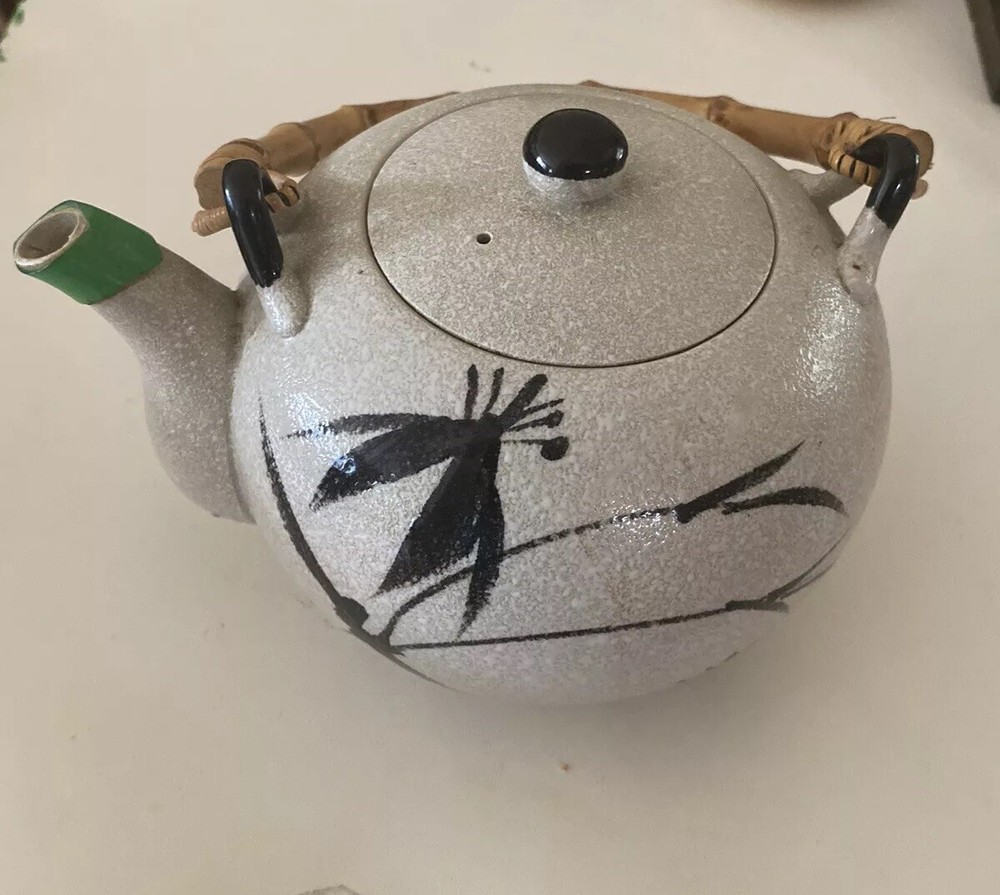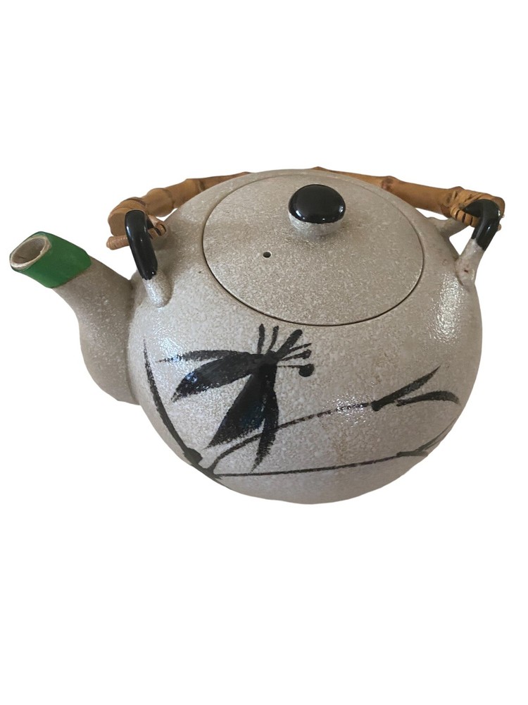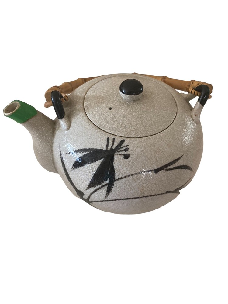 This beautiful teapot from Amthor Imports Japan is a vintage piece with a unique bamboo design. The sand-colored ceramic material is beautifully textured, and the pot has a capacity that is not currently known. The teapot features a reed handle and is made with art pottery production style. The multicolor design is perfect for any tea lover, and the pot was produced using pottery techniques in Japan. Please see the pictures for more details on the finish of the teapot. This original piece is perfect for adding a touch of elegance to any tea party.