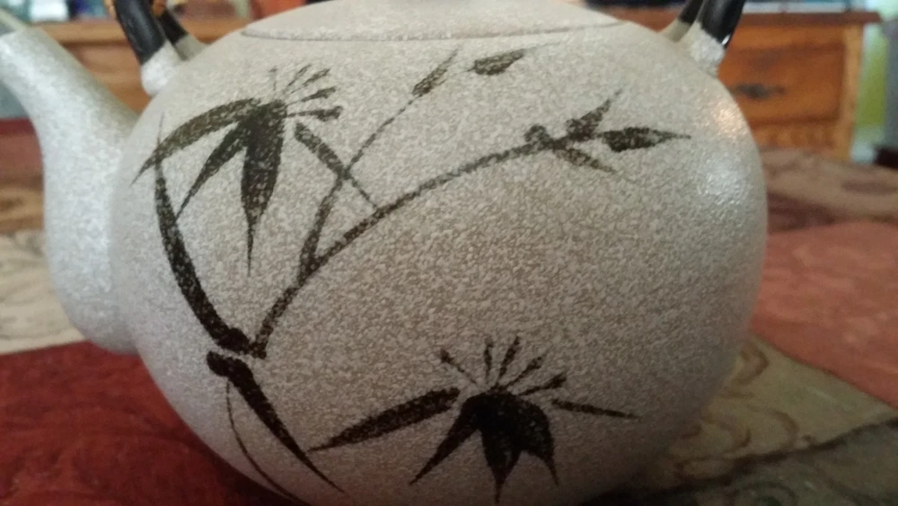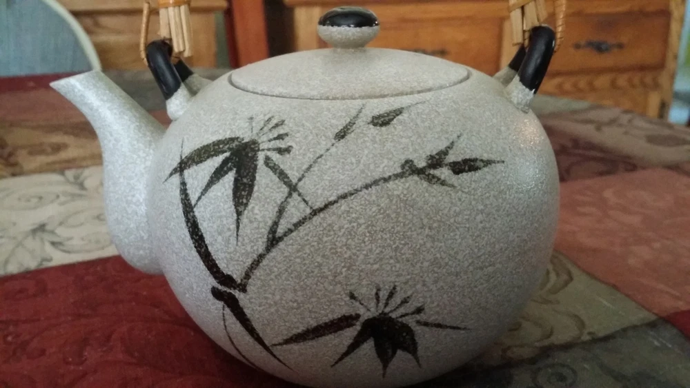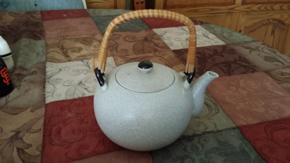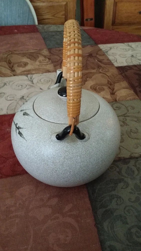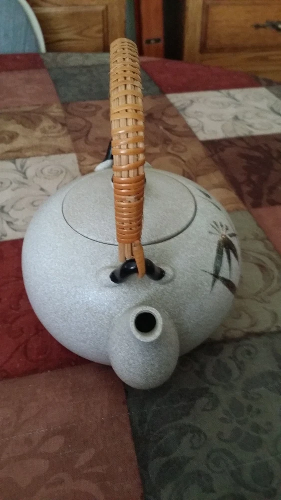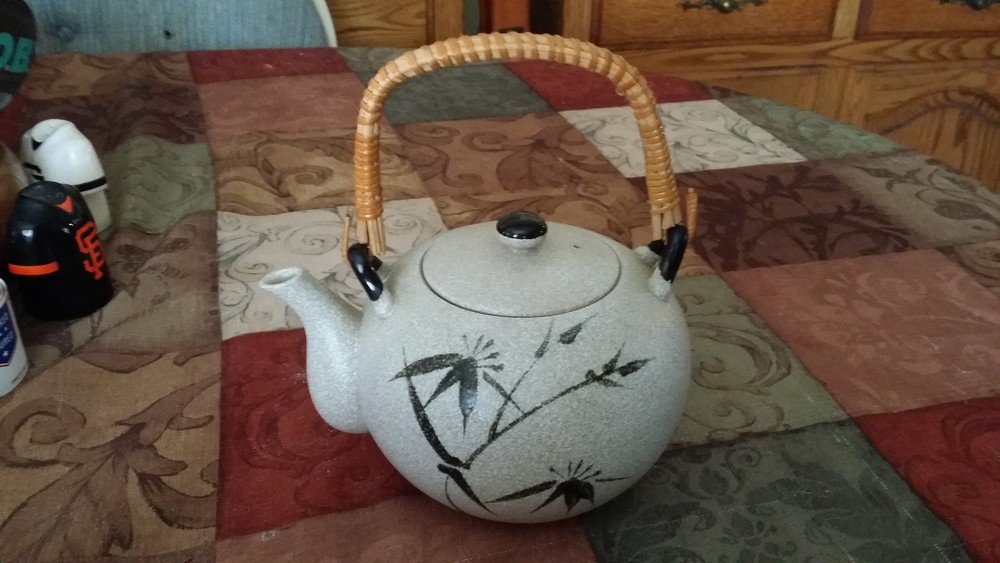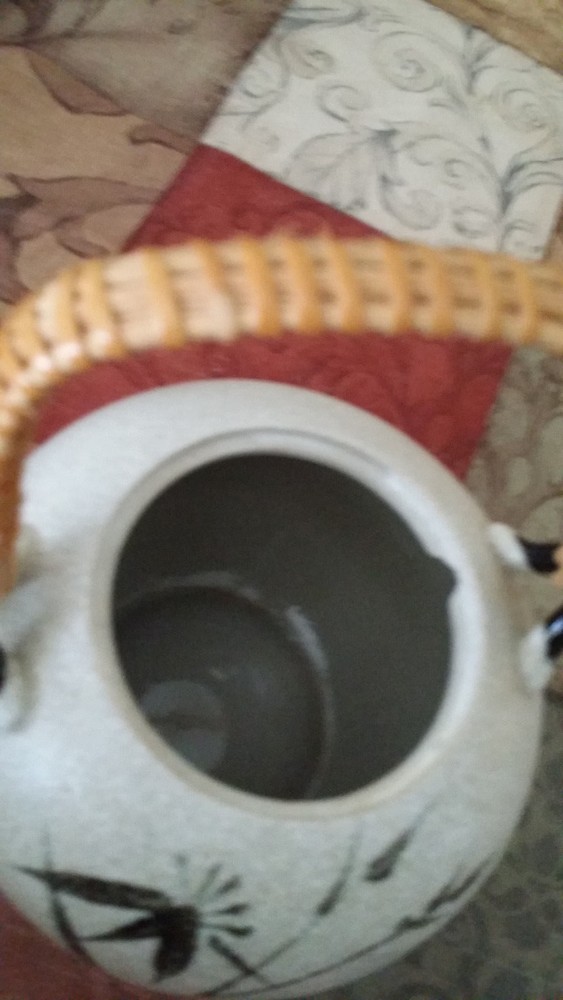 Amthor Imports Japan Sand Colored Textured Teapot with Black Bamboo Design (Location DR L of H) Very nice teapot! When I got this it was taped together, so I didn't realize it has a chip out of the inner rim once the lid is removed. It would still look AWESOME on the shelf for display It measures approximayly: 5 1/2" tall with the lid on x 7 1/2" across including the spout. The height with the handle up would be 8 1/4" Selling AS IS, no information as to history Every effort is made to accurately describe items; some are vintage and / or used and will have wear associated with that. I am not an expert on any items that I sell. No guarantees are expressed or implied and Item(s) are sold AS IS. I have chronic sinus problems, so something may have an odor that I am not able to detect! If you have any questions or need additional information or pictures simply inquire and also please calculate shipping prior to bidding. Reasonable offers are considered, so please ask! Item(s) will be shipped within 1 business days of receipt of payment