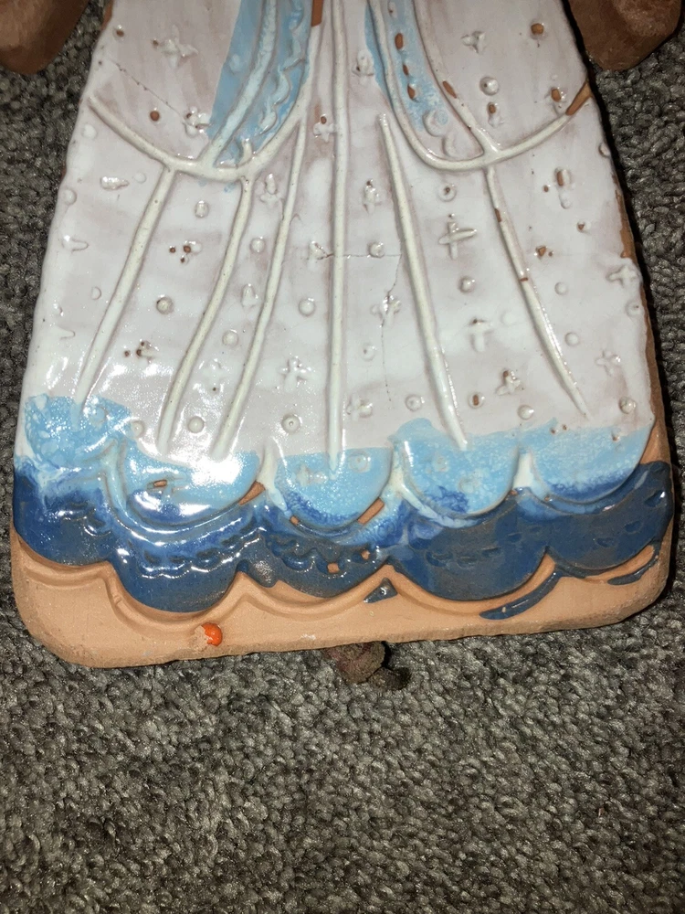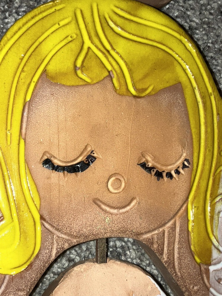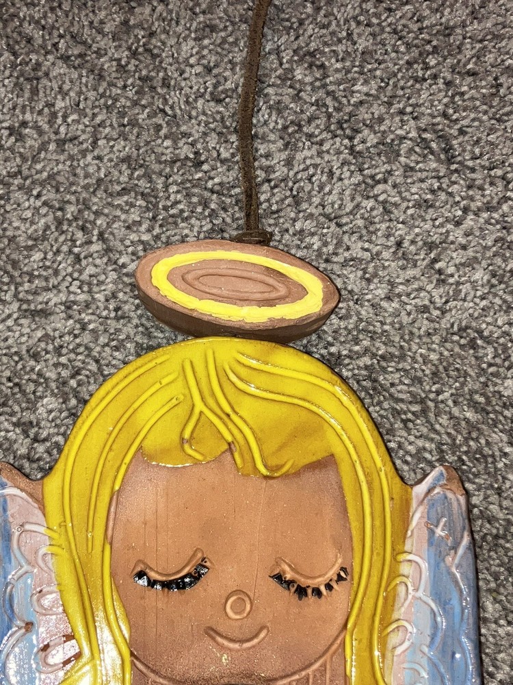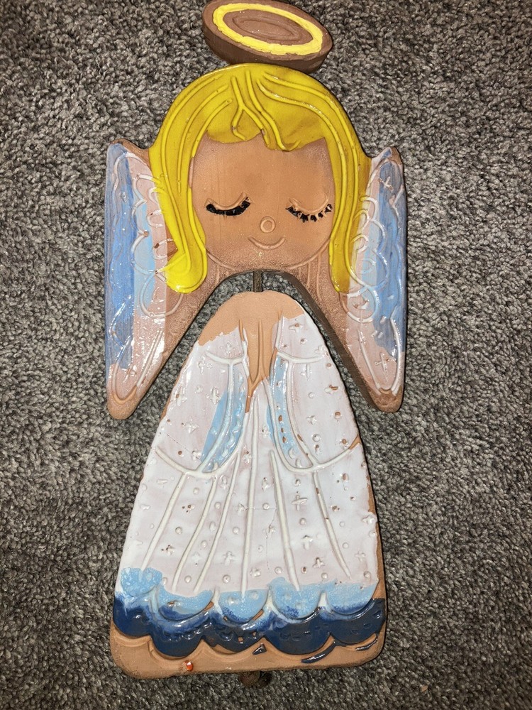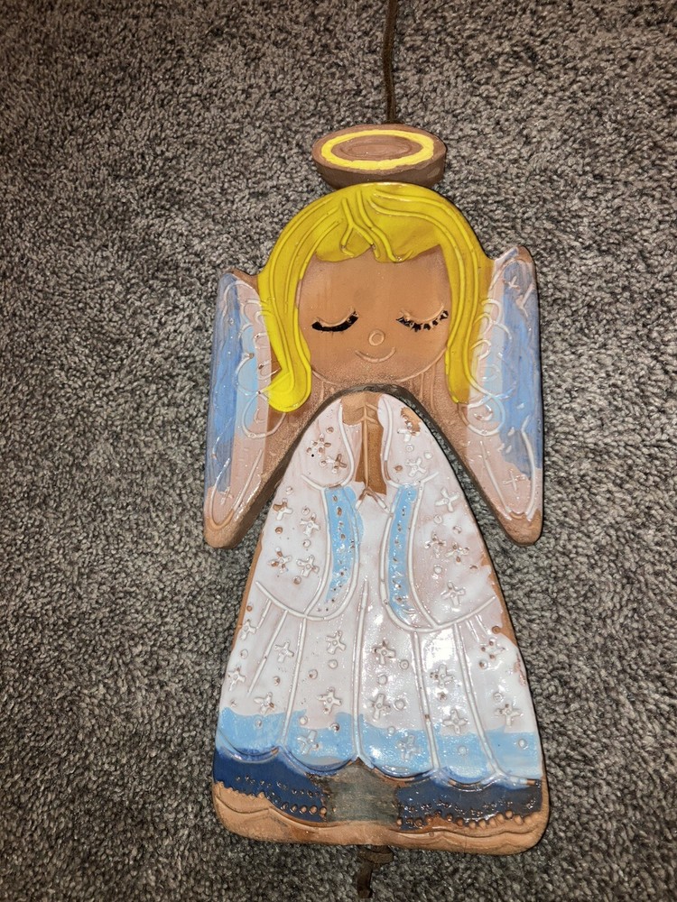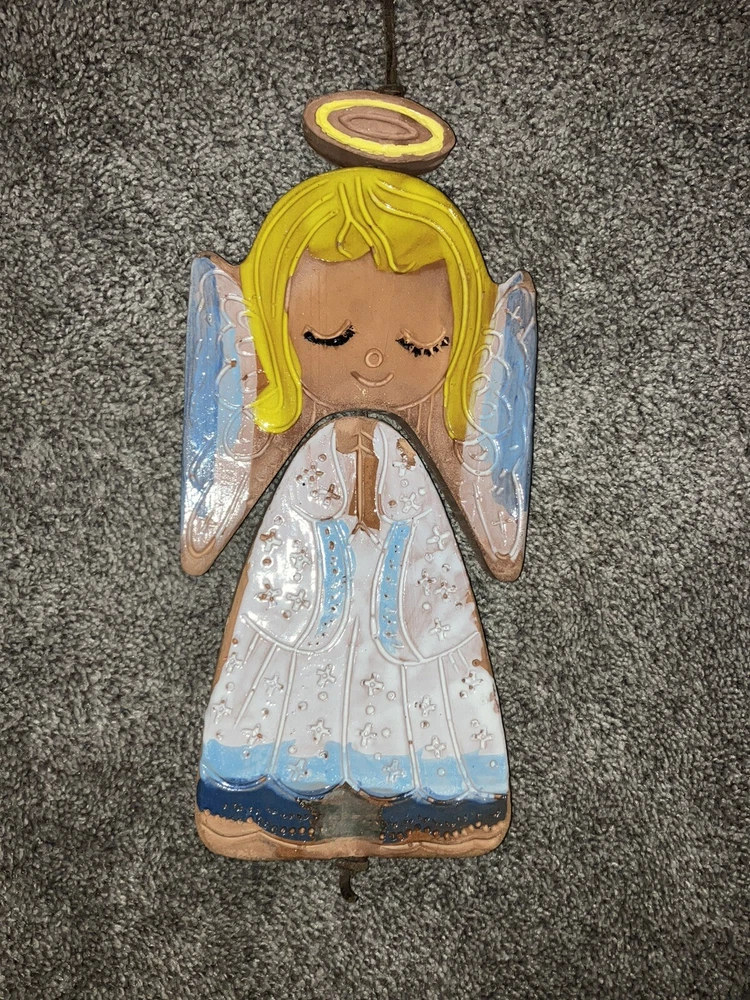 This vintage wind chime decoration features an angel design crafted from clay by Pacific Stoneware Pottery USA in the 1970s. Measuring 5.5 inches in length and 12 inches in height, this multicolored piece is ideal for adding a festive touch to your patio during Christmas or other occasions. Its unique style and subject make it a charming collectible sculpture for any angel-themed collection.