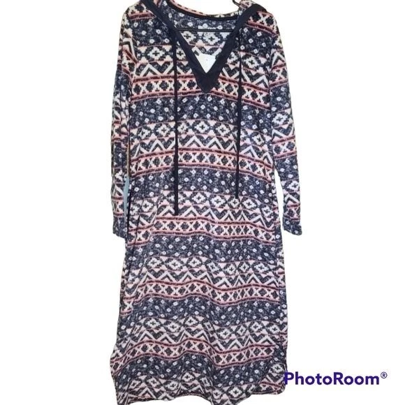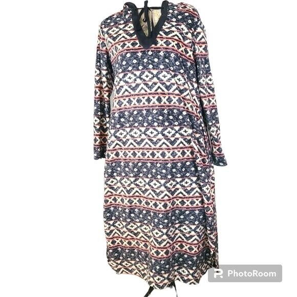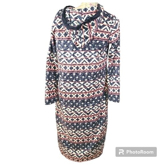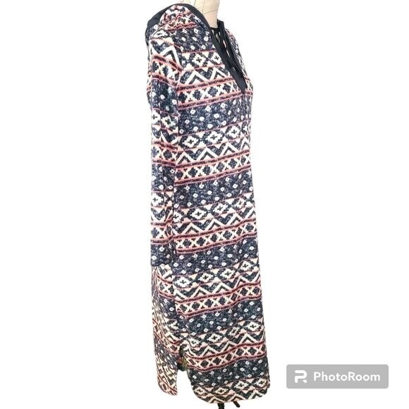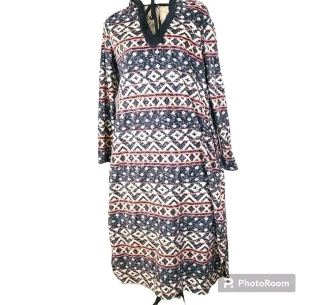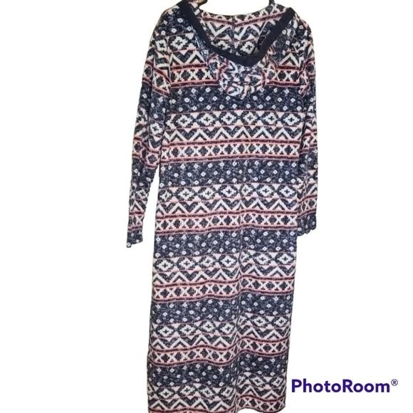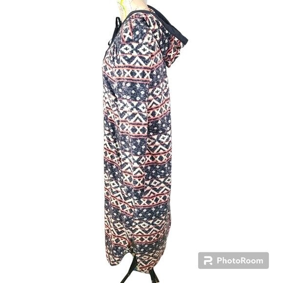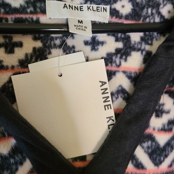 Upgrade your cozy loungewear collection with this Anne Klein Size Medium Gray, White, and Pink Nordic Hooded V-Neck Long Fleece Pullover Robe or Housecoat. This brand new with tags robe offers both style and comfort for those leisurely days at home. The gray, white, and pink Nordic pattern adds a trendy and eye-catching touch to this robe, housecoat. The hooded design provides extra warmth and coziness. The long fleece construction ensures a soft and luxurious feel against your skin. This robe features convenient pockets to hold your essentials and 10-inch side slits for added mobility and style. This Robe is made with super soft and cozy fabric making it the perfect addition to your wardrobe for relaxing mornings or evenings at home. A Great Gift Idea! - Anne Klein robe or housecoat - Gray, white, pink Nordic pattern - Size Medium -100% Polyester -Machine Wash Cold -Imported -String Tie V-Neck -Hooded, Long Length, Long Sleeves, Pockets, 10" Side Slits - Long fleece construction - Super soft and cozy - Brand new with tags (NWT) -Retail $64 Measurements: Flat Lay Underarm-to- Underarm-20"W Waist-22"W Hips-25"W Length-49"L Side Slits-10"L Anne Klein, Robe, Size Medium, Gray, White, Pink, Nordic Print, Hooded Robe, Fleece, Pullover, NWT, Cozy, Housecoat, Mrs Roper Romp, Gift-Giving, Winter Fashion, Loungewear, Soft, Comfortable, Cozy