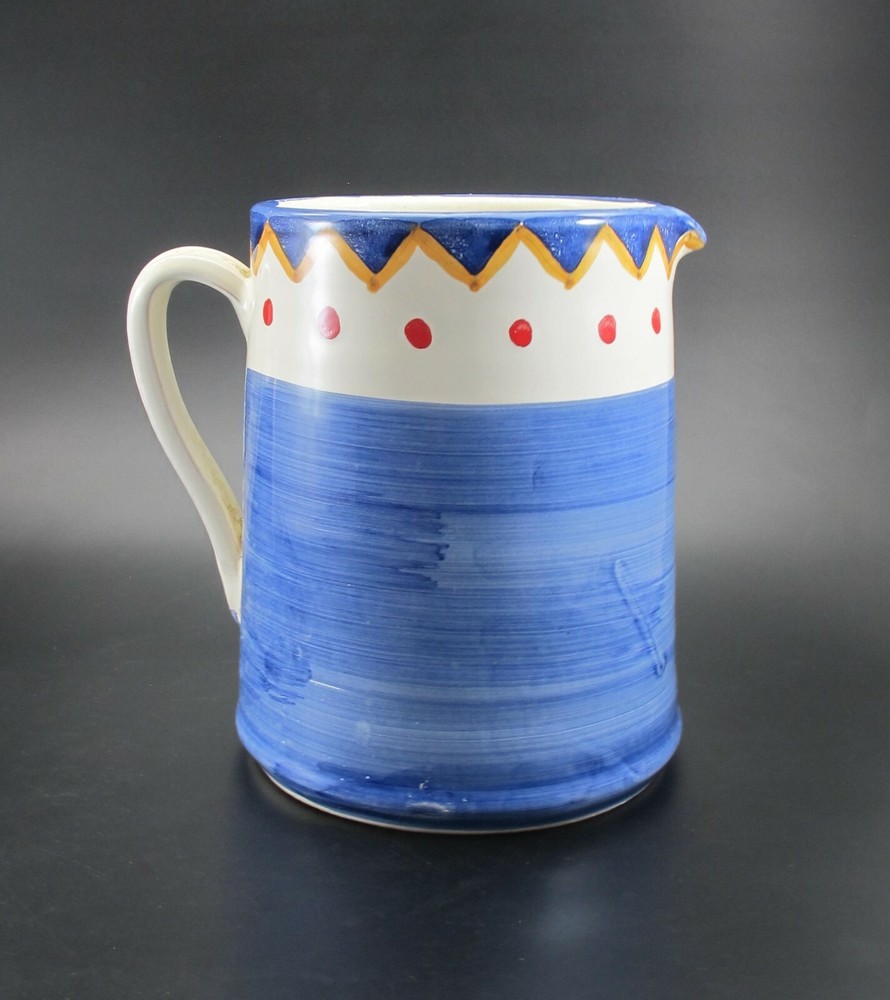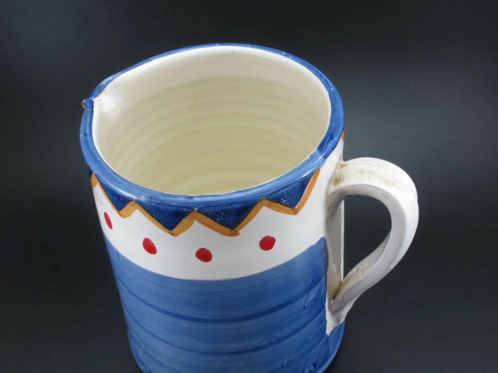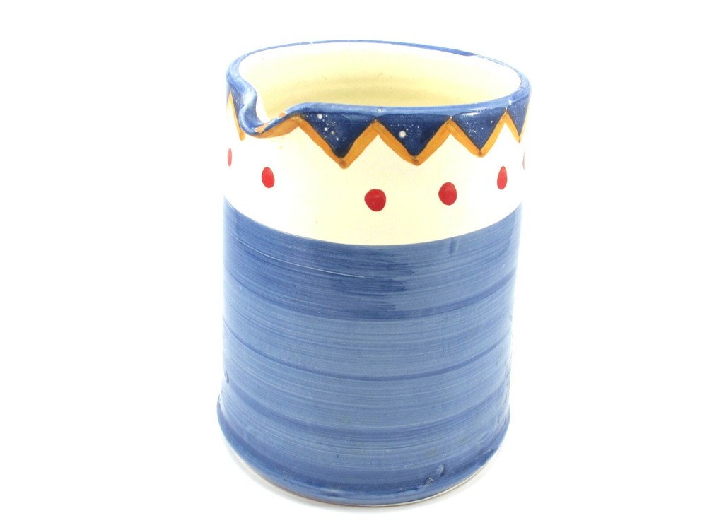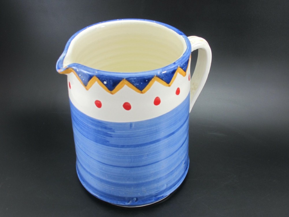 Charming Water Pitcher or Jug– Antica Civilta Artigiana Made in Italy Blue with paint strokes around White handle Red polka dots with yellow & blue zig-zag There is a chip on the spout Terrific for use or display 7 cup capacity 7” tall 7” handle to spout 6” diameter at base ***Thank you for looking!*** Please visit my Store, EVERYTHING DINING, to find many other Treasures. Stop by often and sign up for my Newsletter. Be sure to ask any questions before purchasing. § Please view all photos, item descriptions, and condition description as they are part of the description. § I represent items to the best of my knowledge – age, maker, pattern, etc. § Because of the odd shapes of many items, measurements are my best approximation. § Most items I sell are used, vintage coming from estate sales. Many will show some form of wear, scratches, or imperfections consistent with age and use. Unless they are listed as new, please keep this in mind when purchasing. I make every effort to list any condition issues in the item description. Every item is sold as is. SHIPPING § I ship USPS Priority Mail. § I will combine shipping when viable. Please ask before paying. § I do not automatically insert a packing slip to save on resources. If you need one, let me know. § I ship internationally via the Global Shipping Program (GSP). RETURNS & FEEDBACK § I offer 30 day returns. Items must be received by me in the same condition as sold. Please send me photos of any damaged items. § I send feedback to all of my buyers, but do not do so until the end of the transaction; after the buyer leaves me feedback. This way I know the buyer received the item and is happy with the purchase. § If you are not 100% satisfied with your item, please contact me directly so I can fix the issue before you leave negative or neutral comments.