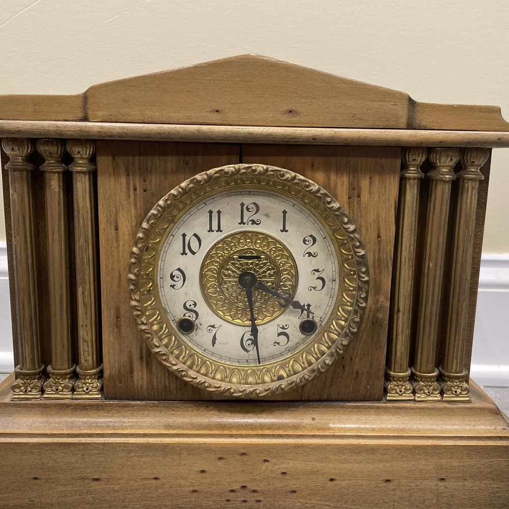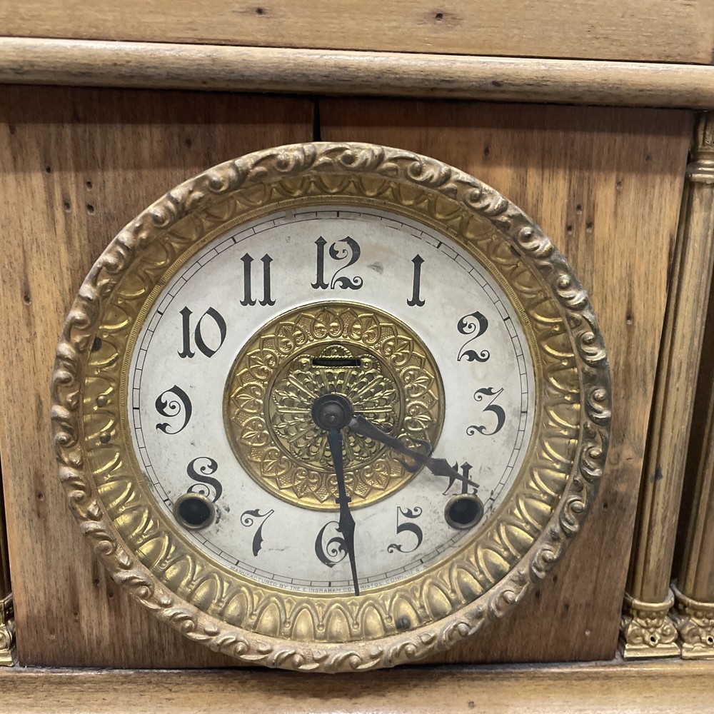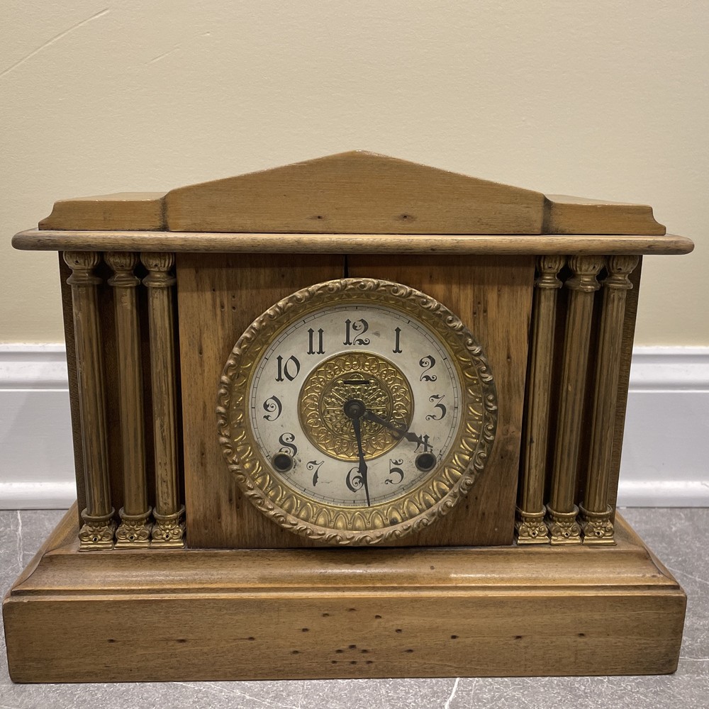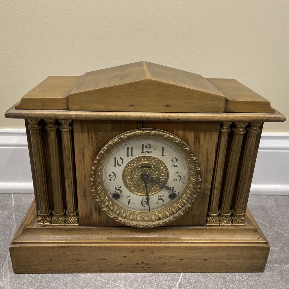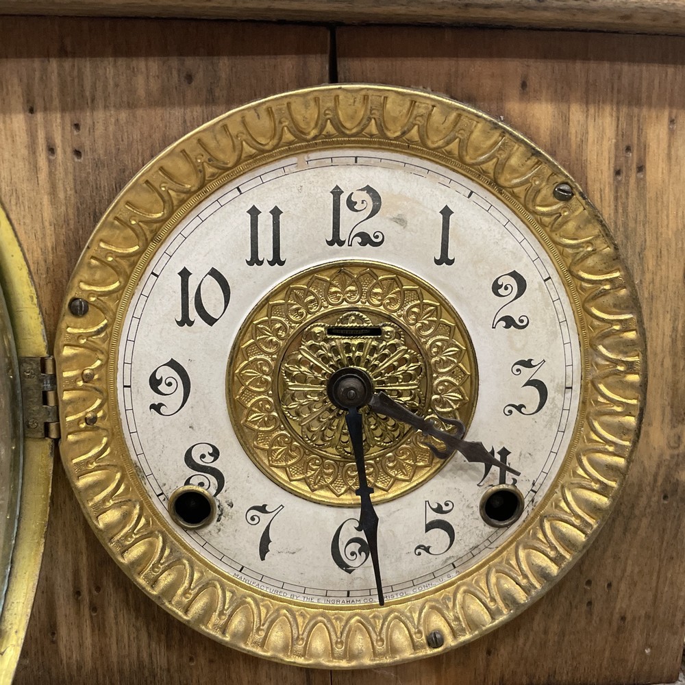 This antique E. Ingraham Co. mantle clock was manufactured in 1905 in Bristol, CT, USA. It features a rectangular shape with a wood finish and stands at 11.5 inches in height. This vintage clock is a key-wind mechanical unit with a winding key included, and it measures 14 3/4 inches in length and 5.75 inches in width. The clock embodies an Edwardian style and is adorned with brass and glass materials, making it a unique and collectible piece ideal for any room. See photos for all details.