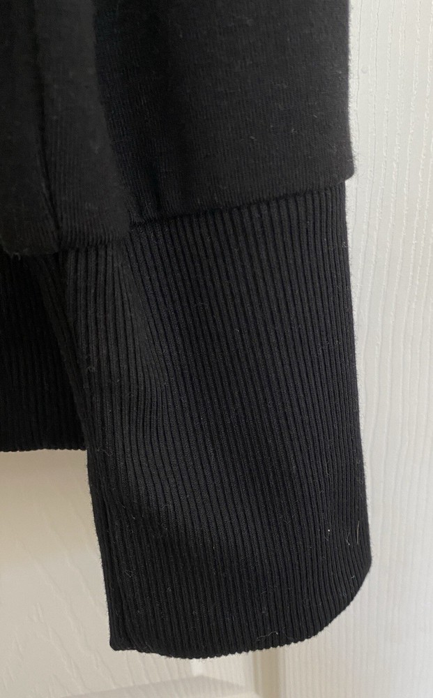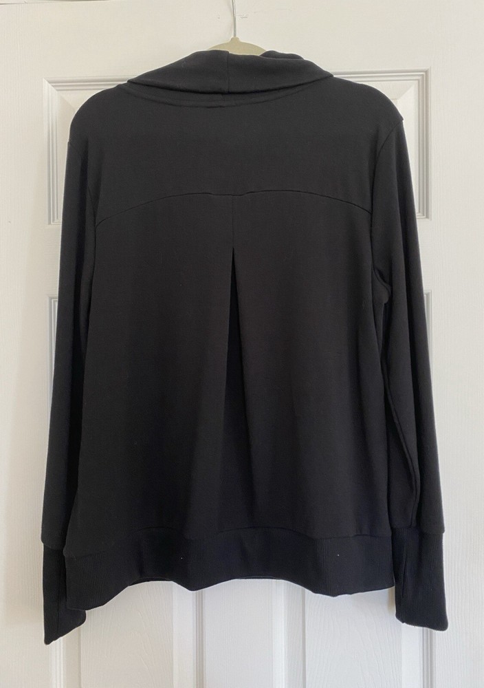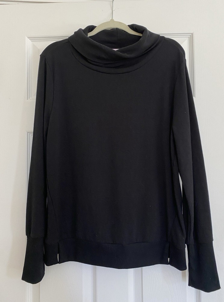This is a stylish and versatile black turtleneck sweatshirt from the brand AnyBody, perfect for casual and travel occasions. The sweatshirt features long sleeves, a pullover closure, and a relaxed fit, making it comfortable to wear. Made from a soft knit fleece fabric blend of polyester, spandex, and rayon, this sweatshirt is machine washable for easy care. The design includes a back pleat for added comfort , and is suitable for winter, fall, and spring seasons. This sweatshirt is a basic yet chic addition to any woman's wardrobe. Brand new without tags Front length is 26” Back length is 26” Sleeve length is 26”