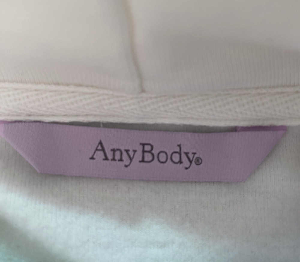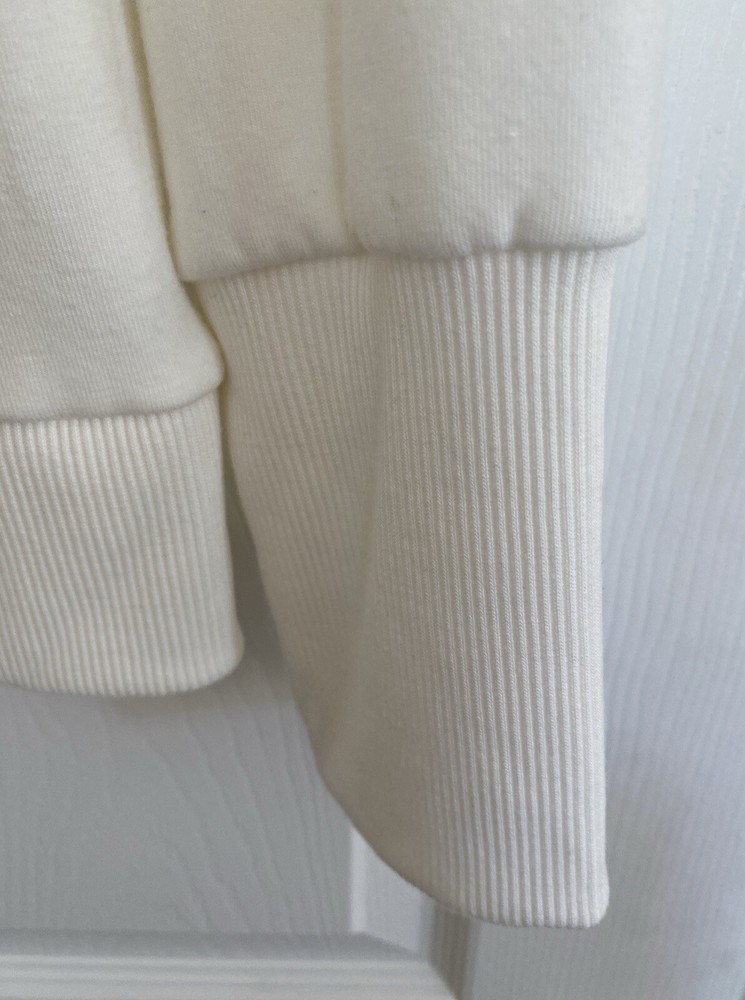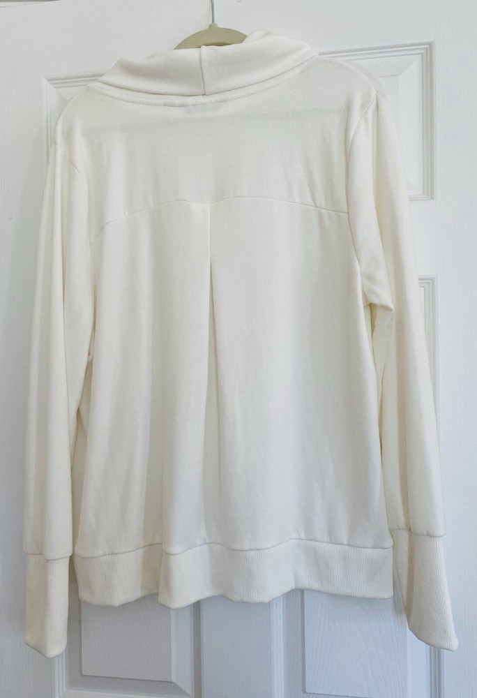 This ivory turtleneck sweatshirt by AnyBody is a cozy and soft top perfect for travel or casual wear. Featuring long sleeves and a relaxed fit, this pullover top has a pleated back for added comfort. Made from a blend of polyester, spandex, and rayon in a knit fleece fabric, this sweatshirt is machine washable and suitable for winter, fall, and spring seasons. Brand new without tags, never worn. Front length is 25” Back length is 26” Sleeve length is 26”