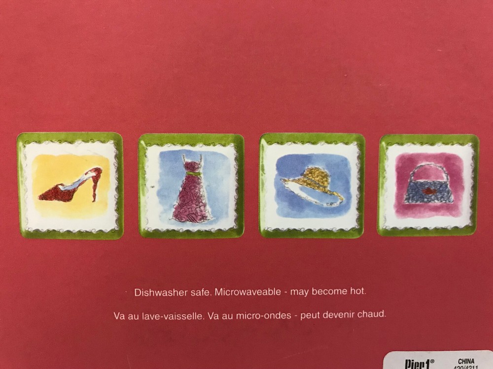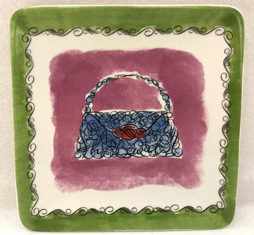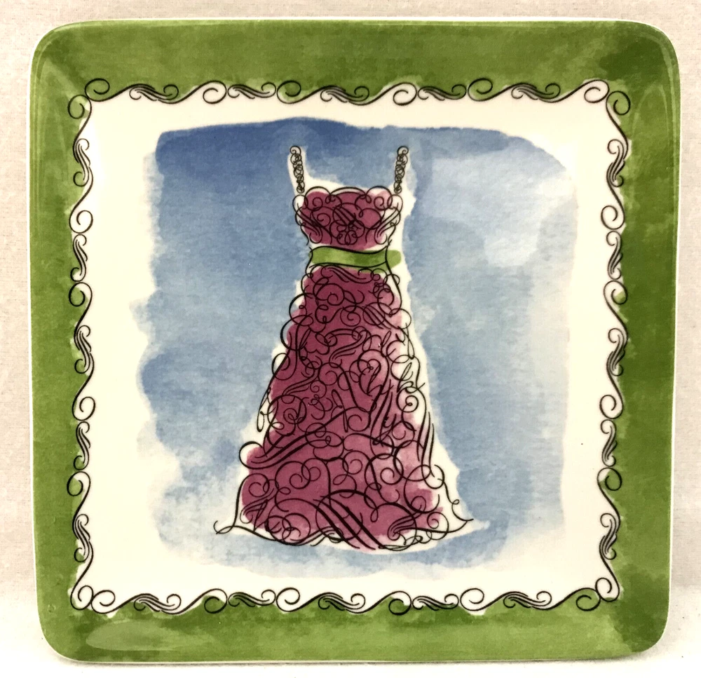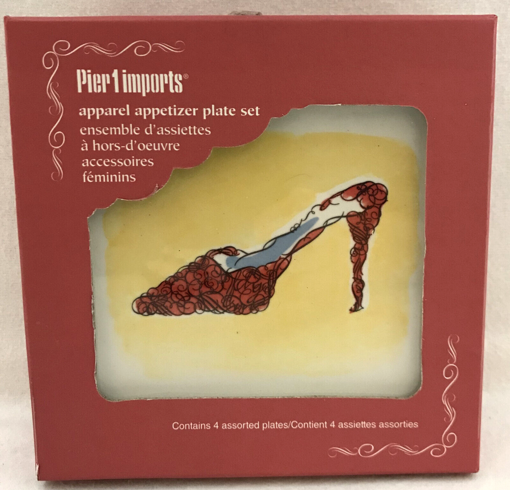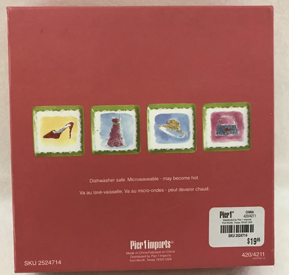 Pier 1 Imports "Apparel Appetizer Plate Set" Set of 4 Earthenware Luncheon/Appetizer Plates Each Plate Has a Unique Apparel Design With A Green Border Including: Dress - Hat - Shoe - Purse All Made of Squiggly Art Drawings The plates measure approximately: 6" Square They are in the original box - unused. They are Dishwasher Safe but May Become Hot in Microwave Oven Made in China Check out my pictures and message me with any questions! SHIPPING CHARGES ARE QUOTED FOR LOWER 48 STATES USA ONLY. For shipping to Alaska, Hawaii and Puerto Rico, please message me requesting shipping cost. Thanks for looking and have a Great Day! 65961 KFL 4182