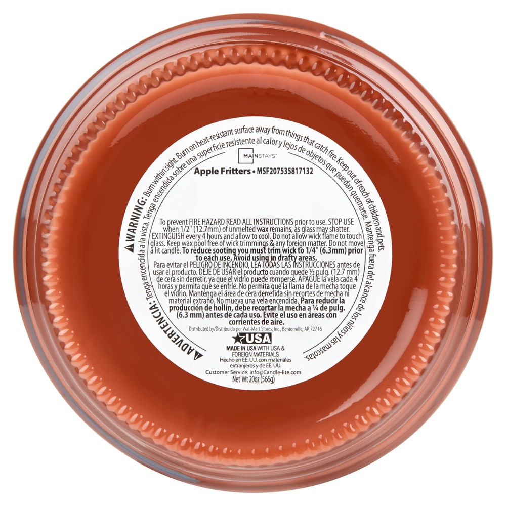Introduce a soothing aroma into your living space with the Mainstays Apple Fritters Scented Single-Wick Glass Jar Candle. Mainstays scented candles are highly fragranced and provide a clean and even burn that will fill your home with beautiful and enticing seasonal aromas. Place this candle in the kitchen, living room or dining room where you can enjoy it when entertaining guests or anytime you want to relax. Trim the wick periodically to promote even burning. Mainstays offers a wide selection of candle scents to explore and enjoy. Shop all of our Mainstays scents online and in-store. Treat yourself to the enticing scent of the Mainstays Apple Fritters Scented Single-Wick Glass Jar Candle. Mainstays Apple Fritters Scented Single-Wick Glass Jar Candle, 20 oz fragrance notes of apple, maple, and vanilla Disperses delightful fragrances of the holiday season throughout your home with Mainstays seasonal scented candles These candles are made with premium-grade wax, clean-burning, and highly fragranced Mainstays offers a wide selection of candle scents to explore and enjoy 20 oz. single-wick candle burns for approximately 100-120 hours Features a decorative beveled edge glass vessel. Mainstays single-wick scented candles are highly fragranced, and provide a clean and even burn that will fill your home with beautiful and enticing aromas Our candles are made from high quality, non-toxic, clean-burning wax that is specifically developed to hold optimal fragrance loads Mainstays Apple Fritters Scented Single-Wick Glass Jar Candle, 20 oz Irresistible notes of fried fritter pastries gleam with deliciously sweet accents of cinnamon-dusted apples swirled with nutty pecans, scrumptious vanilla maple, and pure drizzles of creamy white sugar glaze Complements virtually any room decor 20 oz. single-wick candle burns for approximately 100-120 hours Features a decorative beveled edge glass vessel Mainstays single-wick scented candles are highly fragranced, and provide a clean and even burn that will fill your home with beautiful and enticing aromas Our candles are made from high quality, non-toxic, clean-burning wax that is specifically developed to hold optimal fragrance loads Our Mainstays 20oz candle is available in a variety of scents