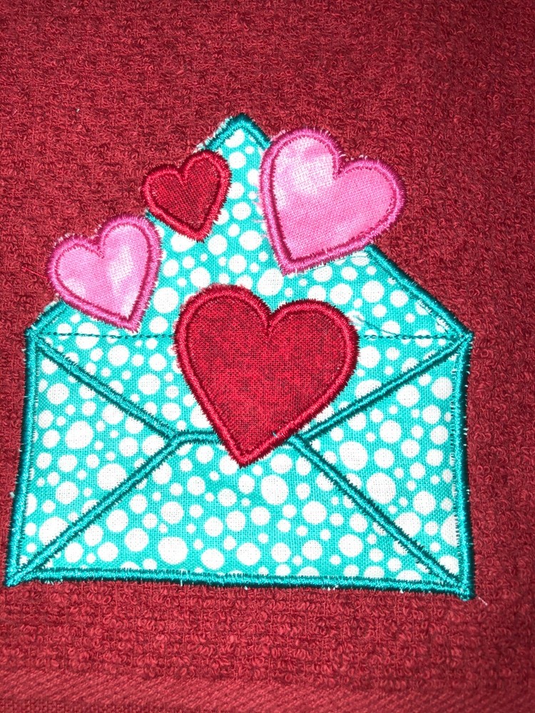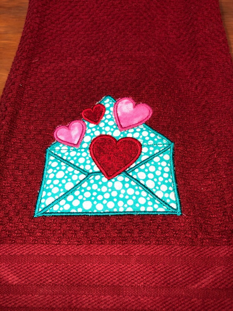 Appliqued Embroidered Red Cotton Mainstays Kitchen Hand Towel Valentine Envelope w hearts BS2715 Design is approx. 3.5" x 4" Hand towel 15" x 25" Note: Some clear water-soluble stabilizer may remain a...
