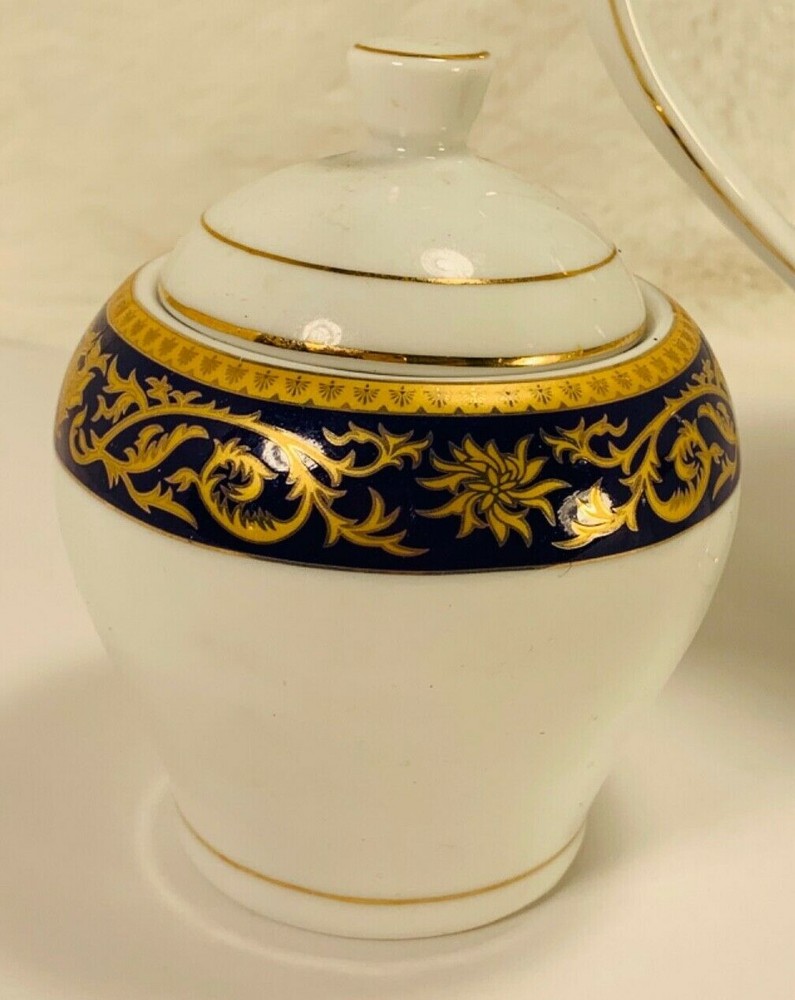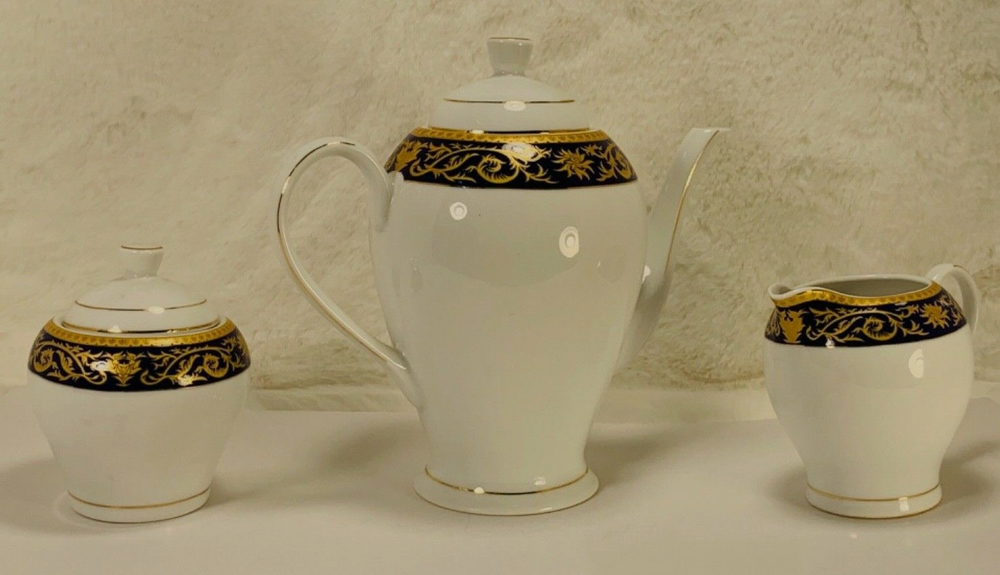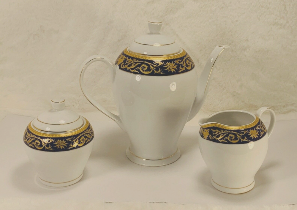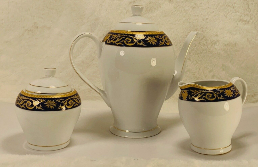Aramco Imports Casati Fine Porcelain 5 Pc Tea/Coffee Pot, Sugar and Coffee pot BLUE/Gold Design Germany...