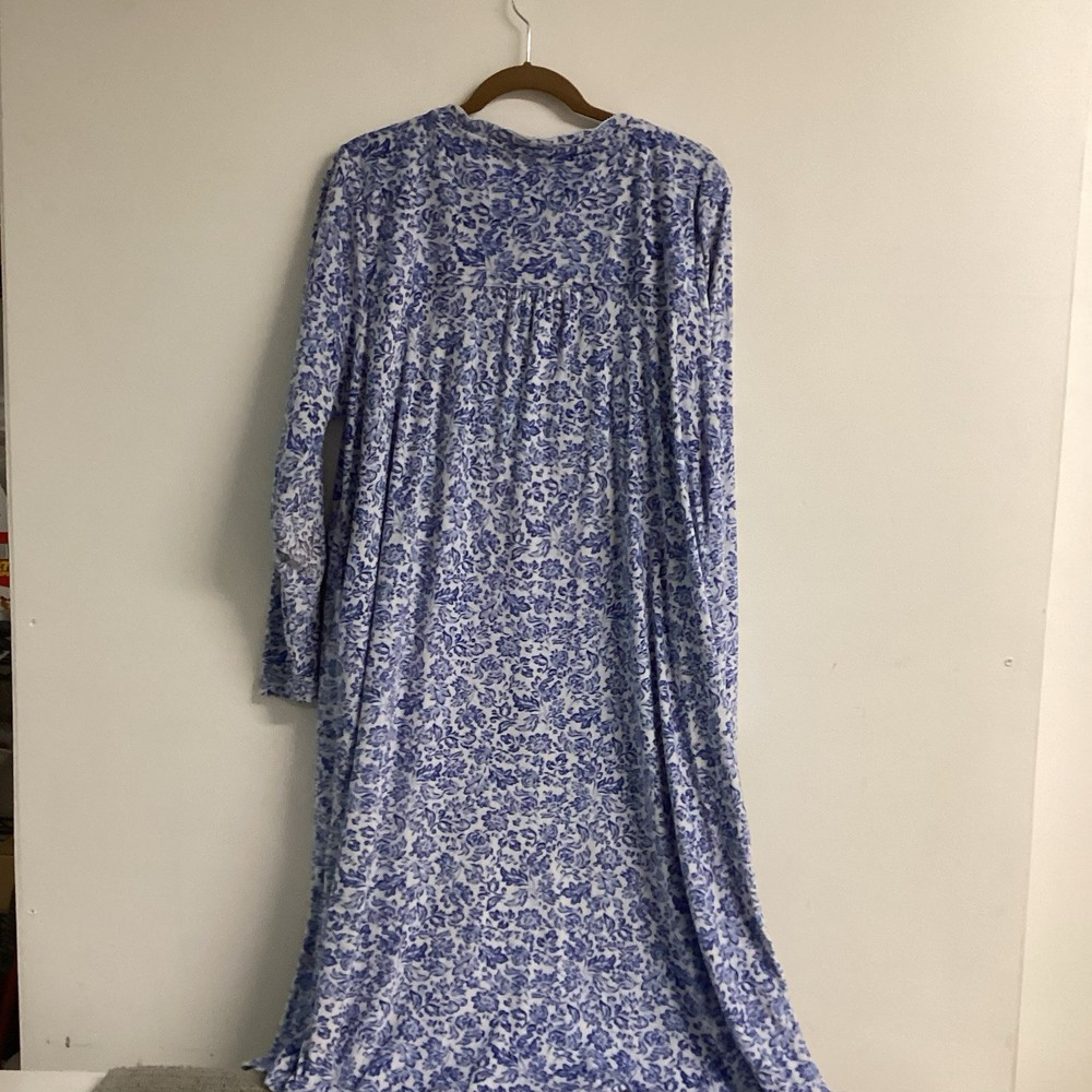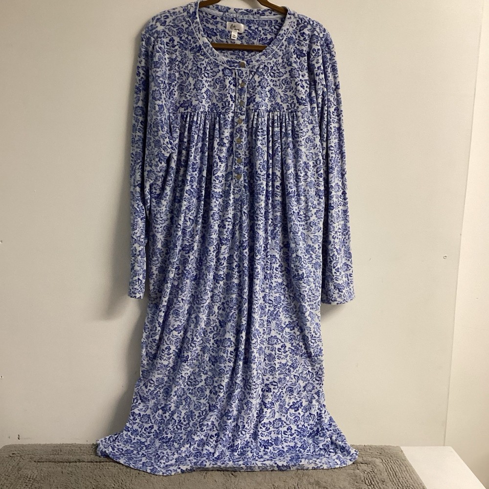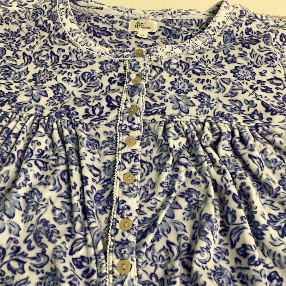 The Aria Collection Nightgown in Blue and White floral is a cozy and warm super soft fleece gown perfect for the colder seasons. This plus size 2X nightgown features long sleeves, a round neckline, and button closure for a comfortable fit. The floral pattern and cottage core character add a touch of classic and soft style to this machine washable loungewear piece from the Aria brand. Ideal for lounging or sleeping, this nightgown embodies a cozy and feminine vibe.