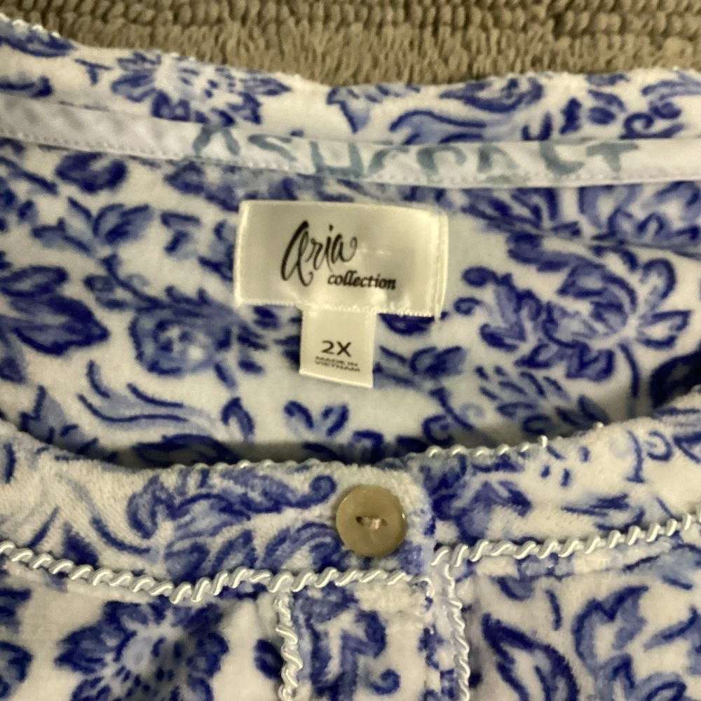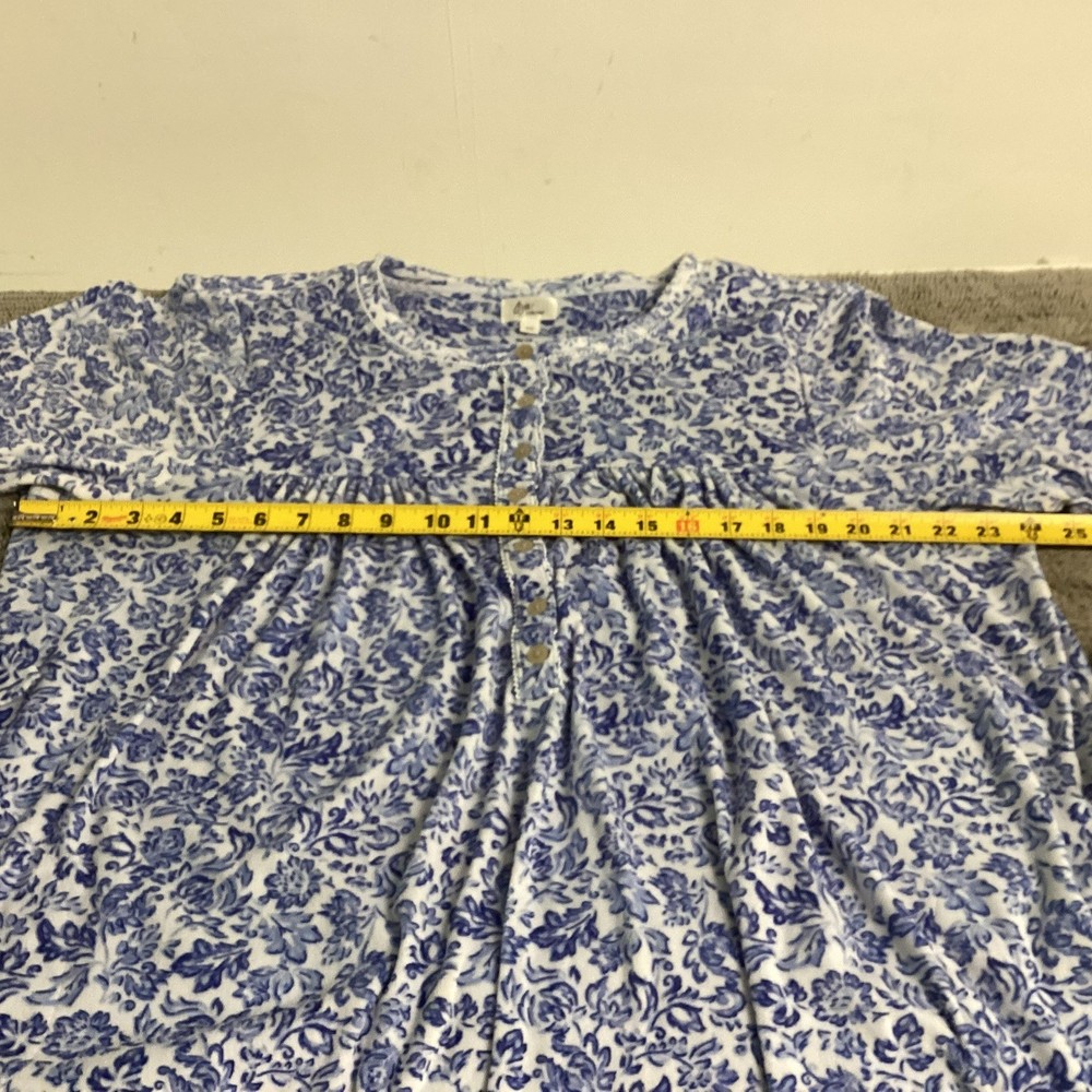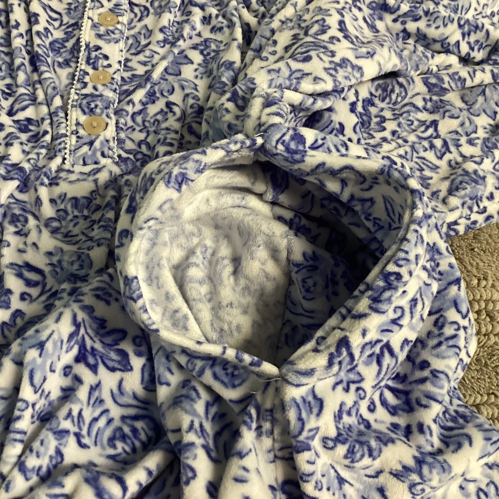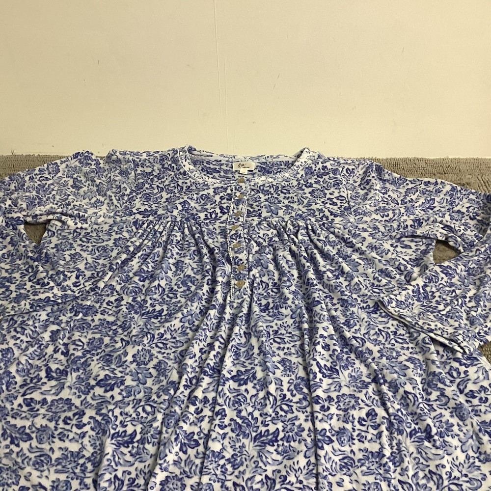 The Aria Collection Nightgown in Blue and White floral is a cozy and warm super soft fleece gown perfect for the colder seasons. This plus size 2X nightgown features long sleeves, a round neckline, and button closure for a comfortable fit. The floral pattern and cottage core character add a touch of classic and soft style to this machine washable loungewear piece from the Aria brand. Ideal for lounging or sleeping, this nightgown embodies a cozy and feminine vibe.