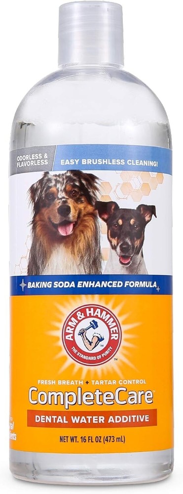 Arm & Hammer Complete Care Fresh Dental Water Additive for Dogs, 16 Fl Oz - Flav Arm & Hammer Complete Care Fresh Dental Water Additive for Dogs, 16 Fl Oz - Flav Product Description Arm & Hammer Complete Care Fresh Dental Water Additive for Dogs, 16 Fl Oz Brand: Arm & Hammer Type: Dog Dental Water Additive Condition: New Size: 16 Fl Oz Color: Flavorless Enhance your dog's oral hygiene with the Arm & Hammer Complete Care Fresh Dental Water Additive. This innovative dog mouthwash is a flavorless dental rinse that freshens breath, fights tartar, and promotes your pet's dental health. Key Benefits: Freshens breath and eliminates tartar buildup Prevents tooth decay and periodontal disease Easy and effective dental care without brushing or rinsing Formulated with natural baking soda for superior odor control Helps maintain clean and healthy teeth and gums for your beloved pet Make your dog's daily dental care routine effortless by adding just one capful of this water additive to 8 oz of your dog's drinking water once a day. Say goodbye to the hassle of toothbrushes and dental chews, and let your dog enjoy fresh oral hygiene by simply drinking their water. Ingredients: Water, Cetylpyridinium Chloride, Sorbitol, Polysorbate 20, Sodium Bicarbonate, Tetrasodium Pyrophosphate, Proteases, Thymol, Sodium Chloride, Zinc Gluconate, Sodium Benzoate, Potassium Sorbate Your Satisfaction is Our Top Priority: Contact Fetch for Pets for any questions or feedback. Don't compromise on your dog's dental health! Invest in Arm & Hammer Complete Care Fresh Dental Water Additive now and ensure a happy and healthy pet. Buy now to secure this great deal and give your dog the gift of fresh breath and strong teeth!