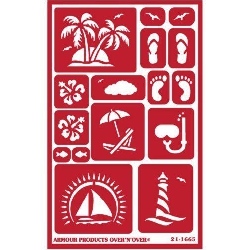 Armour Reusable Over n Over Glass Etching Stencil - ONO Paradise Armour Reusable Over n Over Glass Etching Stencil - ONO Paradise Description: Over n Over stencils ONO Paradise Part #: 21-1665 These stencils can be used in combination with other stencil sheets from the nautical series. An easy and economical way to create one of a kind etched designs to decorate household glassware, and drink-ware. sizes are approx... width x height. palm trees 2.5 x 1.75" seagulls .5 x .5" sandal .5 x 1.0" feet .5 x 1.0" flower 1.0 x 1.0" cloud 1.5 x .5" umbrella 1.5 x 1.5" snorkel 1.0 x 1.5" sail boat .25 x 1.75" lighthouse 1.5 x 2.75" ARMOUR PRODUCTS-Over'n'Over Re-usable Glass Etching Stencils are flexible multi-use stencils that easily adhere to glass mirror ceramics metal and other non-porous surfaces so you can easily decorate and personalize your project that involves sand etching glass etching or painting. Use these stencils with our Armour Etch glass etching cream, water-based paints and even Body and Face Painting Sand Blasting Each stencil can be reused between 15-20 times depending on the amount of pressure, care of use, distance between the tip of the blasting gun and the stencil, and the type of abrasive (we recommend between 180-220 grit size preferably 220). Visit our eBay store for more painting & craft supply needs! Listing and template services provided by inkFrog