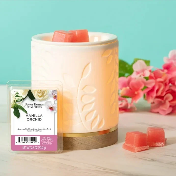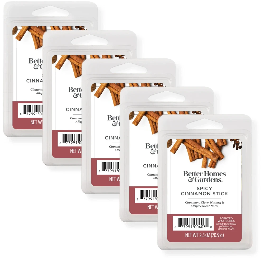 Assorted Better Homes&Gardens Scented Wax Melts, 2.5 oz 5 pack, Choose Scent. Description. Better Homes & Gardens 2.5 oz Spicy Cinnamon Stick Scented Wax Melt features a strong and enticing smell of cinnamon, embellished with notes of crushed clove bud and overlaid with the sweet essence of nutmeg and a hint of allspice. Better Homes & Gardens 2.5 oz Spicy Cinnamon Stick Scented Wax Melts are for use in an electric wax warmer and release a soothing highly fragrant scent into the air immediately upon melting. They are ideal for spreading a relaxing scent and welcoming atmosphere throughout your home. Simply break off a piece and add it to your favorite electric wax warmer. Highly fragranced. Releases a soothing fragrant scent. Replace wax melts when fragrance is gone. Easy clean up. No flame or soot residue. Wax can be recycled or reused. Use with Electric Wax Warmer.