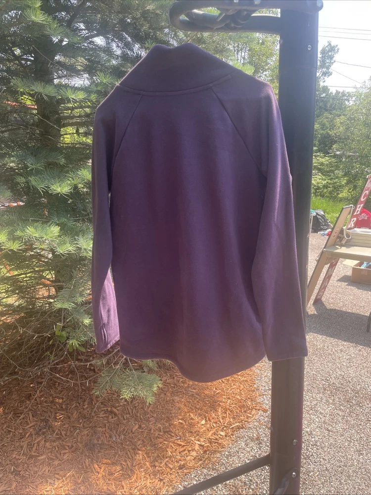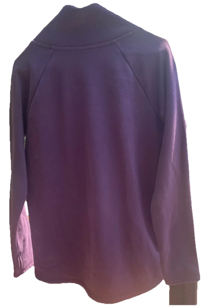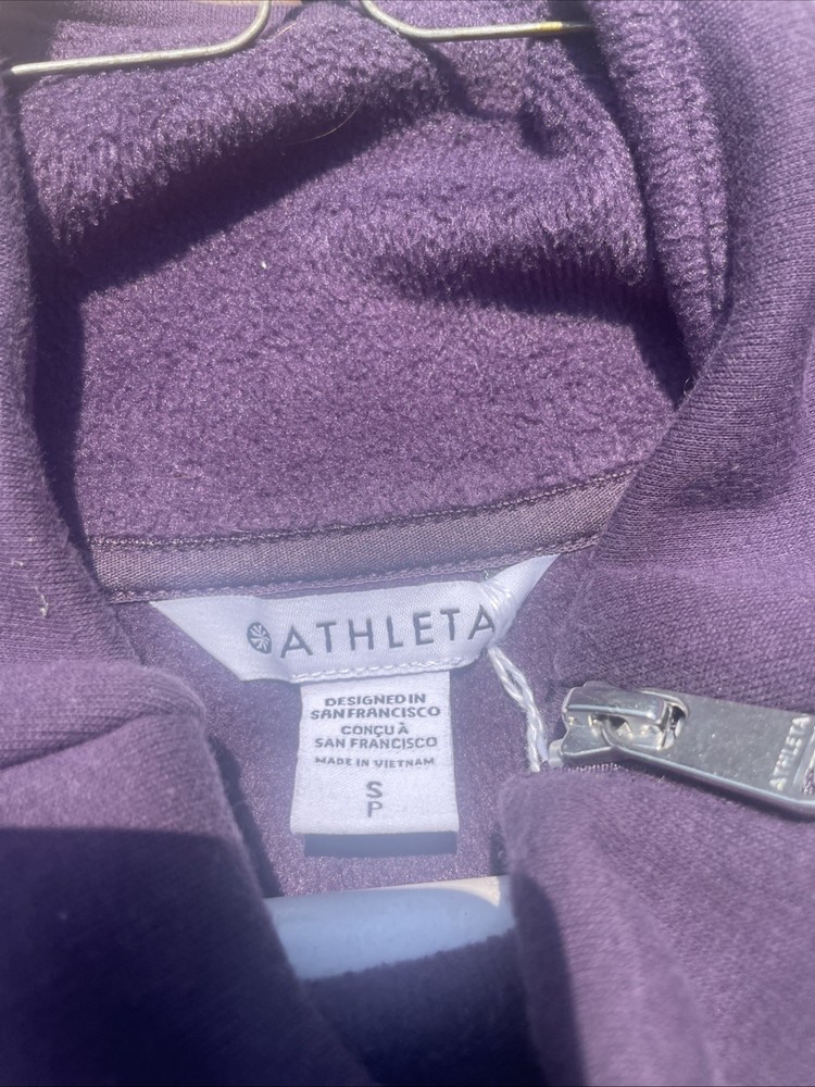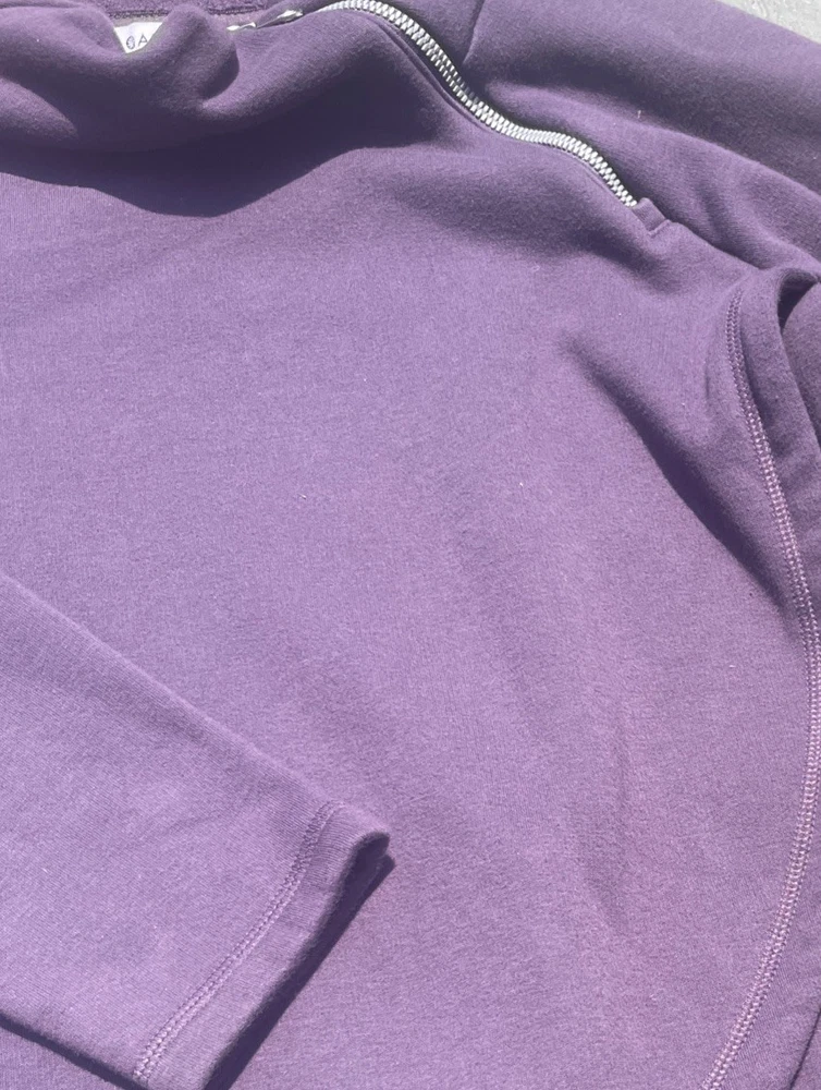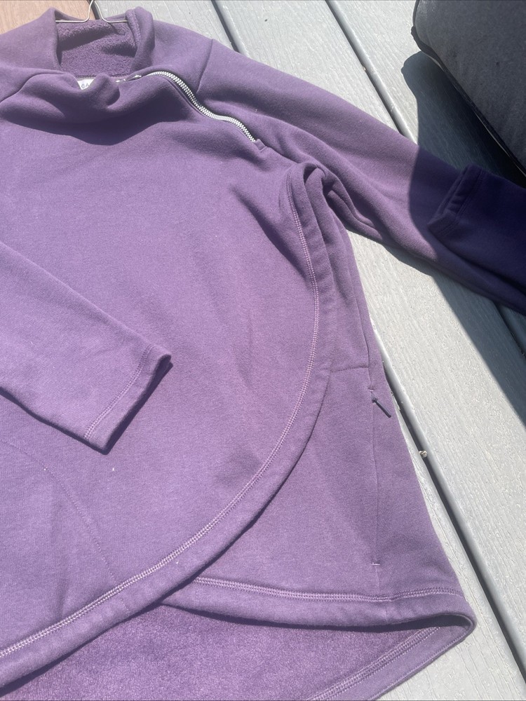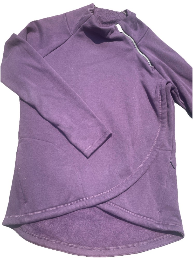The Athleta Small Cozy Karma Funnel Neck Oversized Sweatshirt in Plum Cabernet is a stylish and comfortable activewear option for women. This pullover sweatshirt features long sleeves, a regular fit, and an oversized design for a relaxed and cozy feel. Made from blended fabric, this purple sweatshirt is perfect for casual outings or workout sessions, with a convenient zipper accent adding a trendy touch to the classic pullover style.