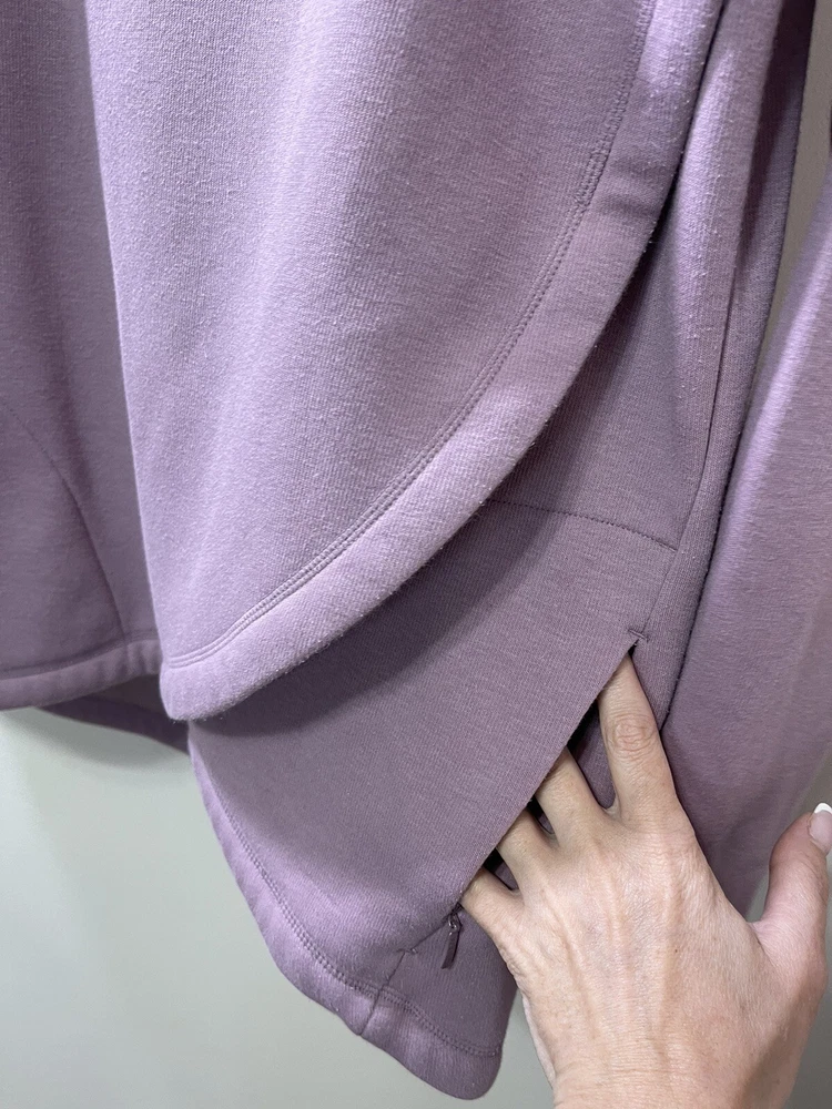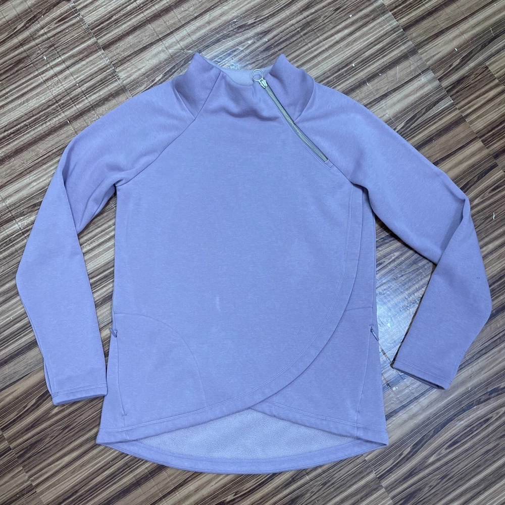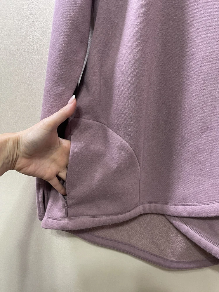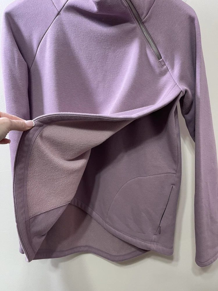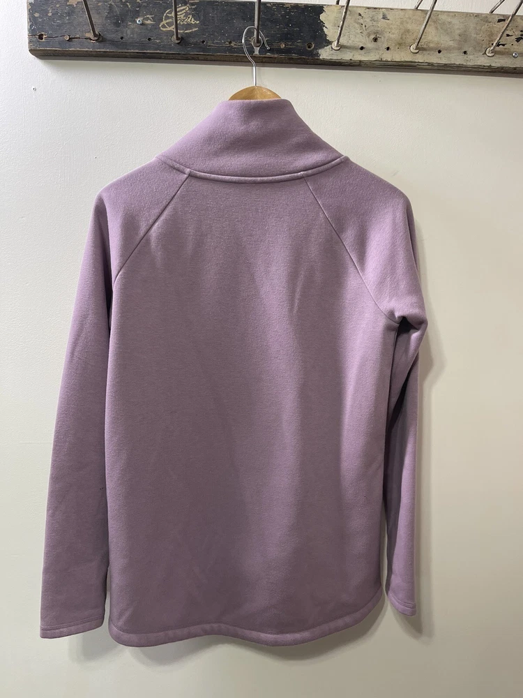 Absolutely love this cozy lavender pullover! The fleece is super soft and comfy, perfect for lounging or running errands. The spot mentioned is barely noticeable, and the fit is just right—super flattering. Great preowned find from a smoke-free home, totally worth it for the price!