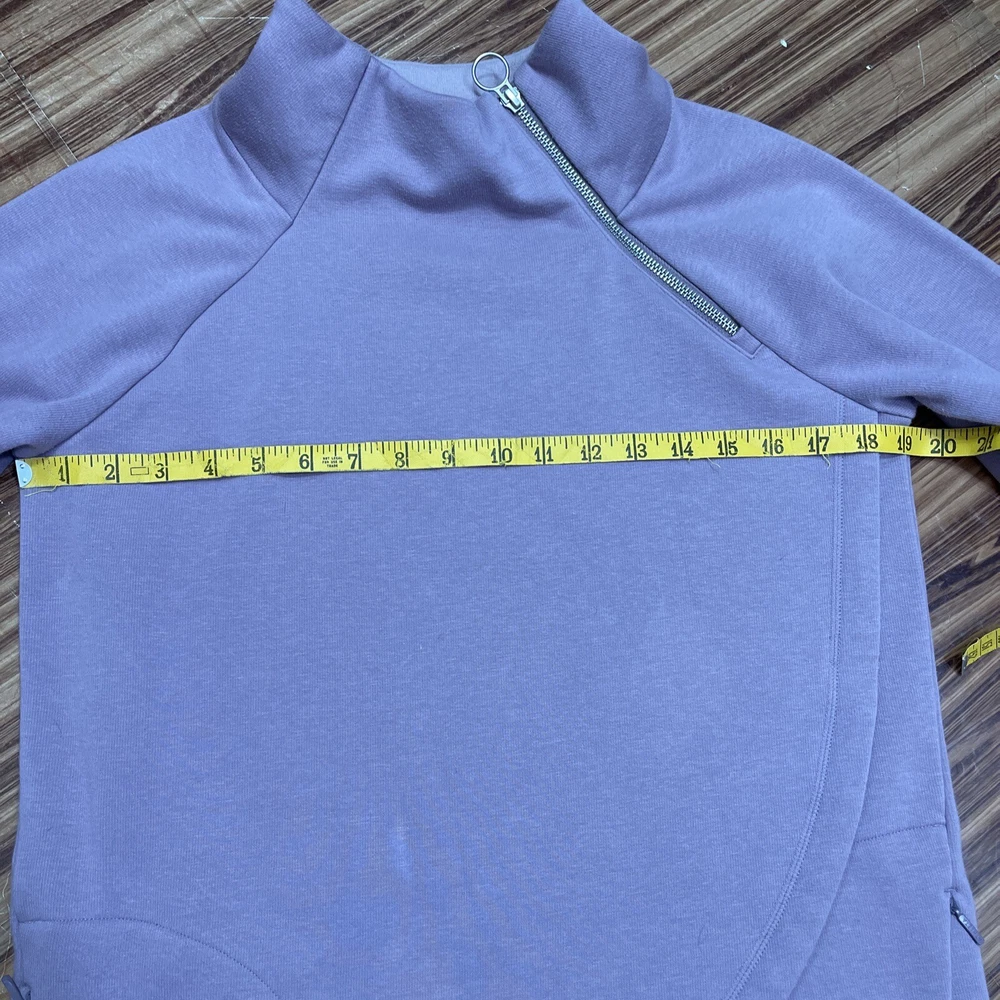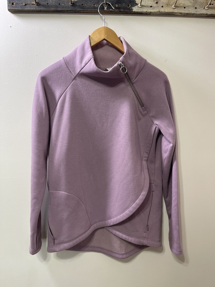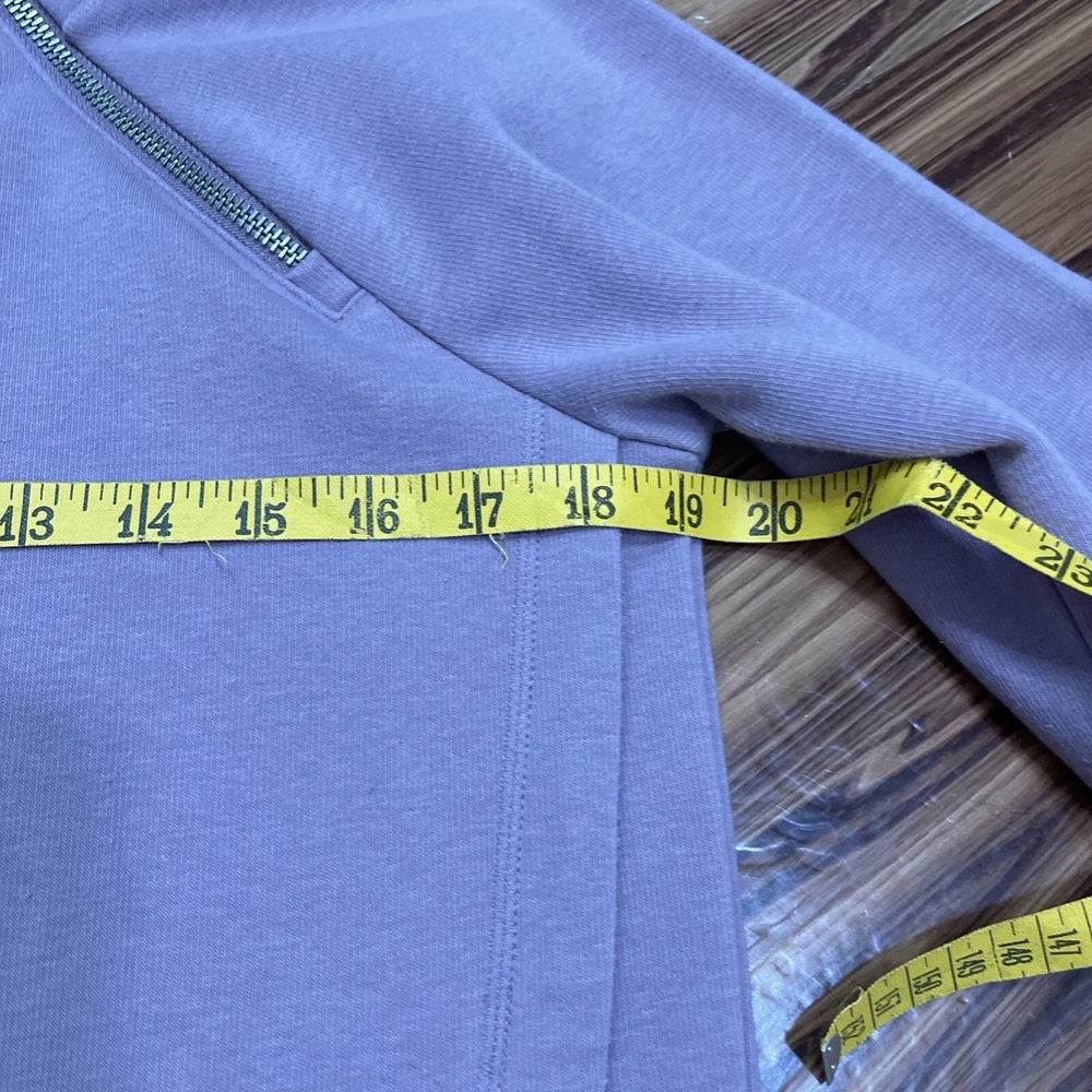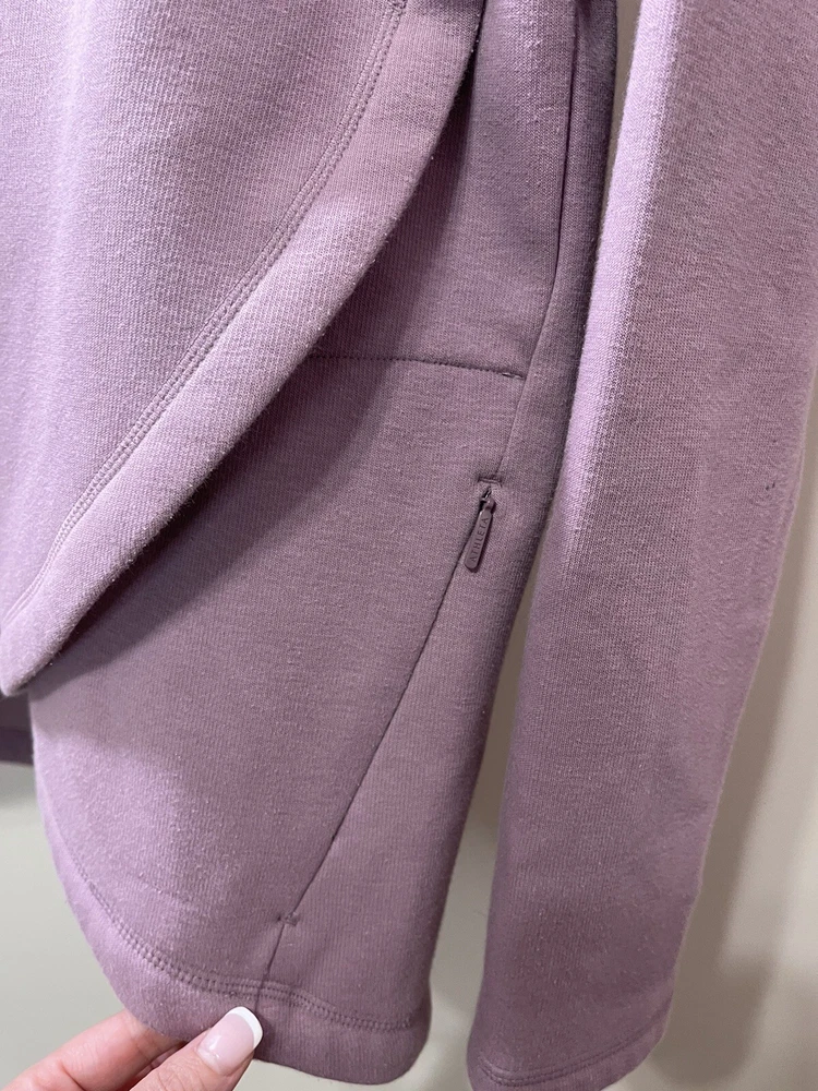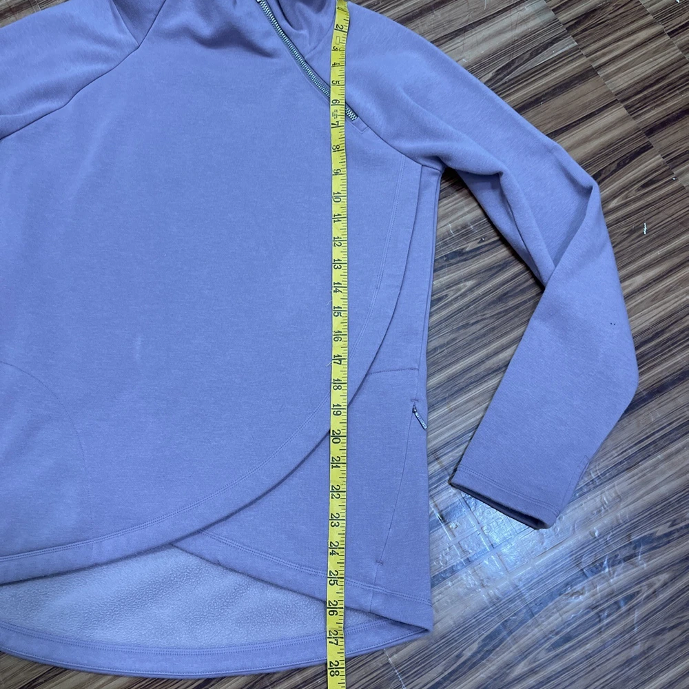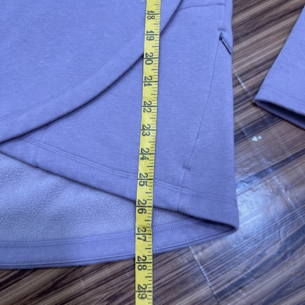 Absolutely love this cozy lavender pullover! The fleece is super soft and comfy, perfect for lounging or running errands. The spot mentioned is barely noticeable, and the fit is just right—super flattering. Great preowned find from a smoke-free home, totally worth it for the price!
