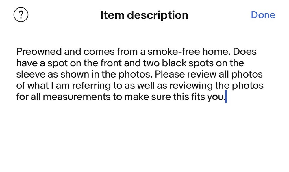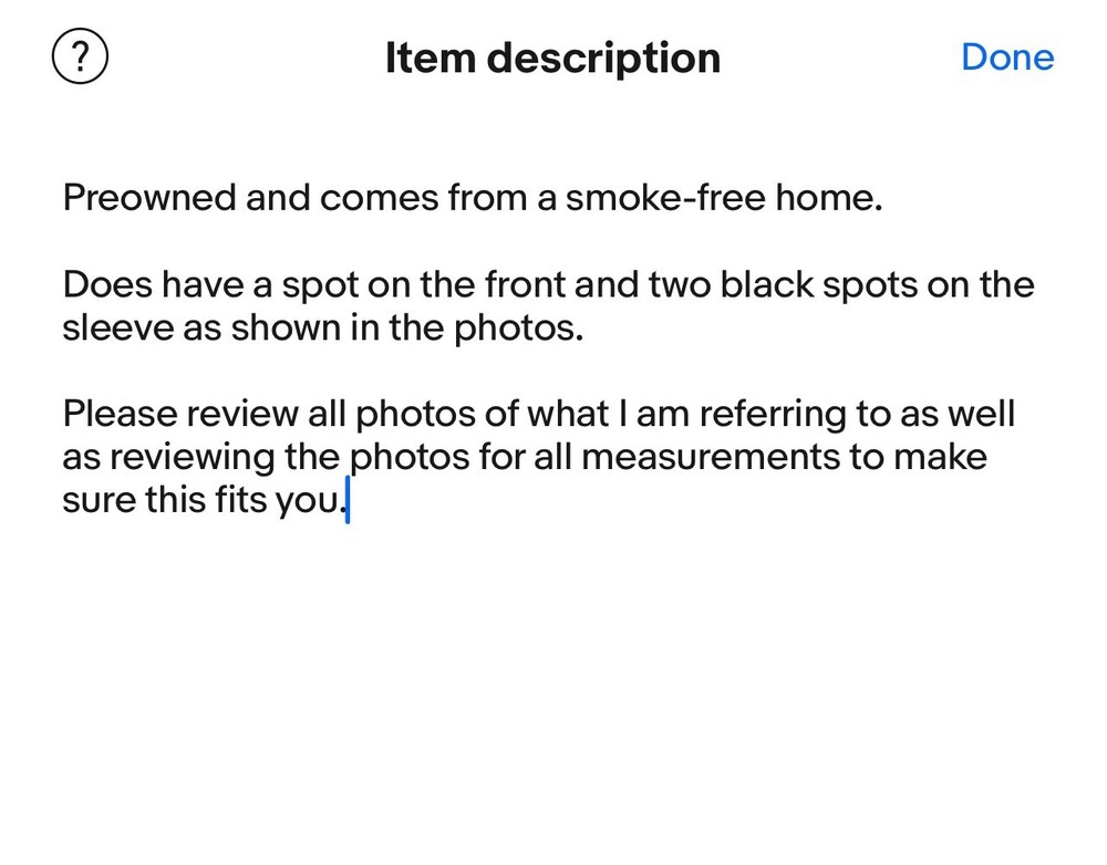 Preowned and comes from a smoke-free home. Does have a spot on the front and two black spots on the sleeve as shown in the photos. Please review all photos of what I am referring to as well as reviewing the photos for all measurements to make sure this fits you.