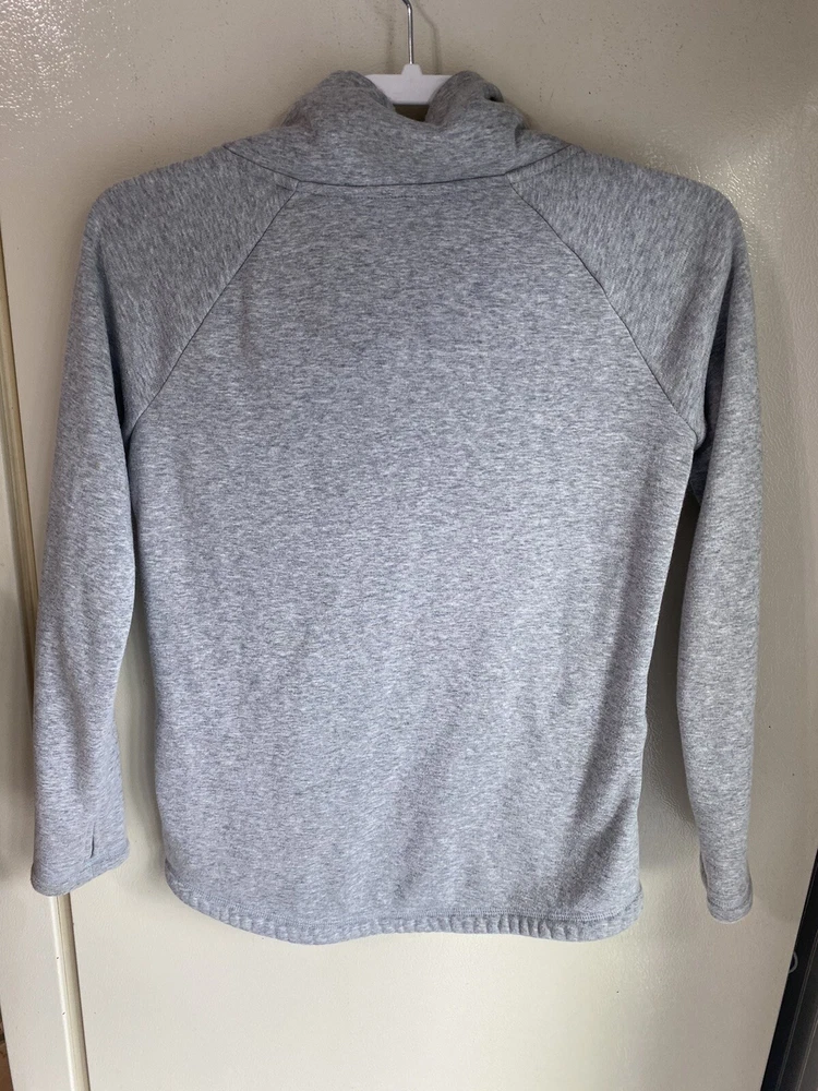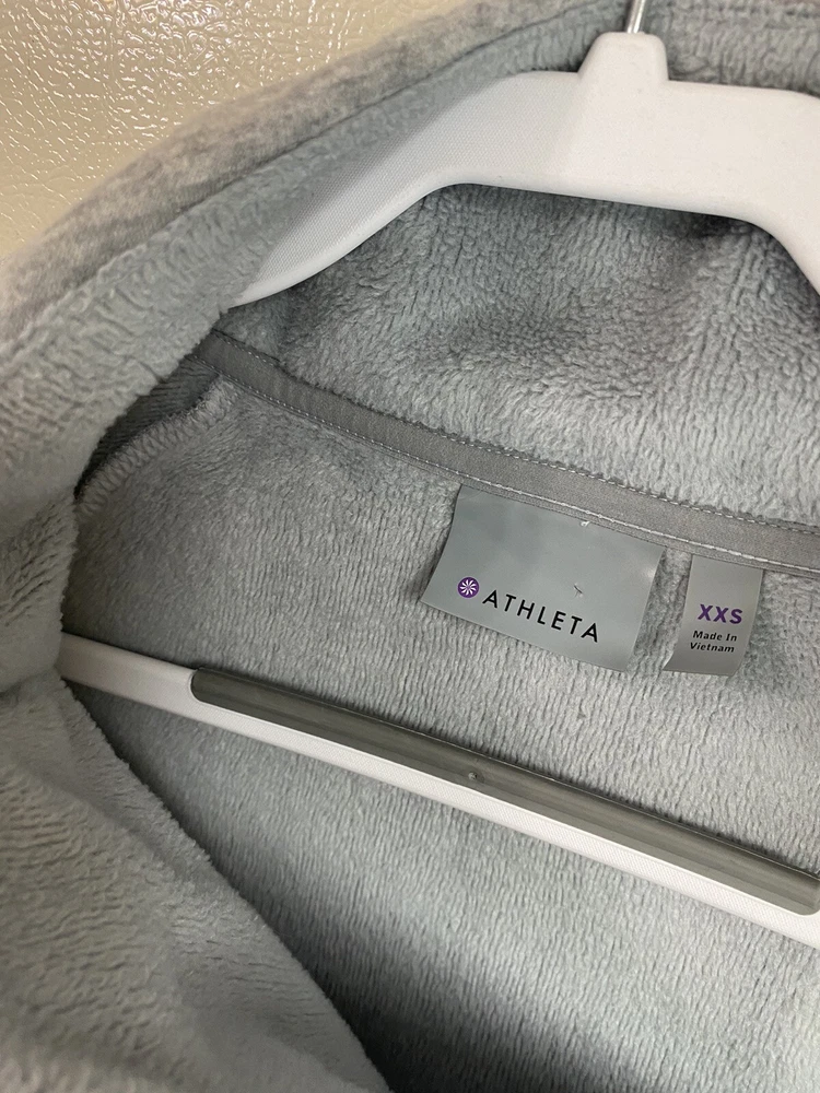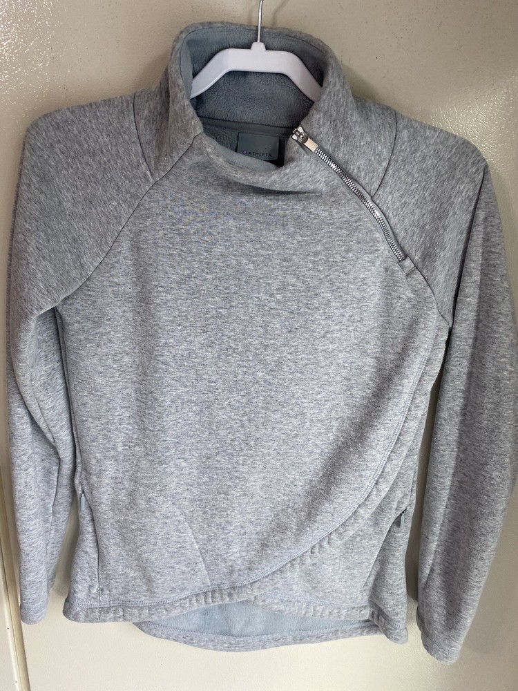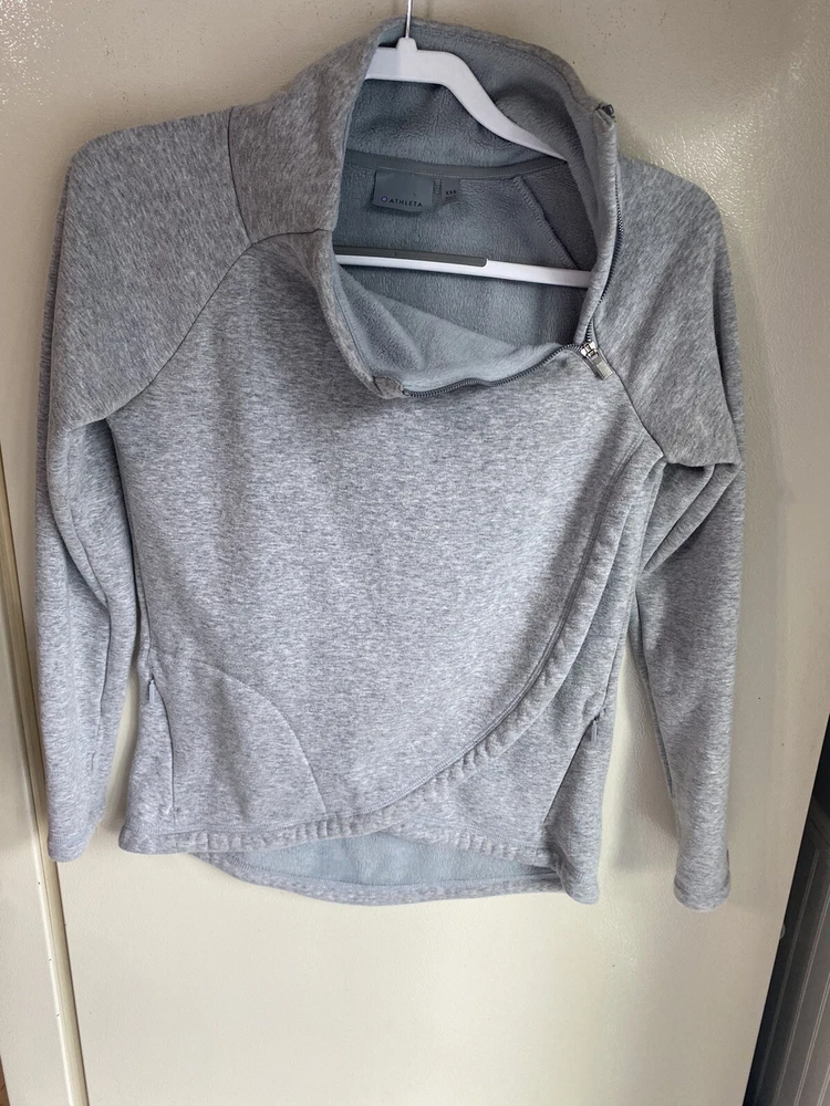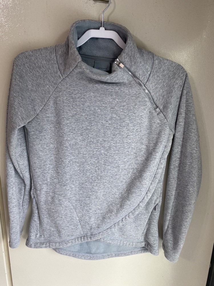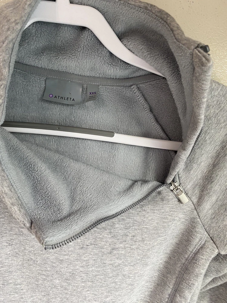 Get ready for the ultimate comfort and style with this Athleta Women's Crazy Cozy Wrap. This pullover sweatshirt comes in a beautiful gray color and features a mock neck, long sleeves with thumb holes, and a convenient zipper pocket. It's made with high-quality materials including polyester, spandex, and cotton, making it perfect for any season whether it's winter, fall, or spring. The sweatshirt also has a wide range of features including easy care, stretch, and additional pockets that make it perfect for activities like gym and training, walking, cross-training, track and field, and running and jogging. It's a classic and sporty addition to any wardrobe and is available in size 2XS. The Athleta Women's Crazy Cozy Wrap is part of the Athleta product line and perfect for anyone looking for a comfortable and stylish sweatshirt without mentioning its condition.e-34