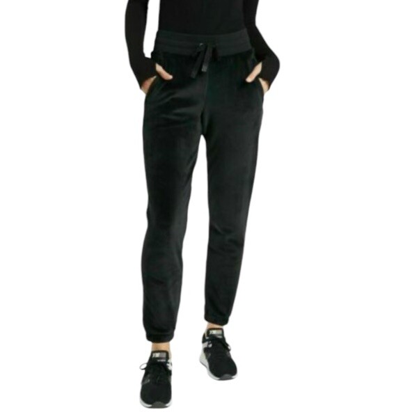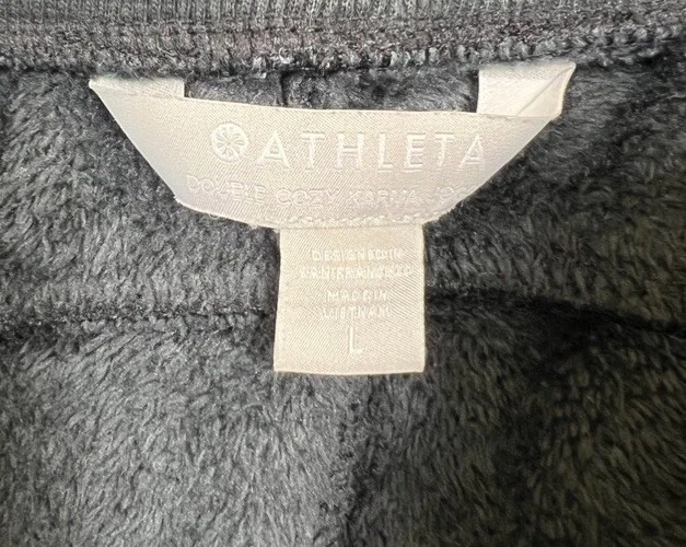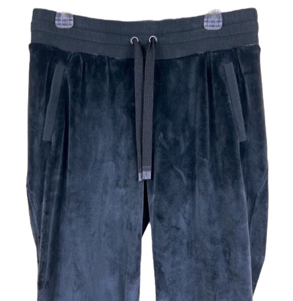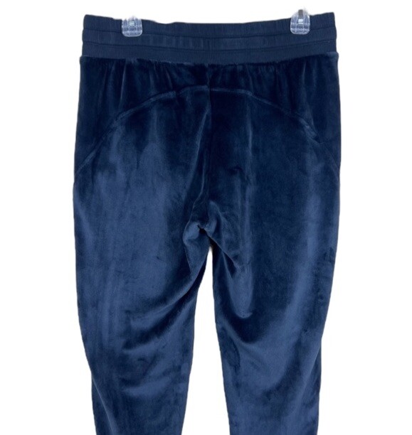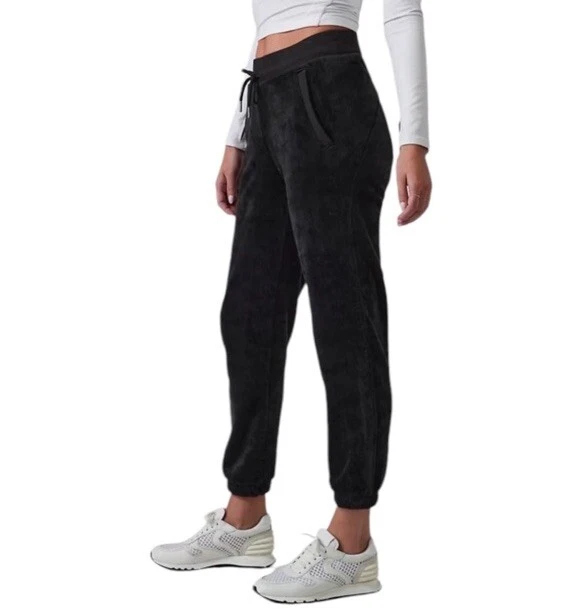 Athleta Double Cozy Karma Velour Recover Jogger Women’s Large Black Layering up to and from the gym or just lounging around make these joggers the perfect pant Ultra soft and comfortable 2 front pockets Semi fitted with a mid rise Elastic drawstring waistband 91% polyester, 9% spandex Approximate measurements- •Waist: 33” side seam to seam, doubled •Rise: 12” crotch seam to waistband •Inseam: 26.5” crotch seam to leg hem •Length: 36” waistband to leg hem •Condition: Good pre-owned