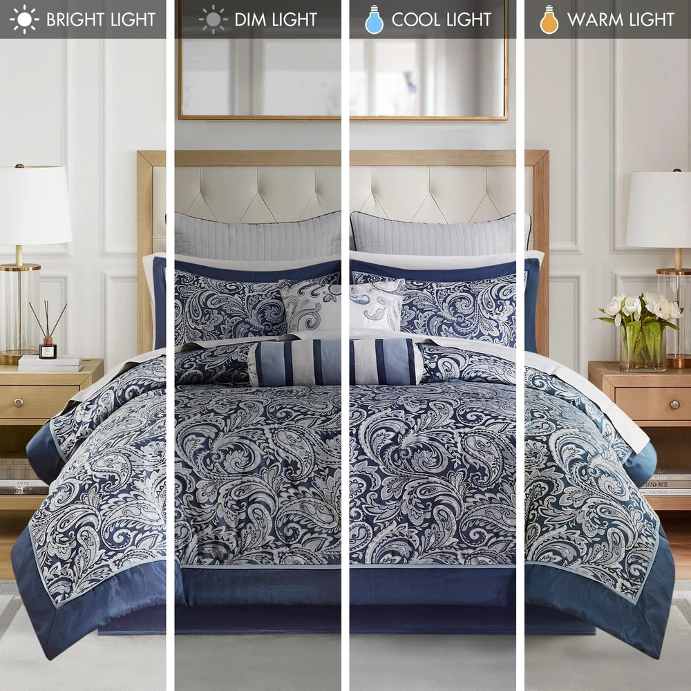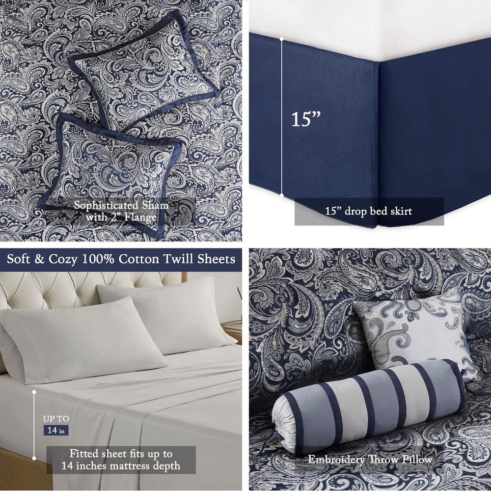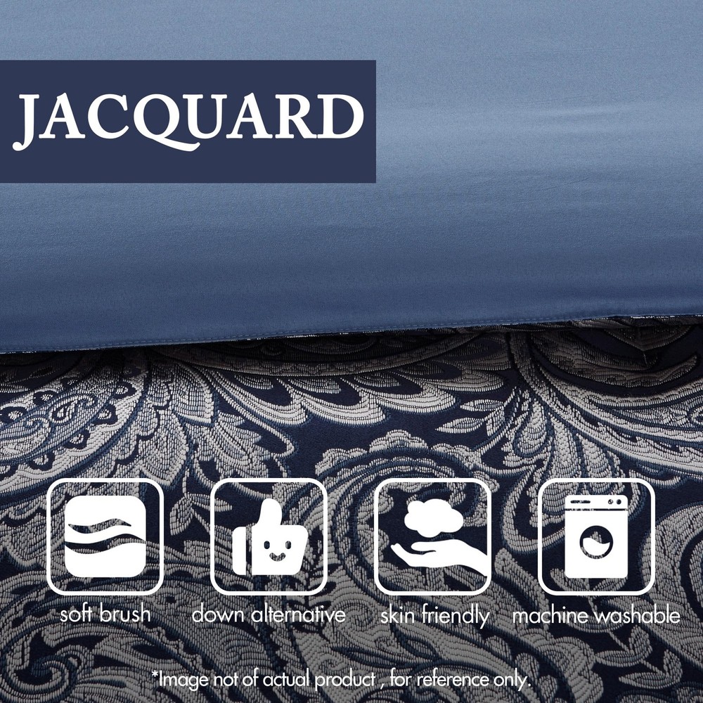 Traditional Bed in a bag comforter set design comes with all bedding essential you need to update your room décor The paisley jacquard weave is woven into a beautiful combination of navy, dusty medium blue, and a hint of silver for a touch of sheen to your bedding Beautiful faux silk fabric is not only giving a natural sheen finish, but also wrinkle resistant and colorfast. Paired with a soft 100% cotton sheet set in complementing color to complete the design Set includes: 1 Comforter:106"W x 92"L, 2 King Shams:20"W x 36"L, 1 Bedskirt:78"W x 80"L plus 15"D, 2 Dec Pillows:18"W x 18"L/6.5"W x 18"L, 2 Euro Shams:26"W x 26"L, 1 Fitted Sheet:78"W x 84"L plus 14"D, 1 Flat Sheet:110"W x 102"L, 2 Pillowcases:20"W x 40"L Care instructions: Machine wash, delicate and separately; Tumble dry low; Spot clean decorative pillows Items in this set may come in rolled or compressed packaging and will need to be fluffed up
