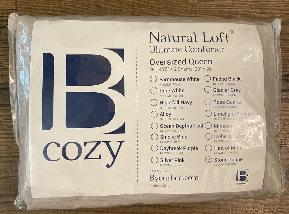 NEW in package. B Cozy Natural Loft Ultimate Duvet Comforter Oversized Queen, 94”x98” 2 shams, 20”x26” Stone Taupe 100% Microfiber 192